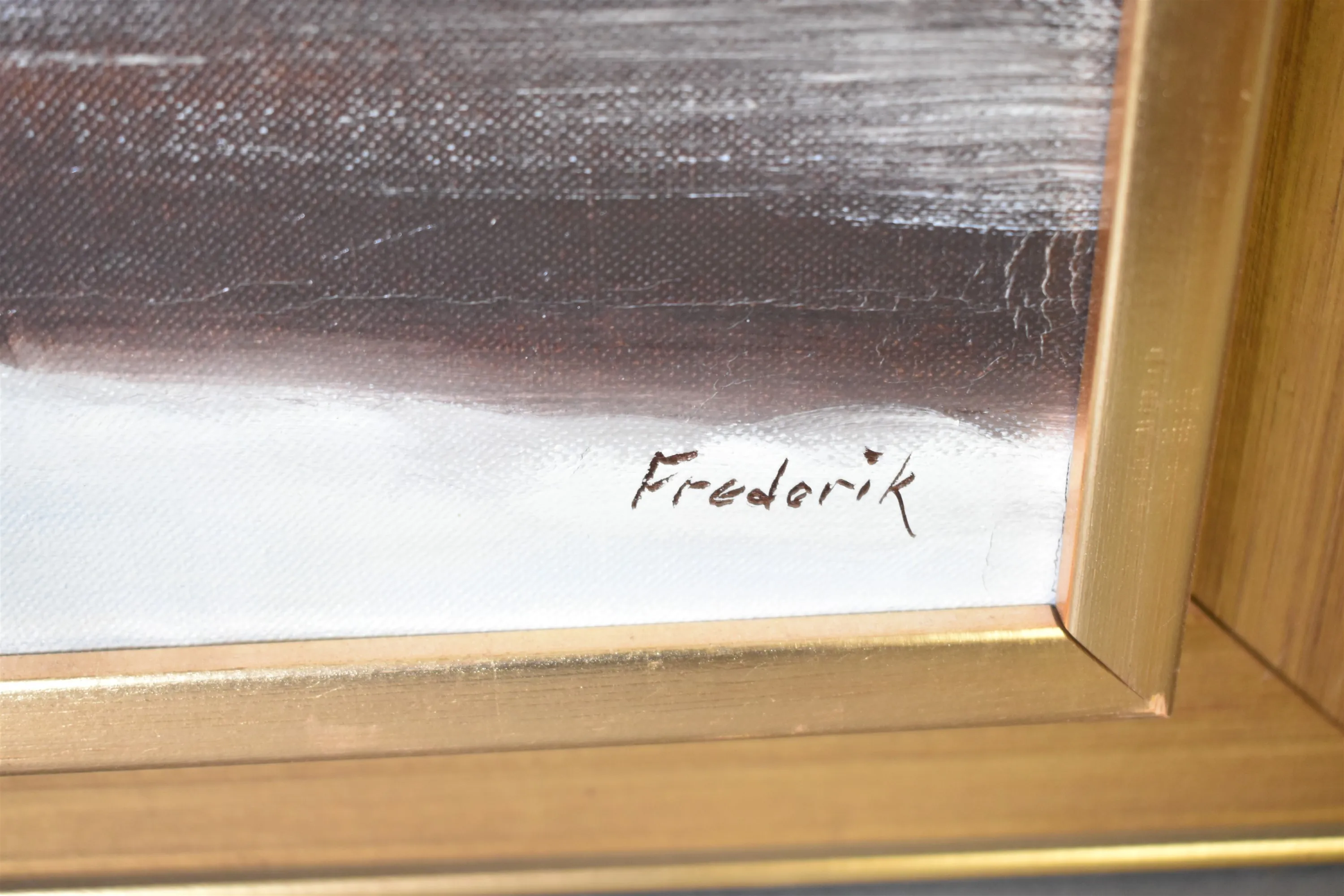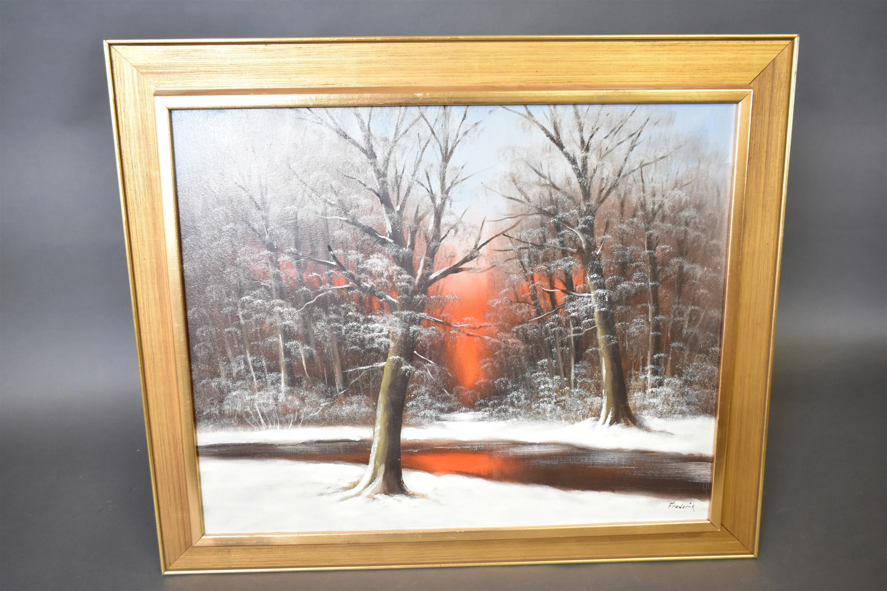 12656. Olja på duk, vinterlandskap, signerad Frederik, yttermått 78x66 cm