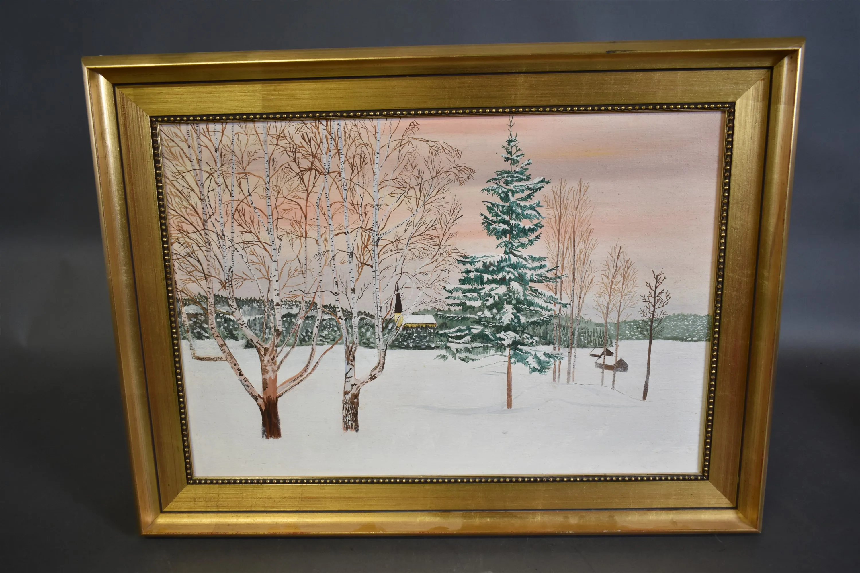 16431. Olja på duk, vinterlandskap, yttermått 79x59 cm