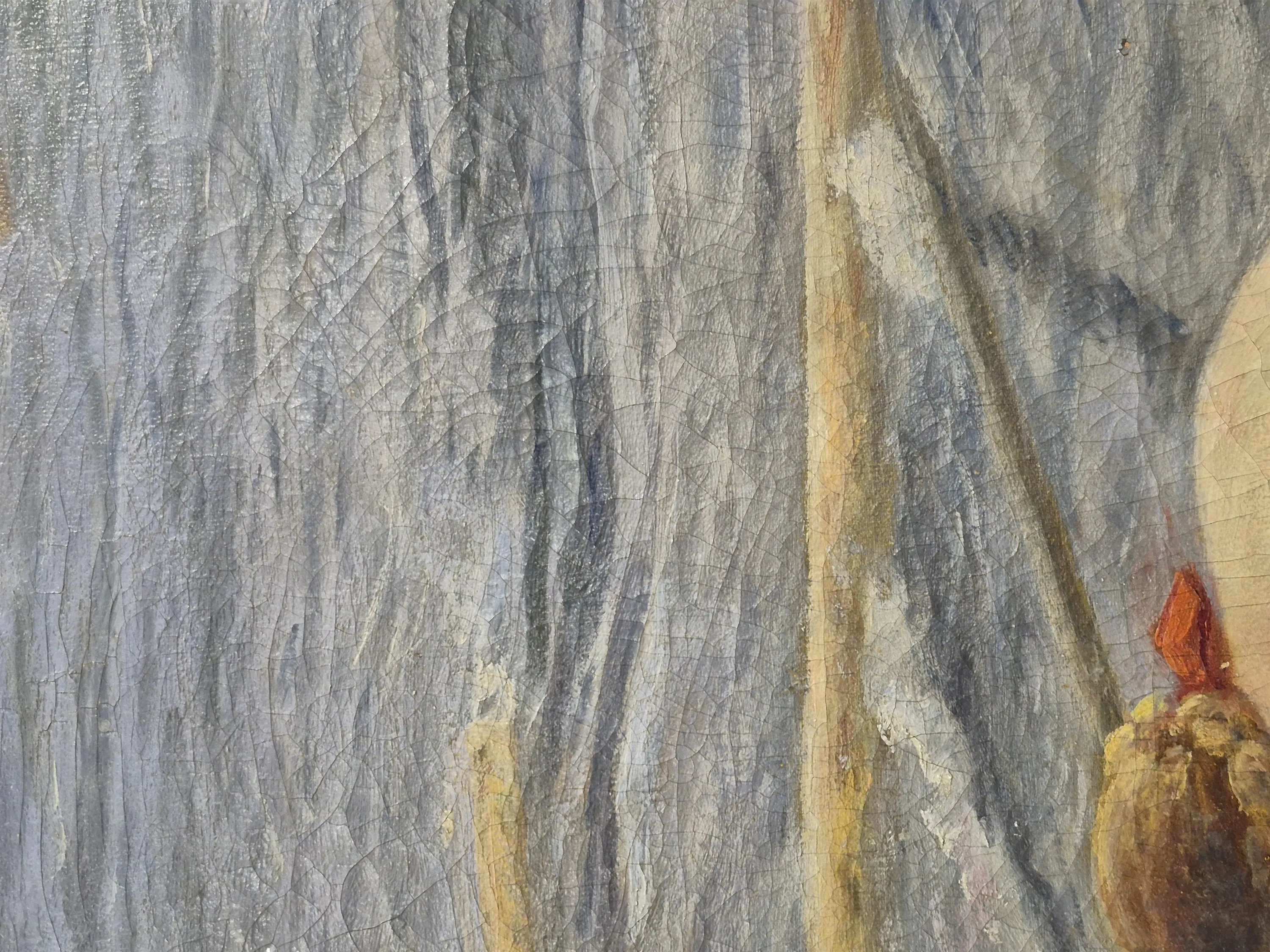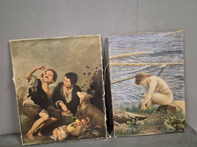 18504. Oljor på duk 2 st, reproduktioner bla Zorn, defekter finns, största mått 62x50 cm