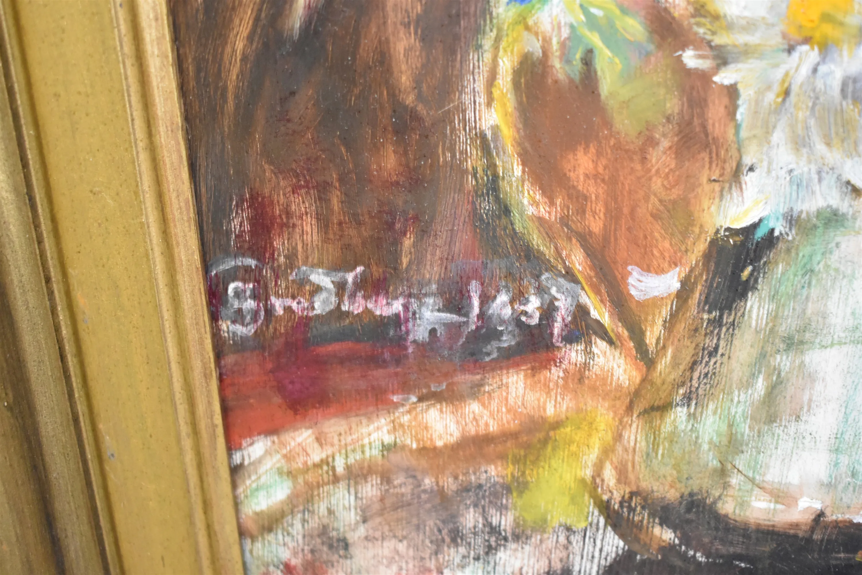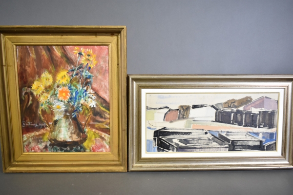 11981. Oljor på pannå 2 st bla stilleben, största mått 57x50 cm