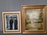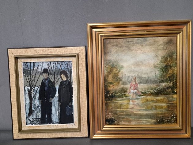 18024. Oljor på duk 2 st bla motiv flicka vid vatten, största mått 61x53 cm
