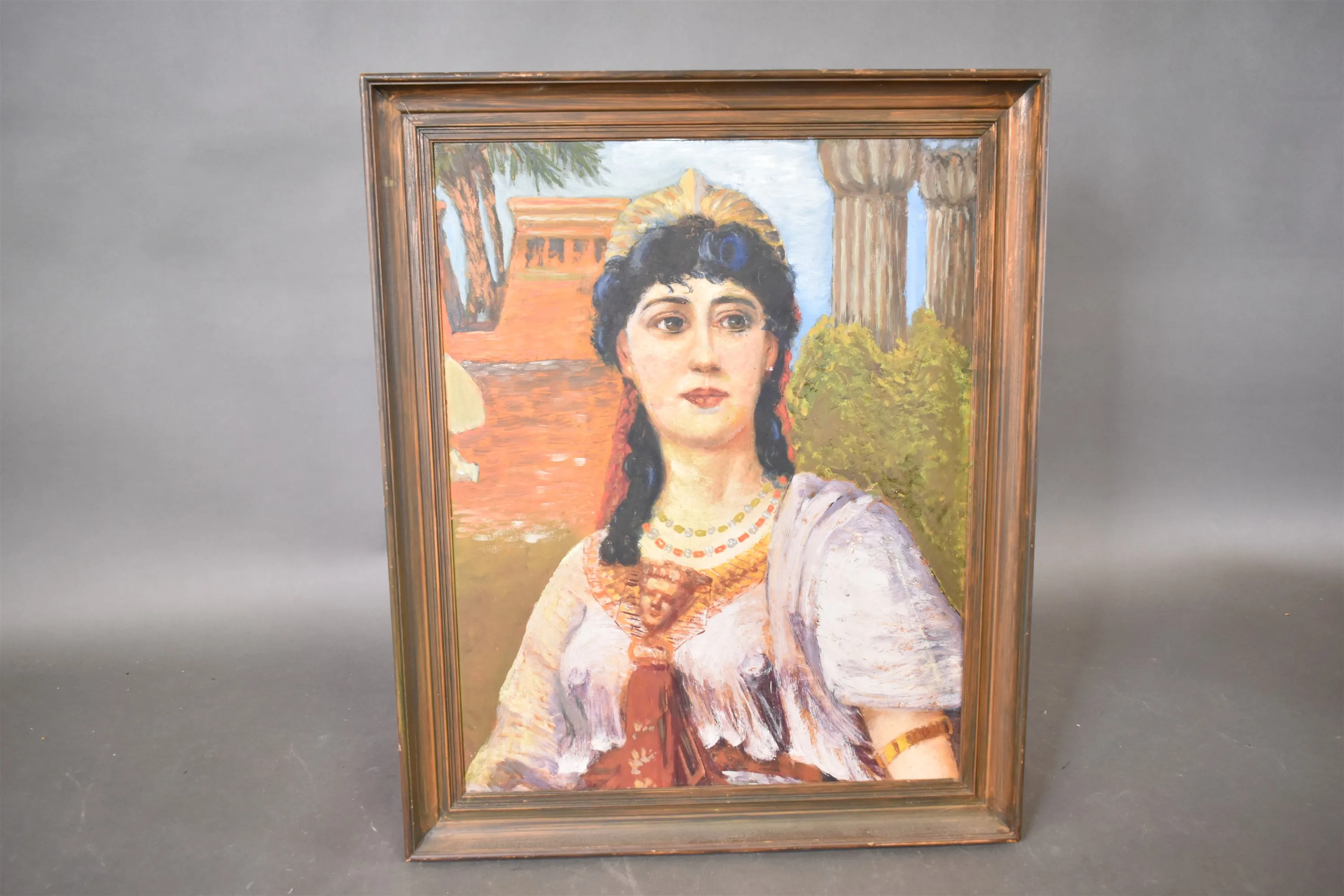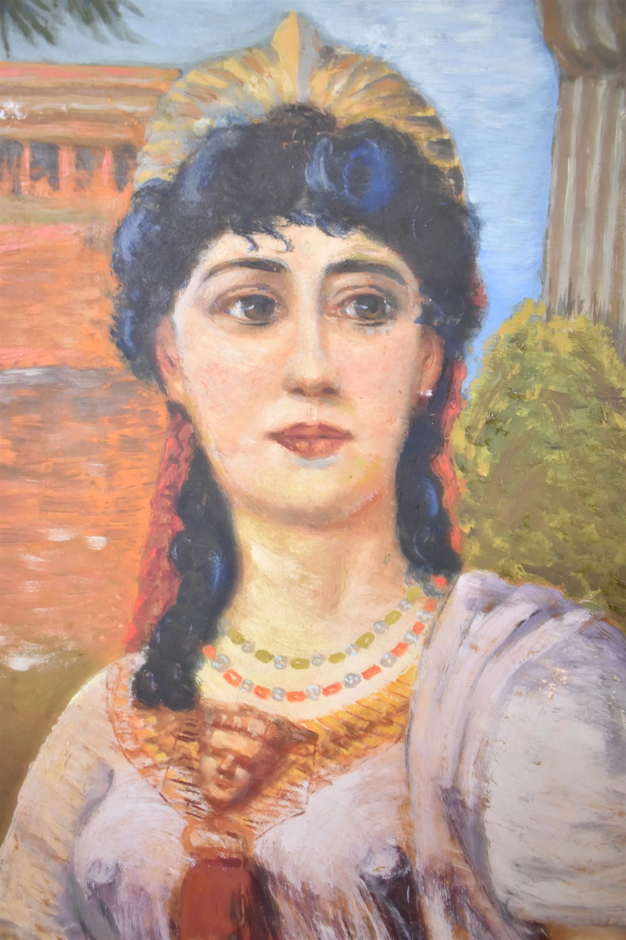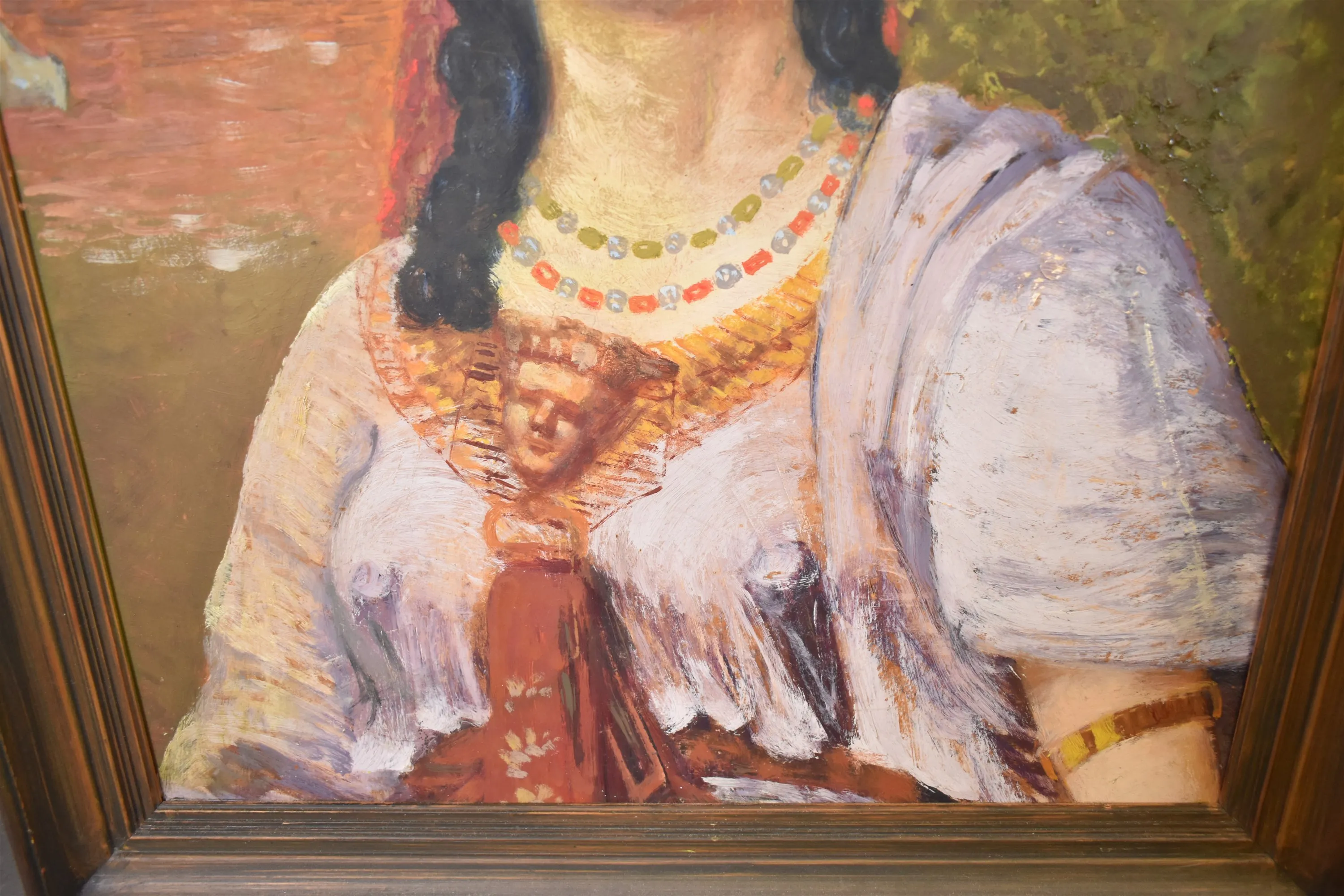 14650. Osignerad olja på pannå, "Sydlänsk kvinna", mått 58 x 71 cm