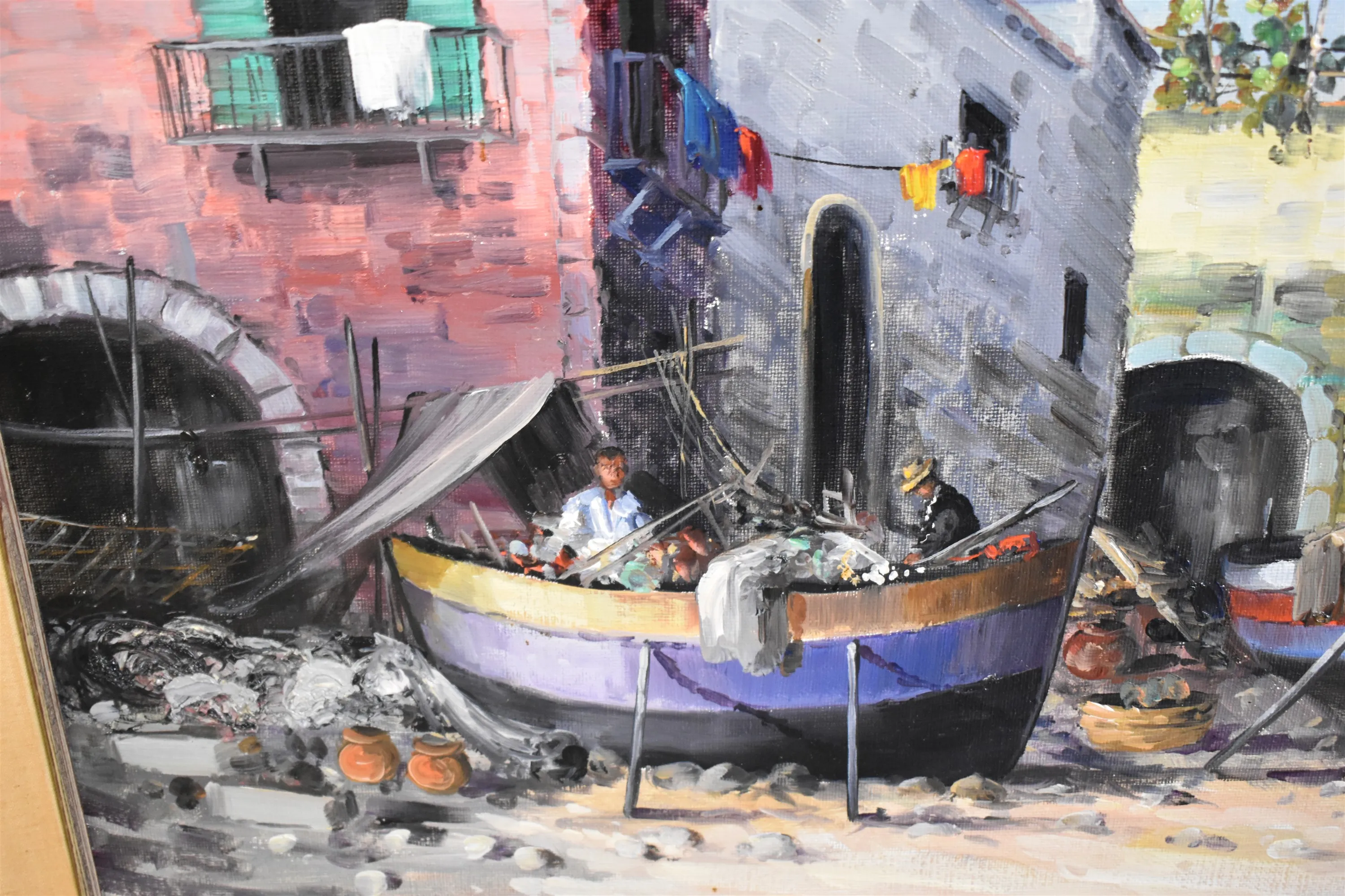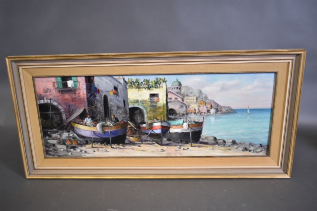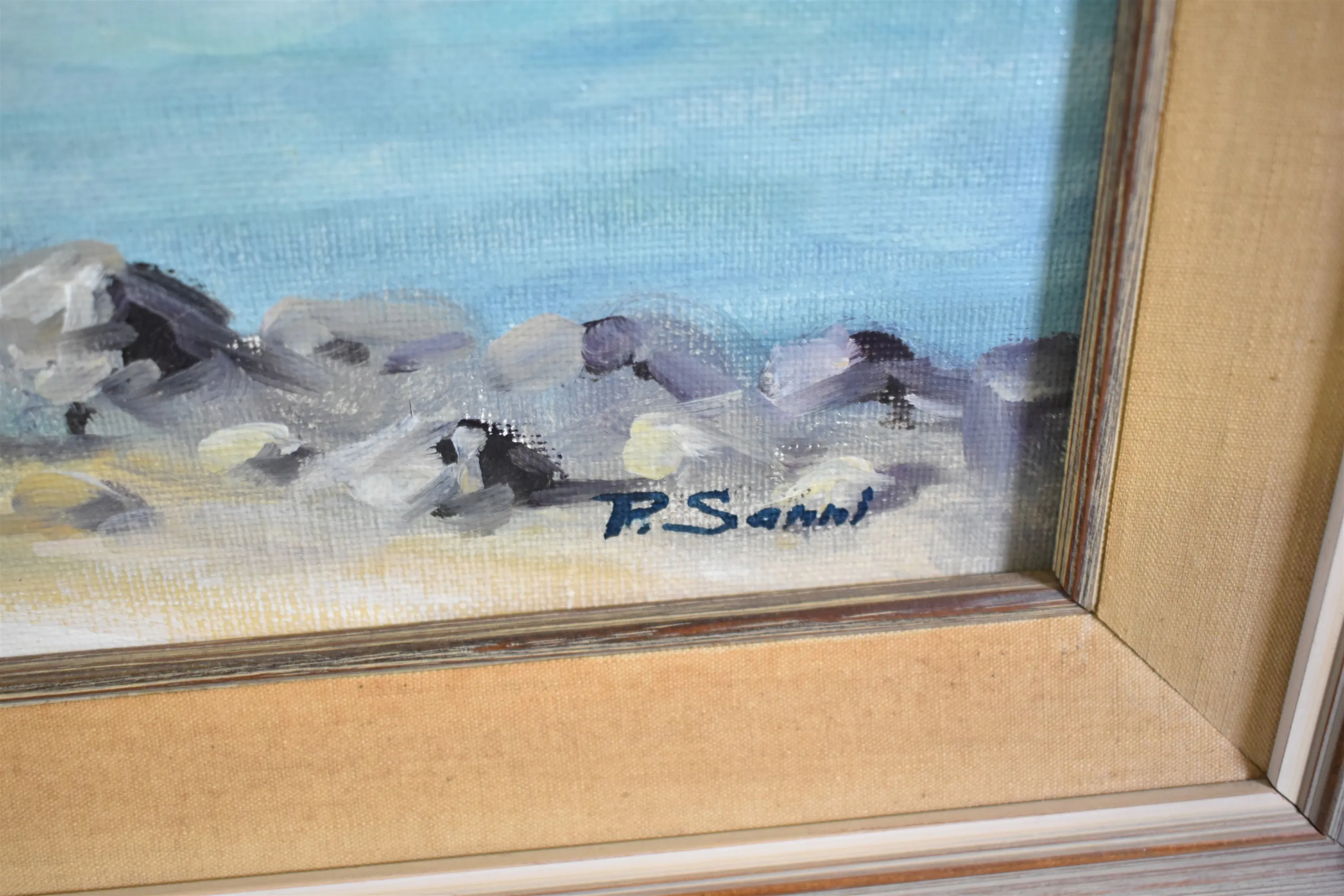 16588. P. Sanni olja på duk, båtar vid strand, yttermått 94x44 cm