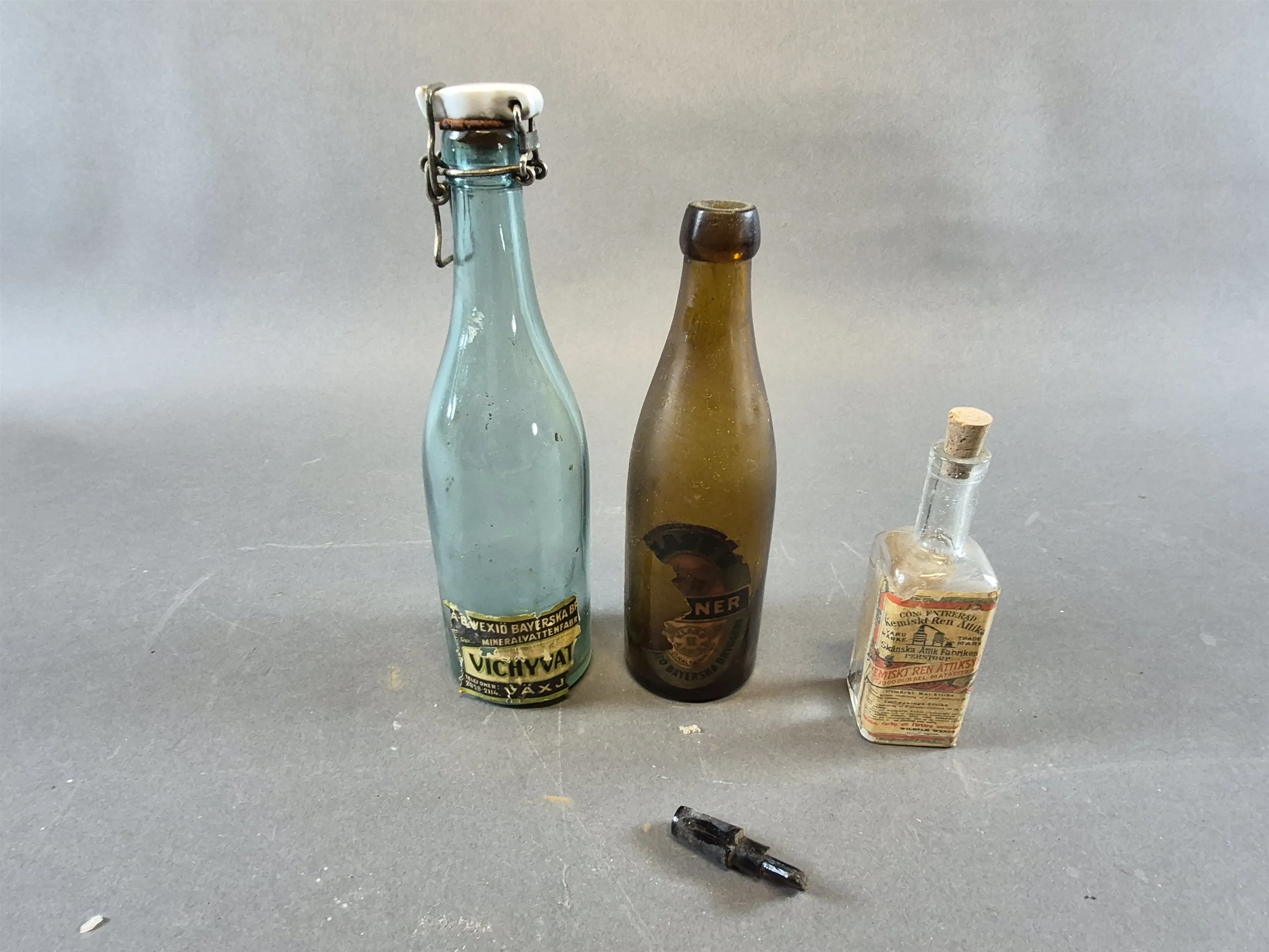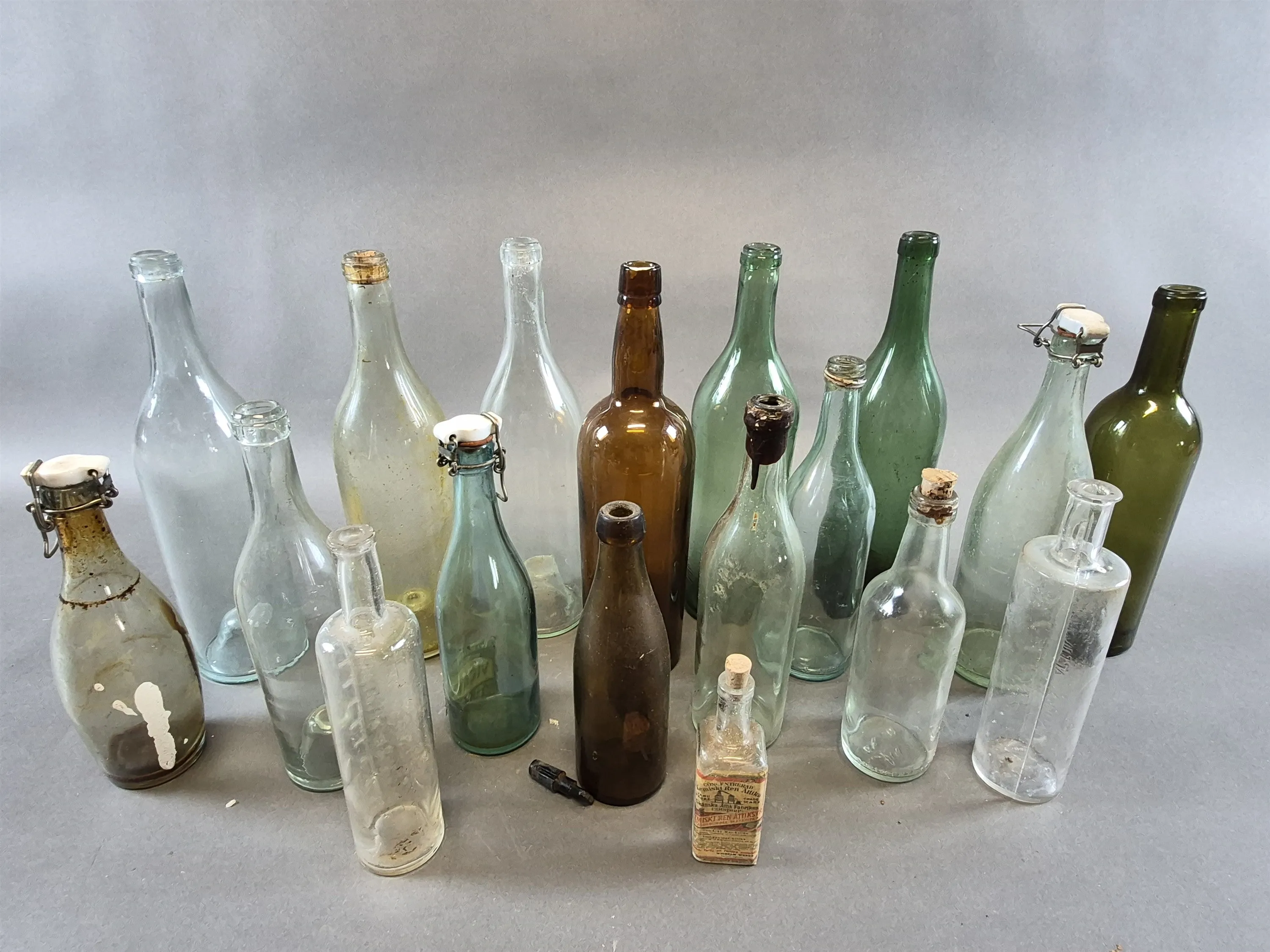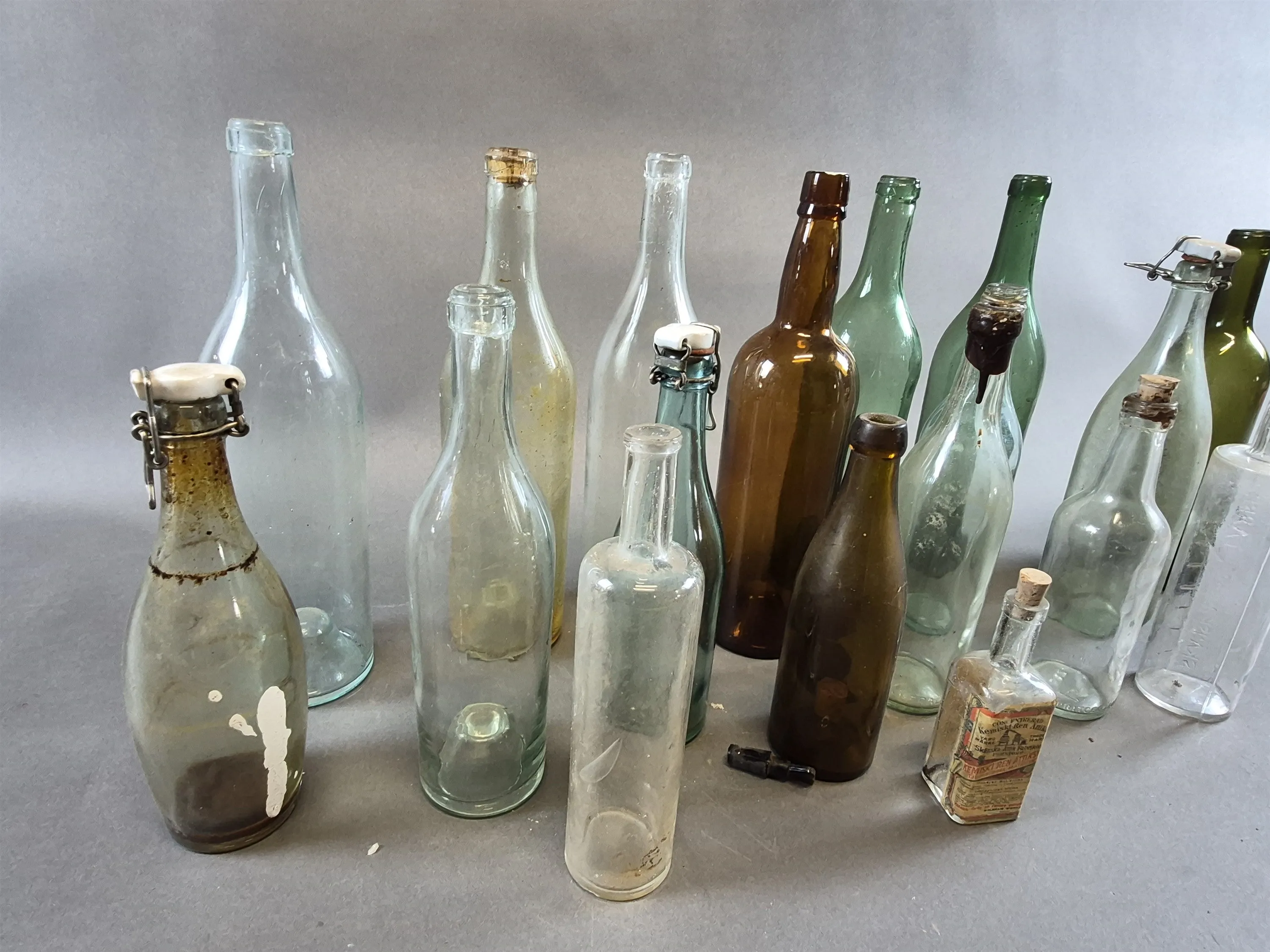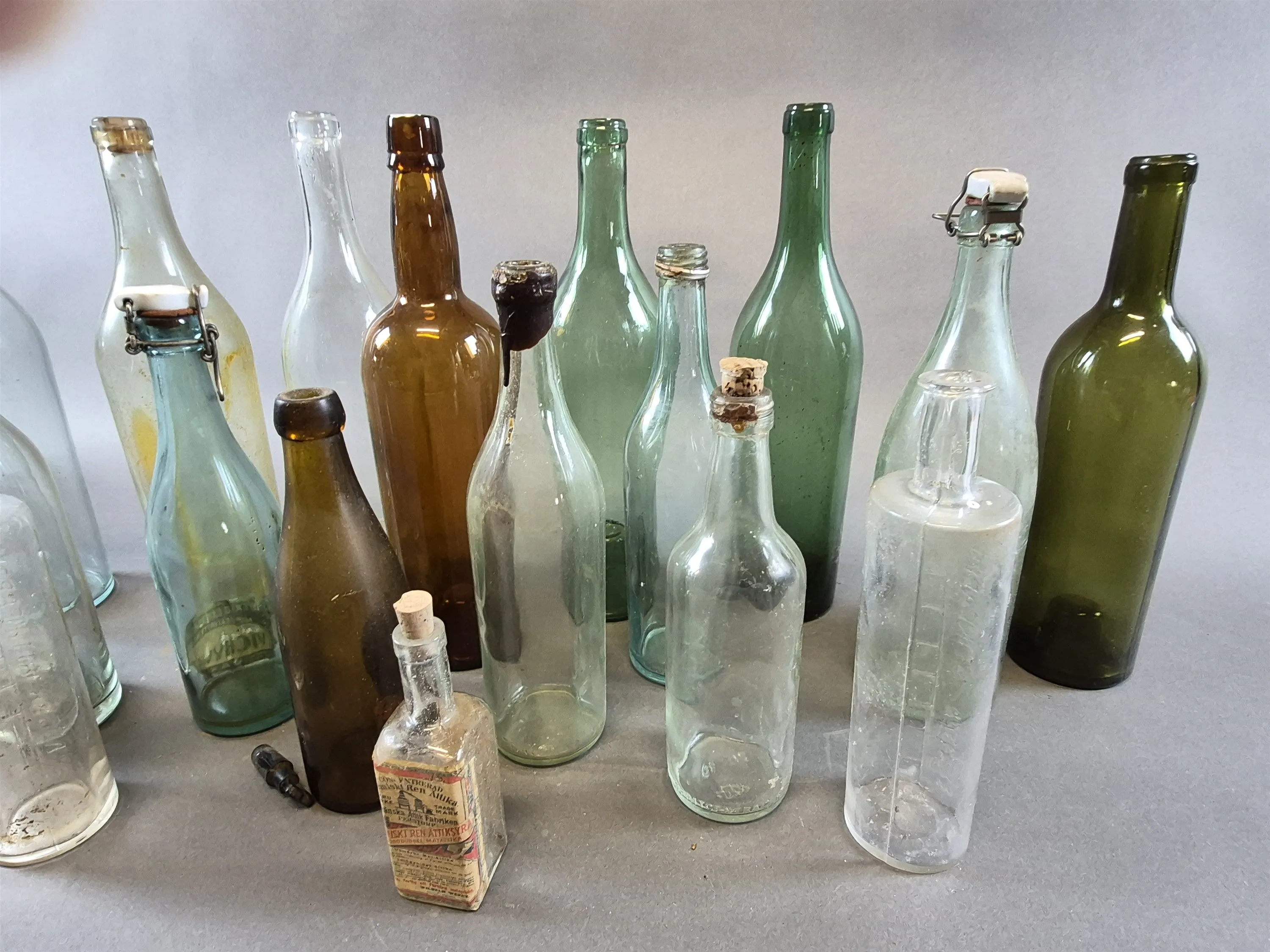 21000. Parti äldre glasflaskor färgade och ofärgade, högsta höjd 33 cm