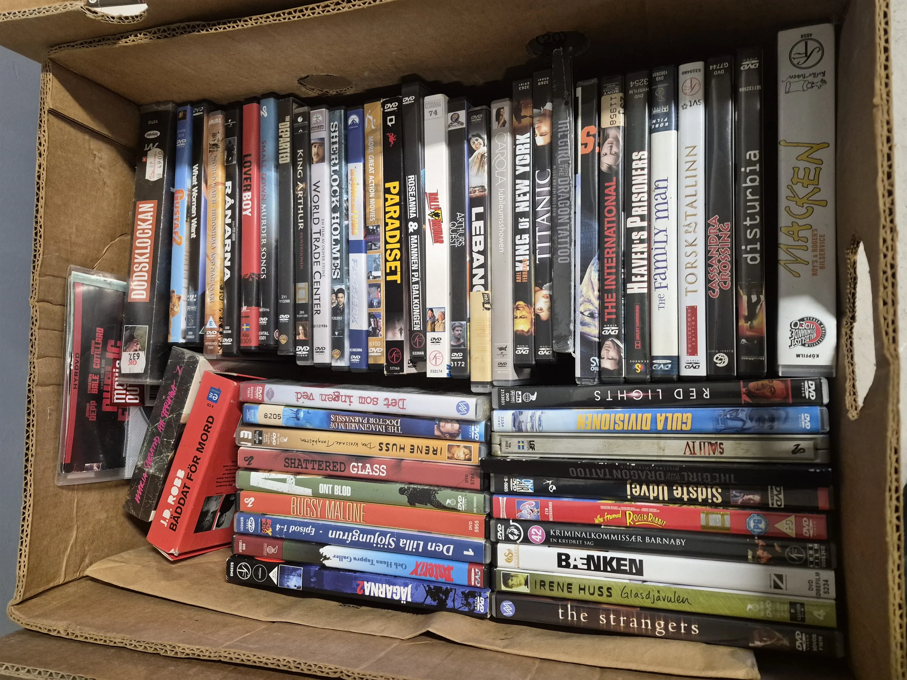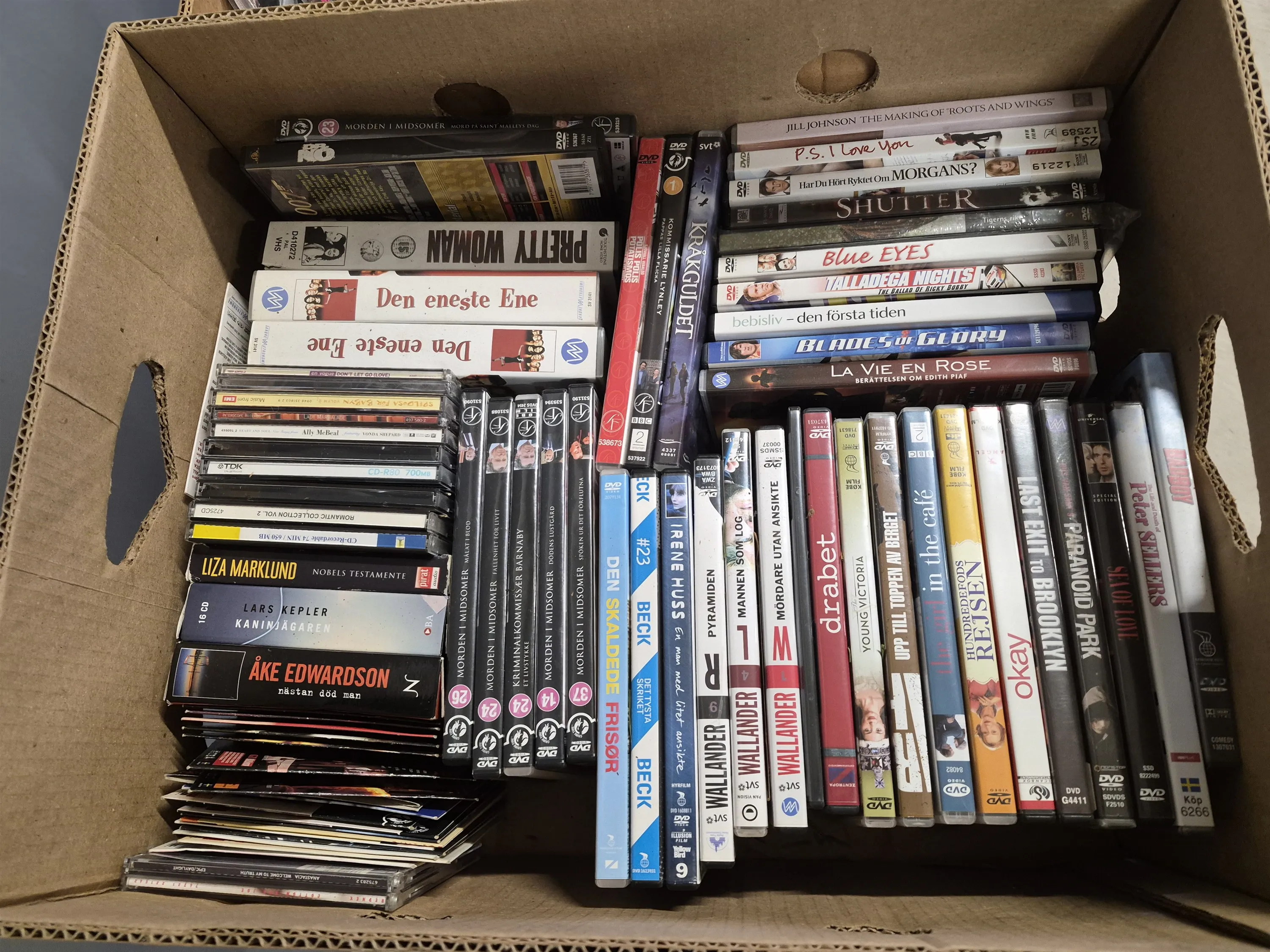 18056. Parti 3 lådor DVD CD & ljudböcker