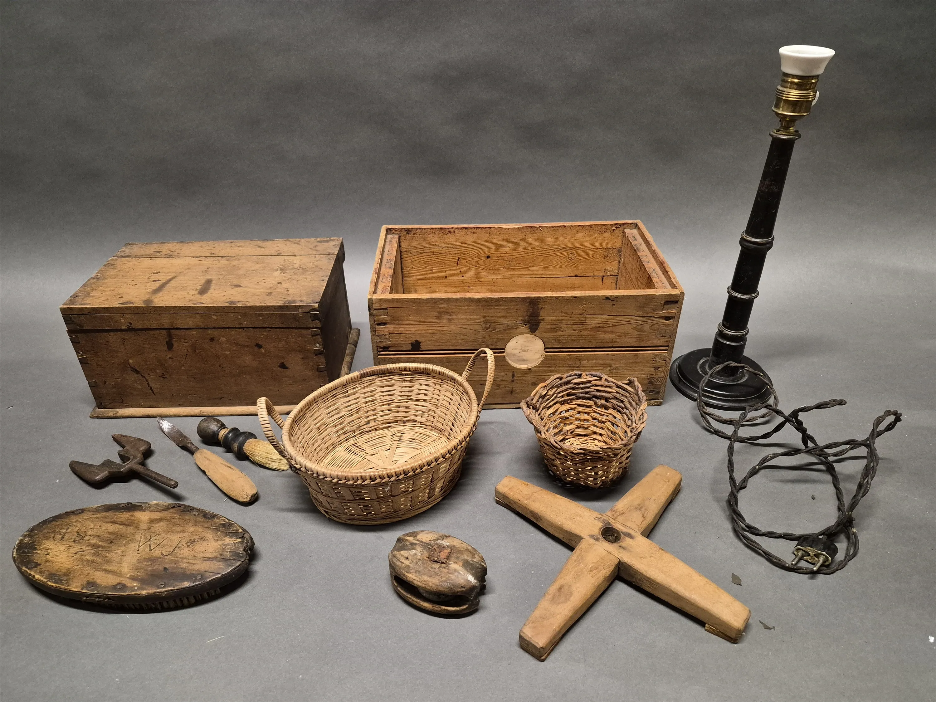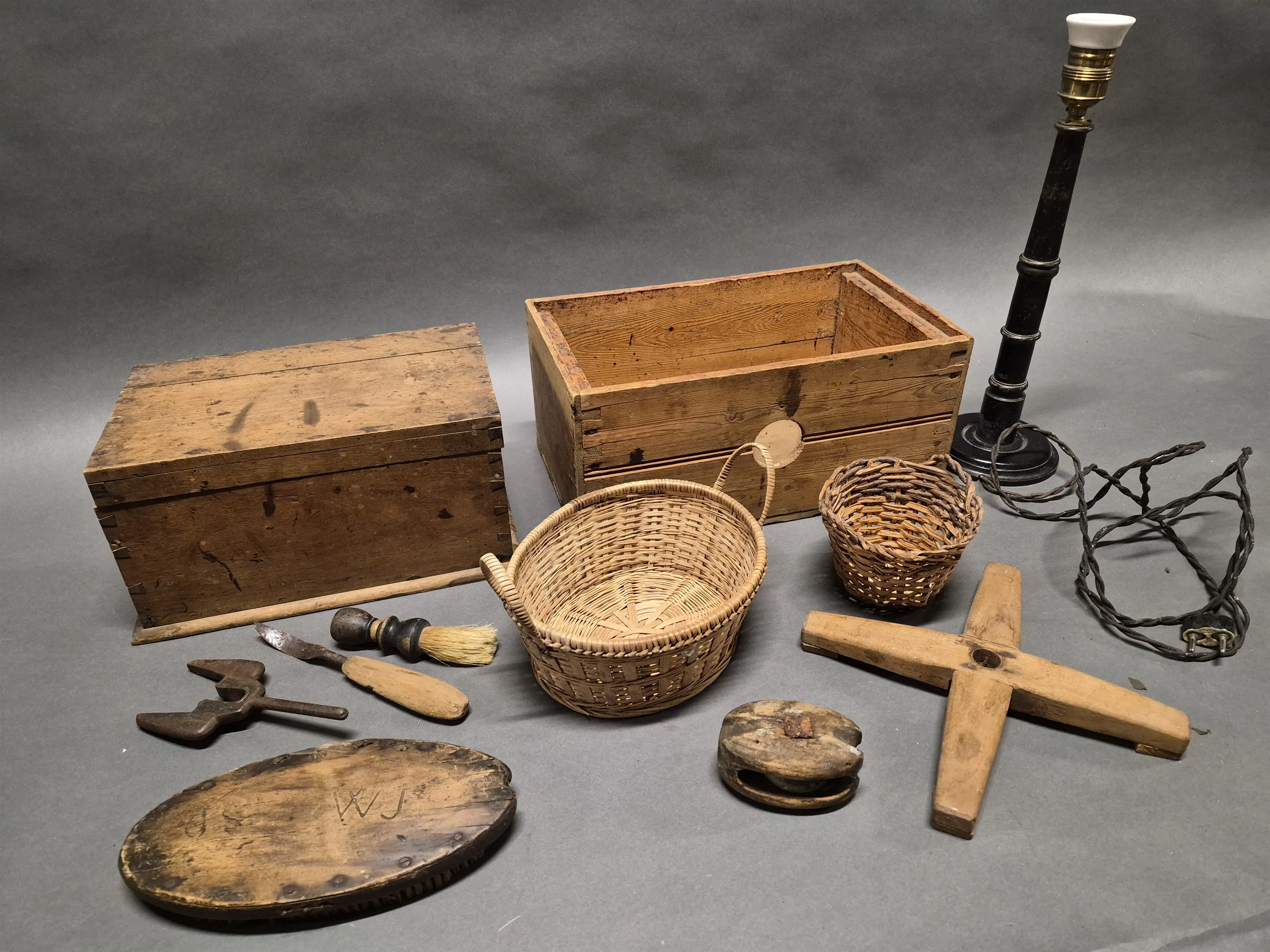 17261. Parti allmogeföremål & bordslampfot högsta 40 cm