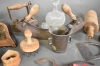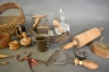 2916. Parti allmogeföremål bla korg och mortel, högsta höjd 32 cm