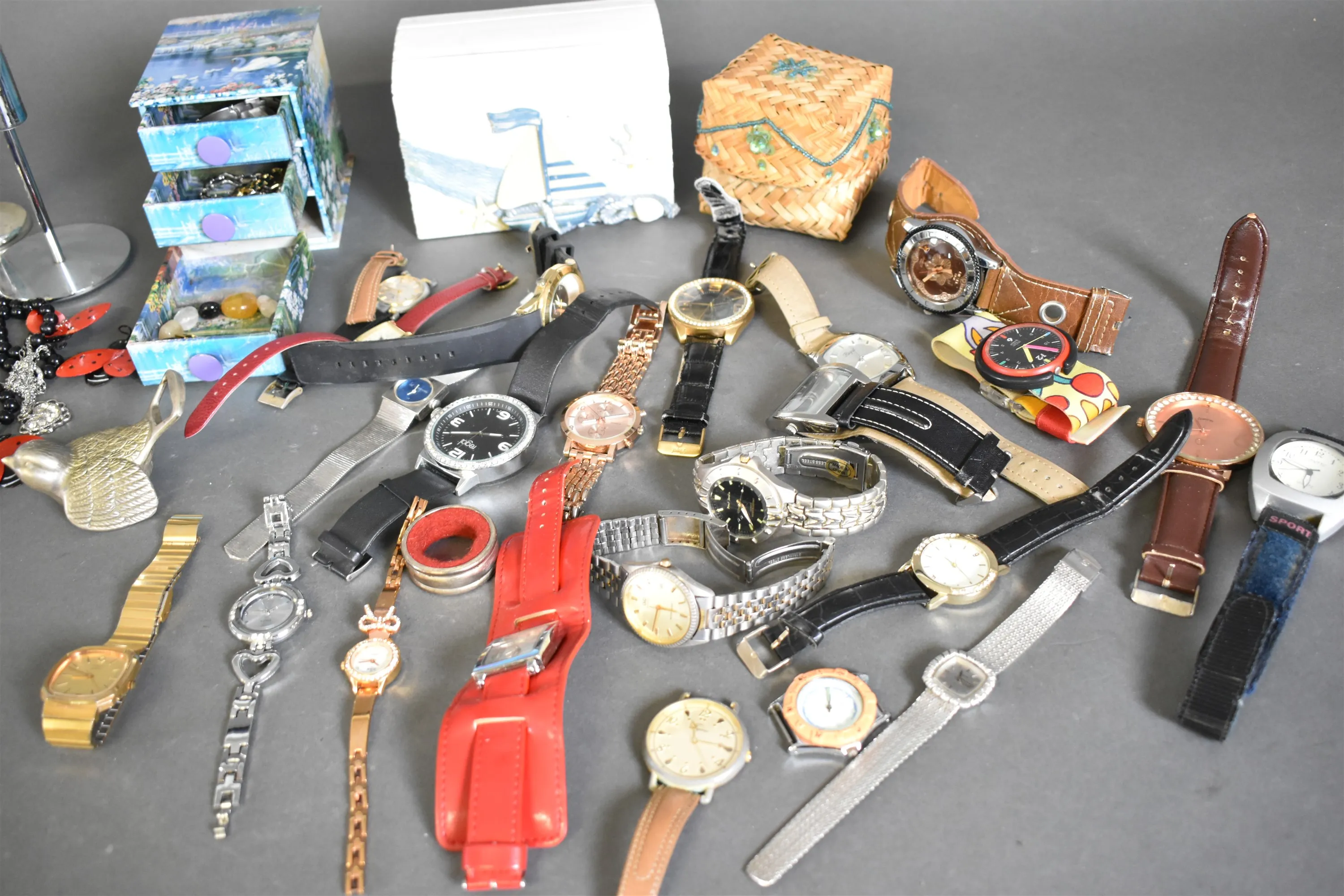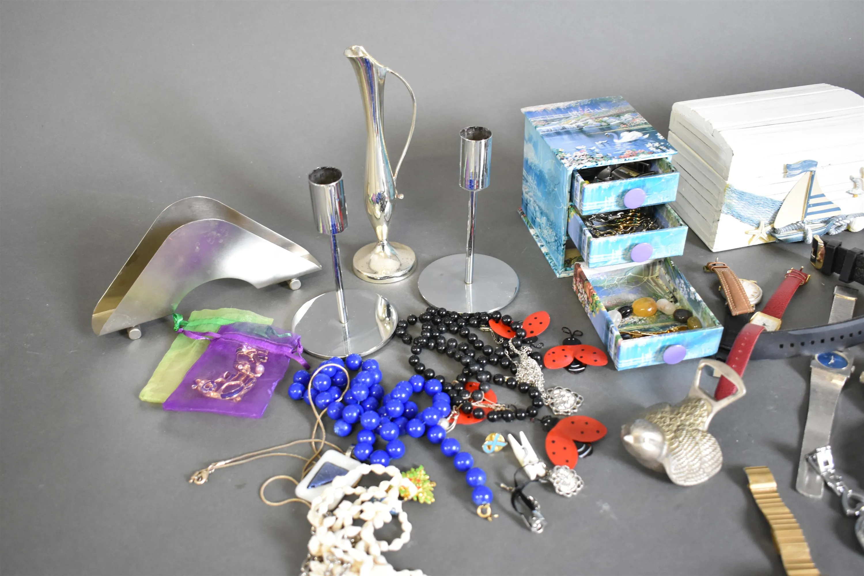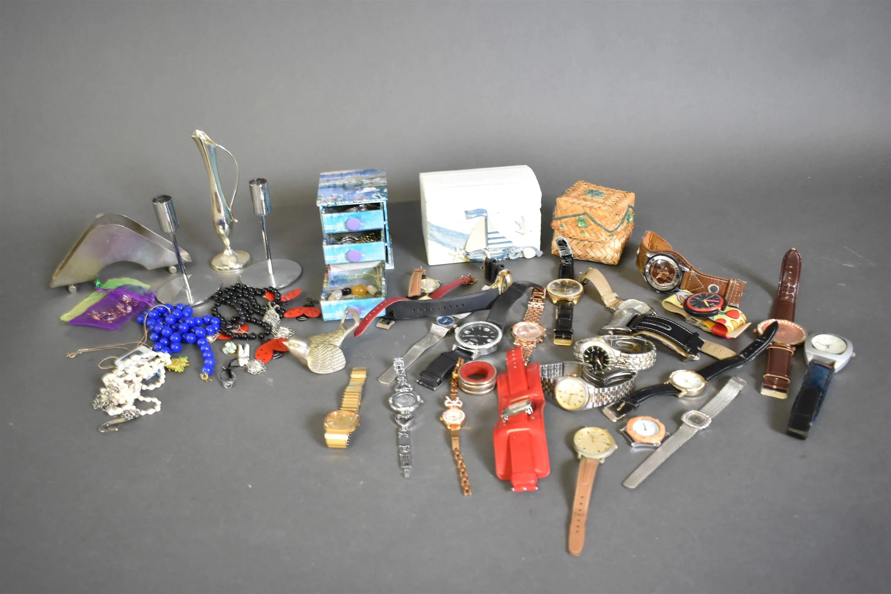 11654. Parti armbandsur, bijouterier och metallföremål, högsta höjd 19 cm