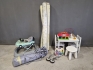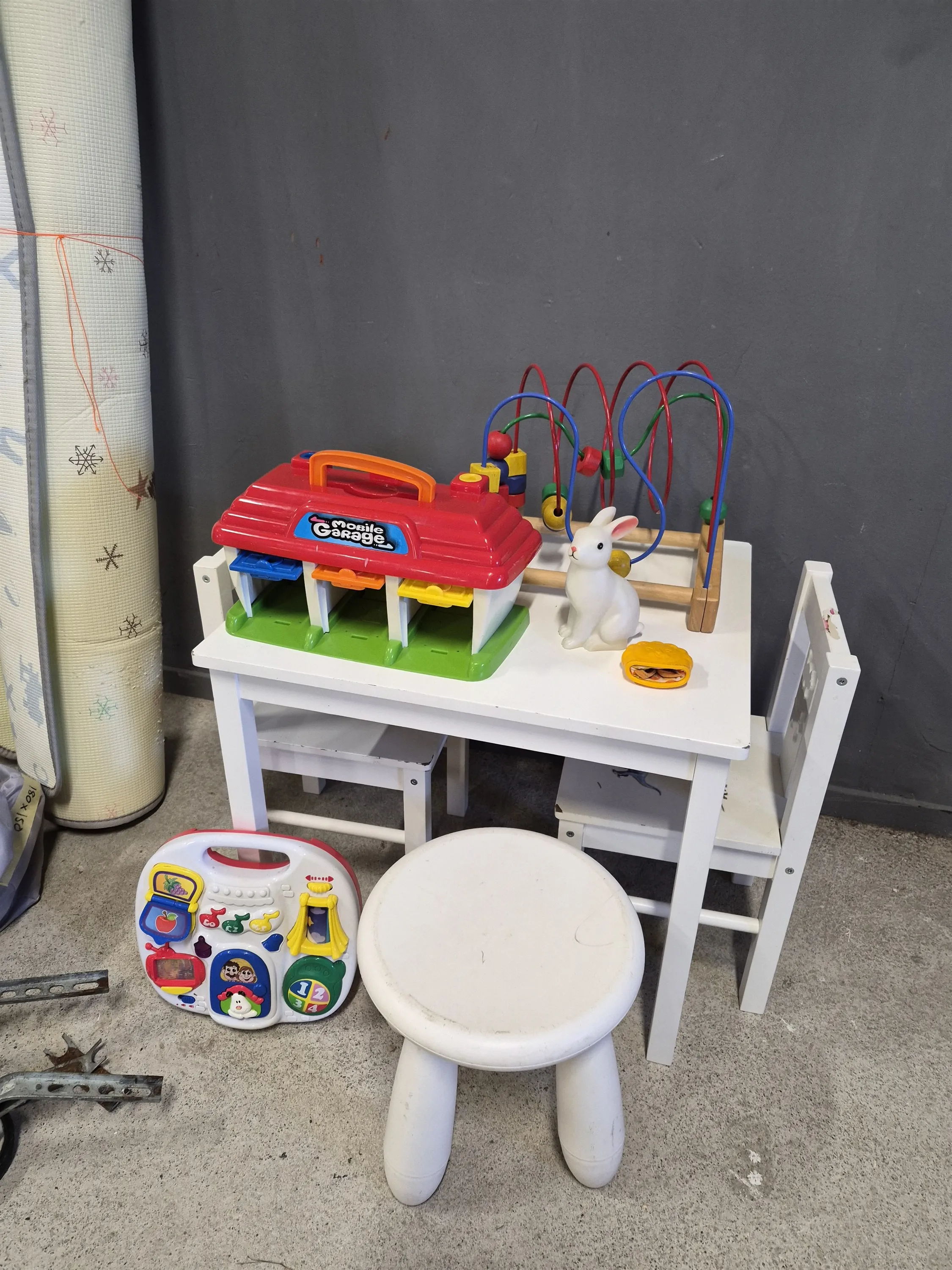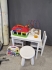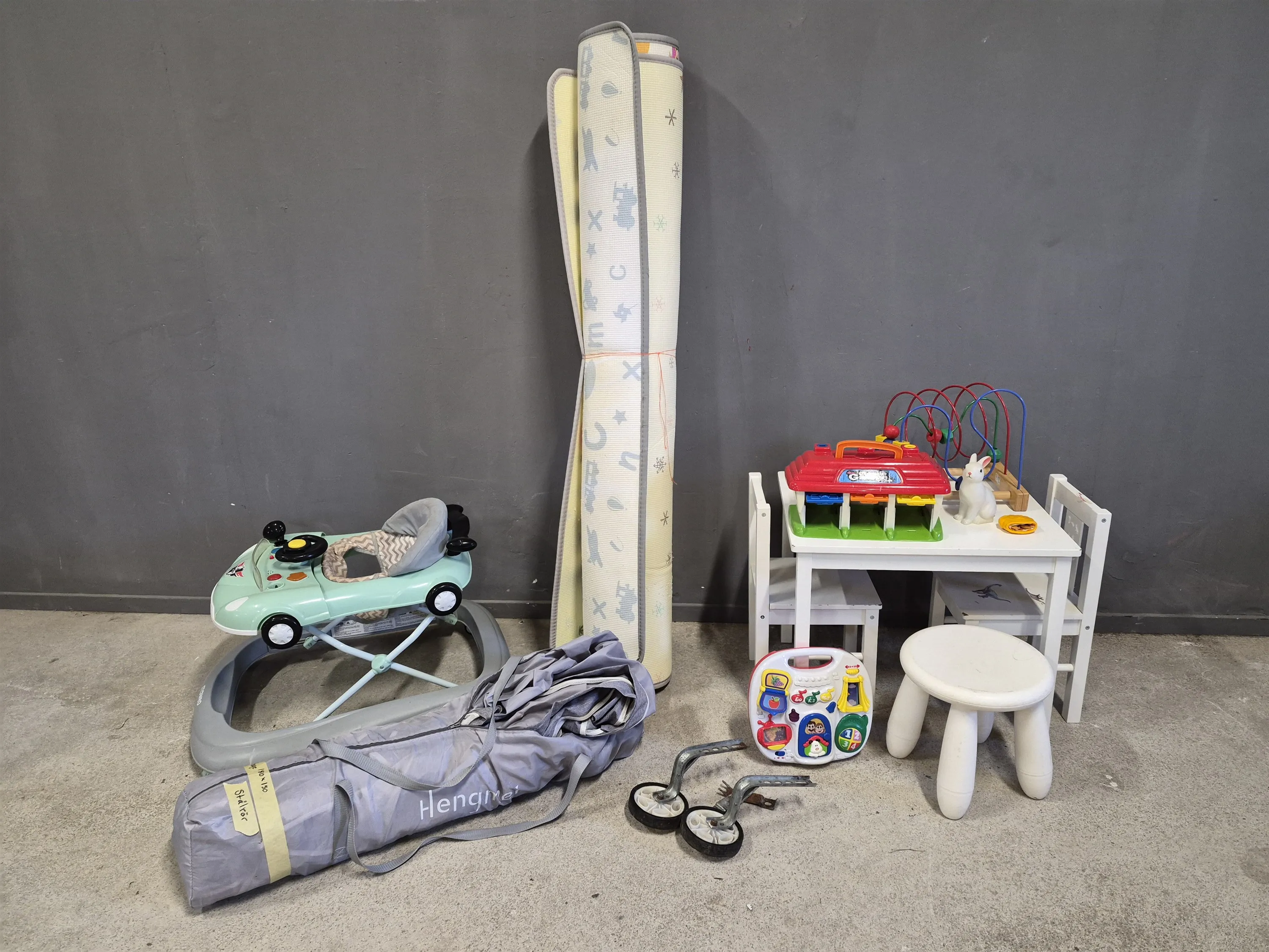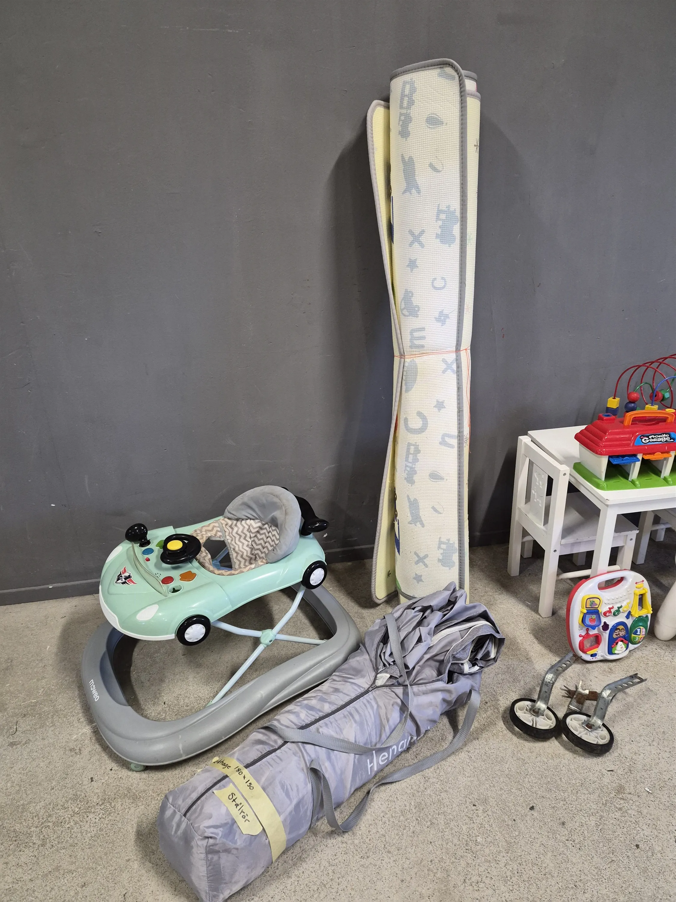 19762. Parti barnsaker bla lekhage med matta, gåbil och bord med stolar, slitage finns, mått på lekhage 180x150 cm