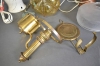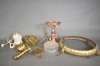 527. Parti belysning bla lampstomme i mässing, väggfotogenlampa och bordslampar i koppar, största diameter 53 cm