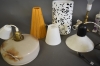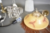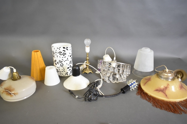 15099. Parti belysning bla taklampor, boprdslampa mässing och lampa med plastprismor, högsta höjd 34 cm