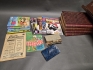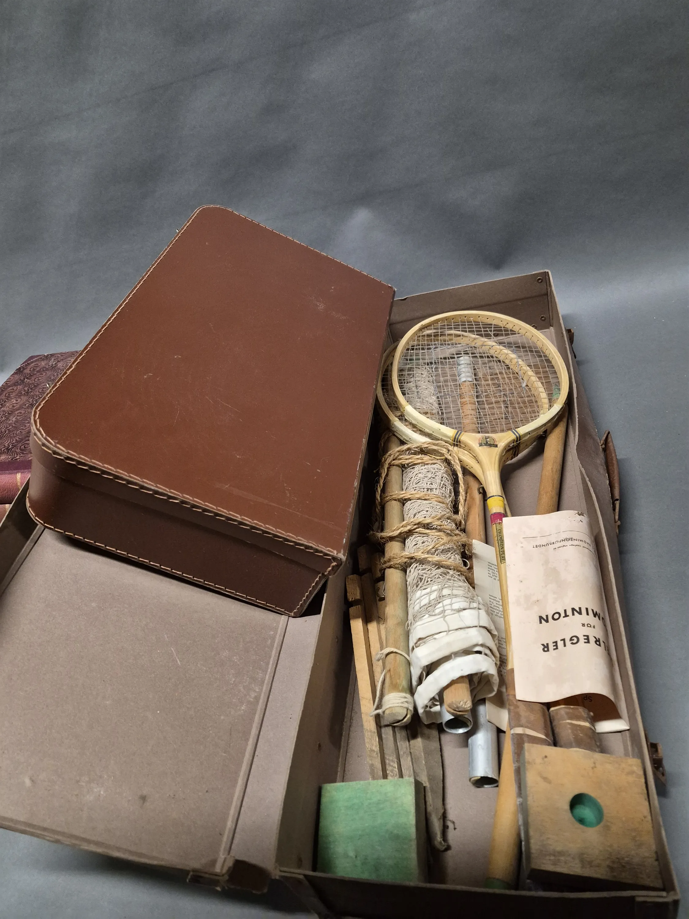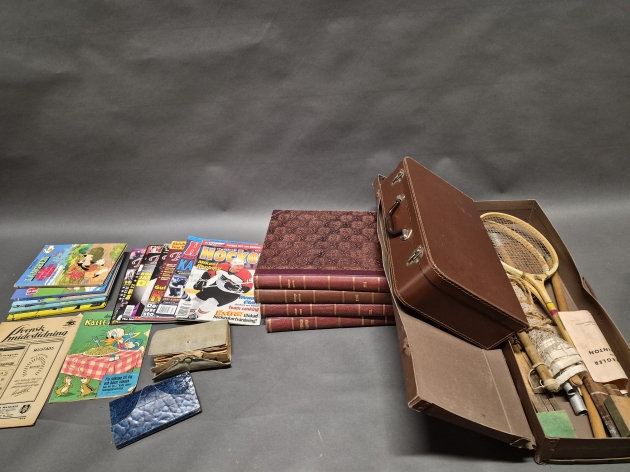 17273. Parti bl.a böcker Såningsmannen 1930-tal & badmintonset i låda längd 50 cm