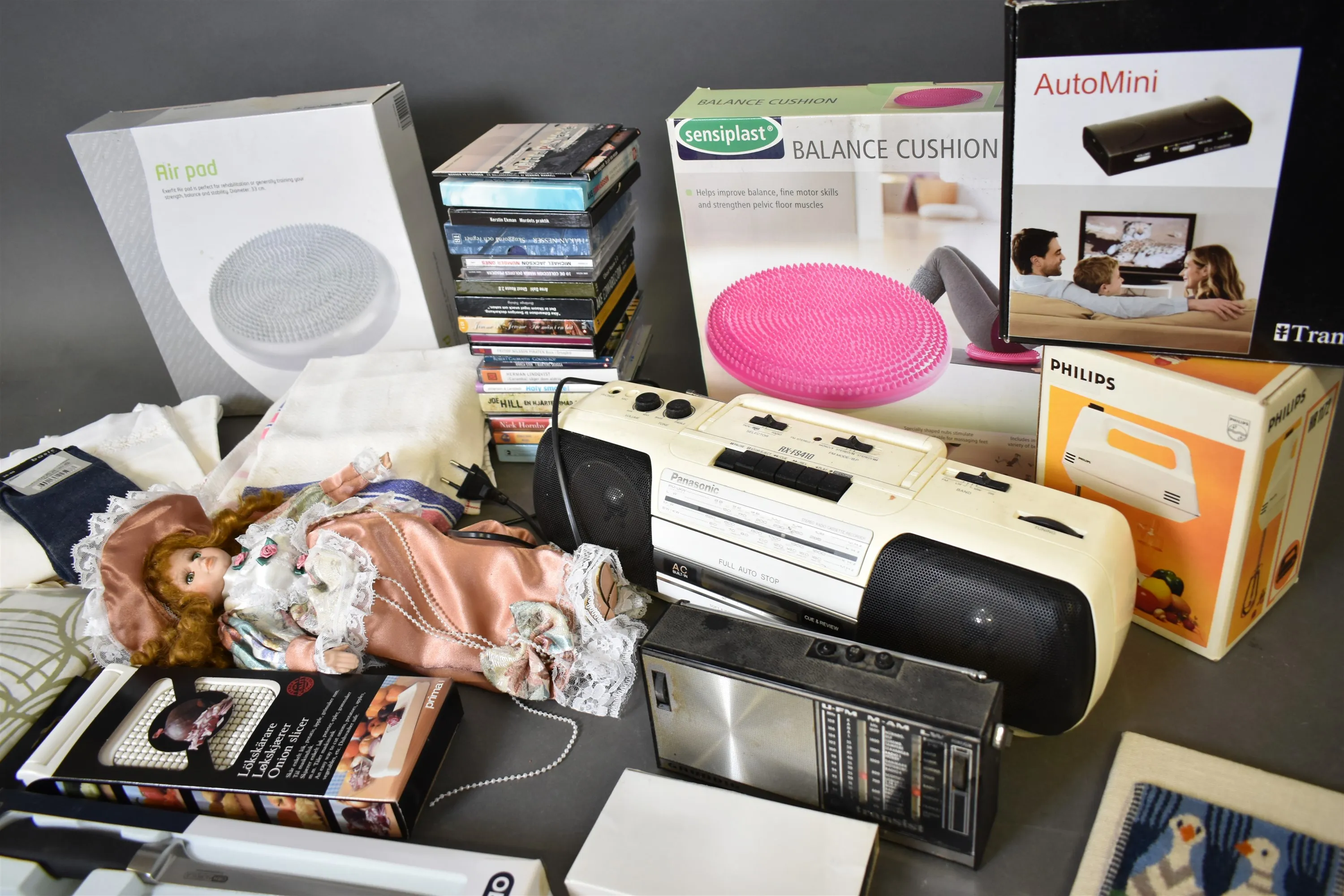 12129. Parti bl.a balansbräda, textilier stereo