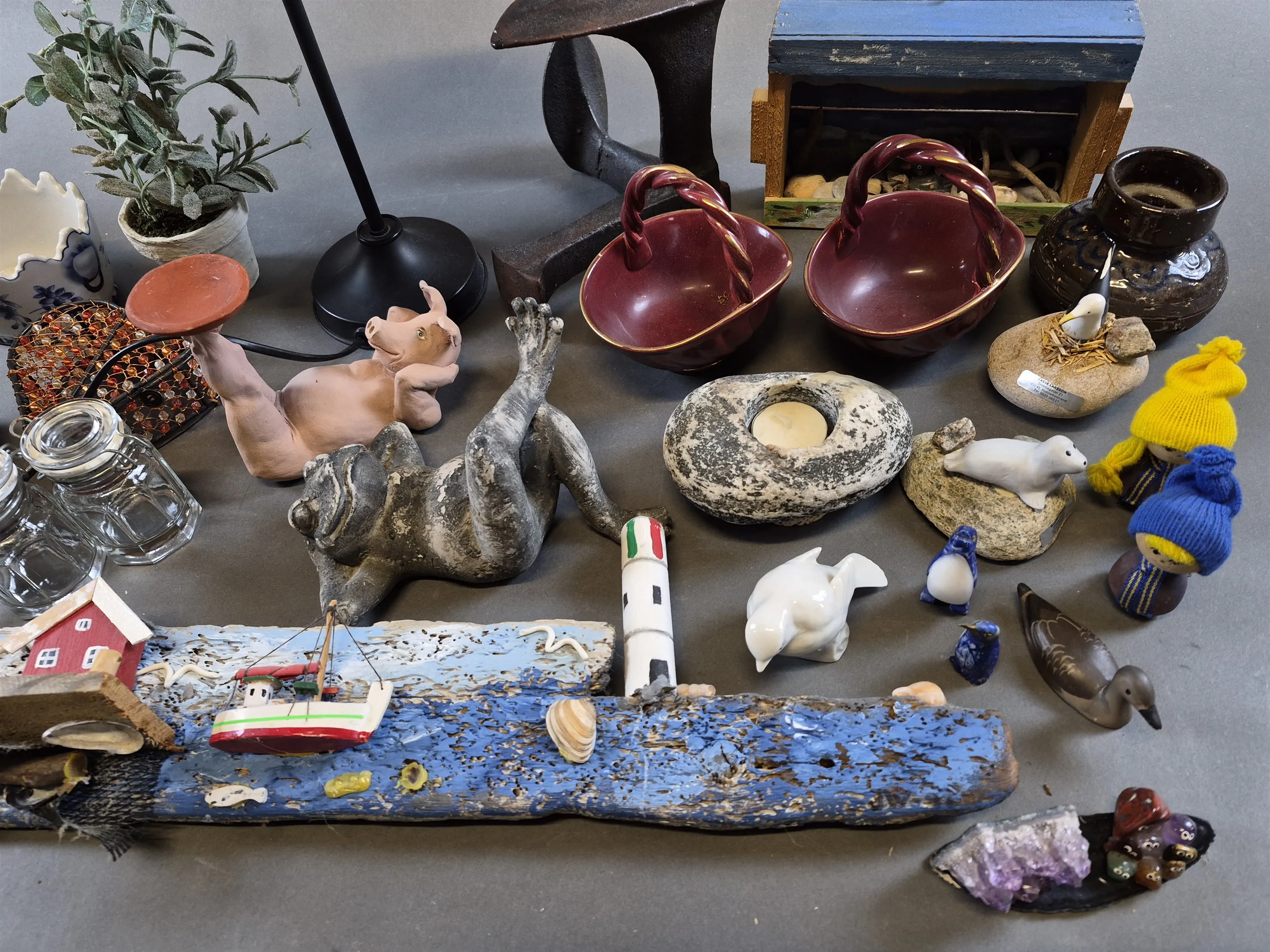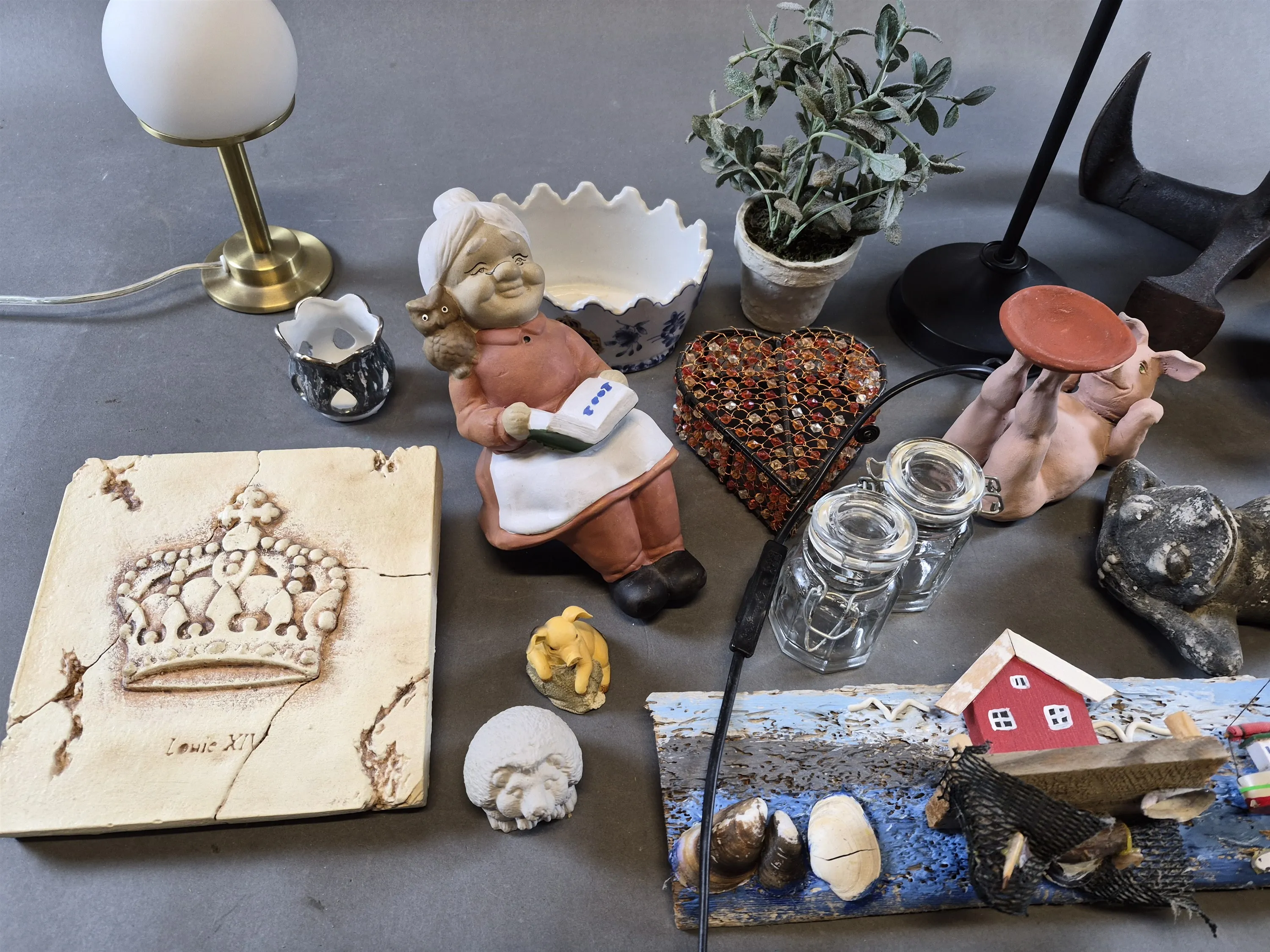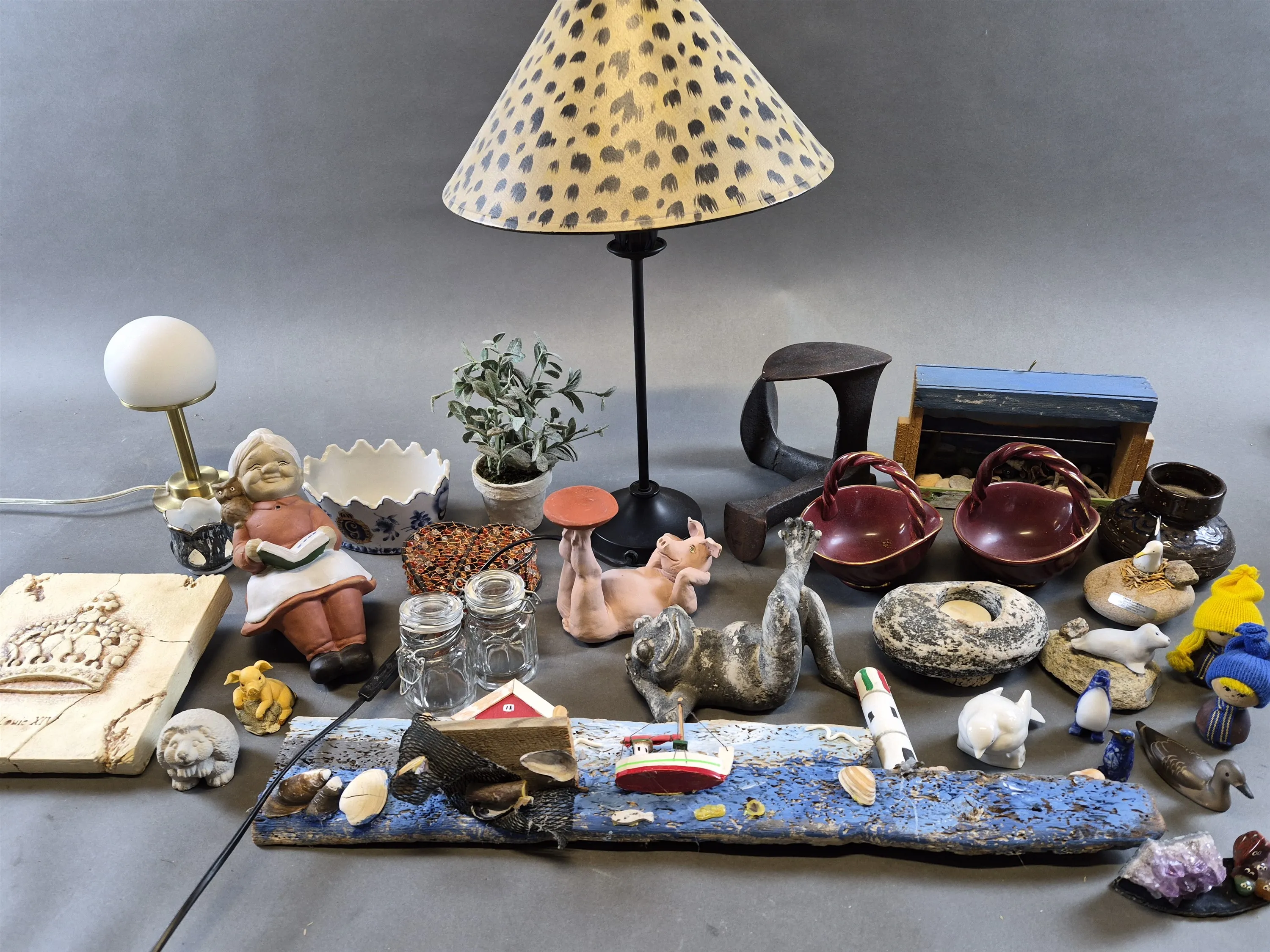 19792. Parti bl.a bordslampor, dekorationsföremål, keramik, trä & metall, högsta 40 cm