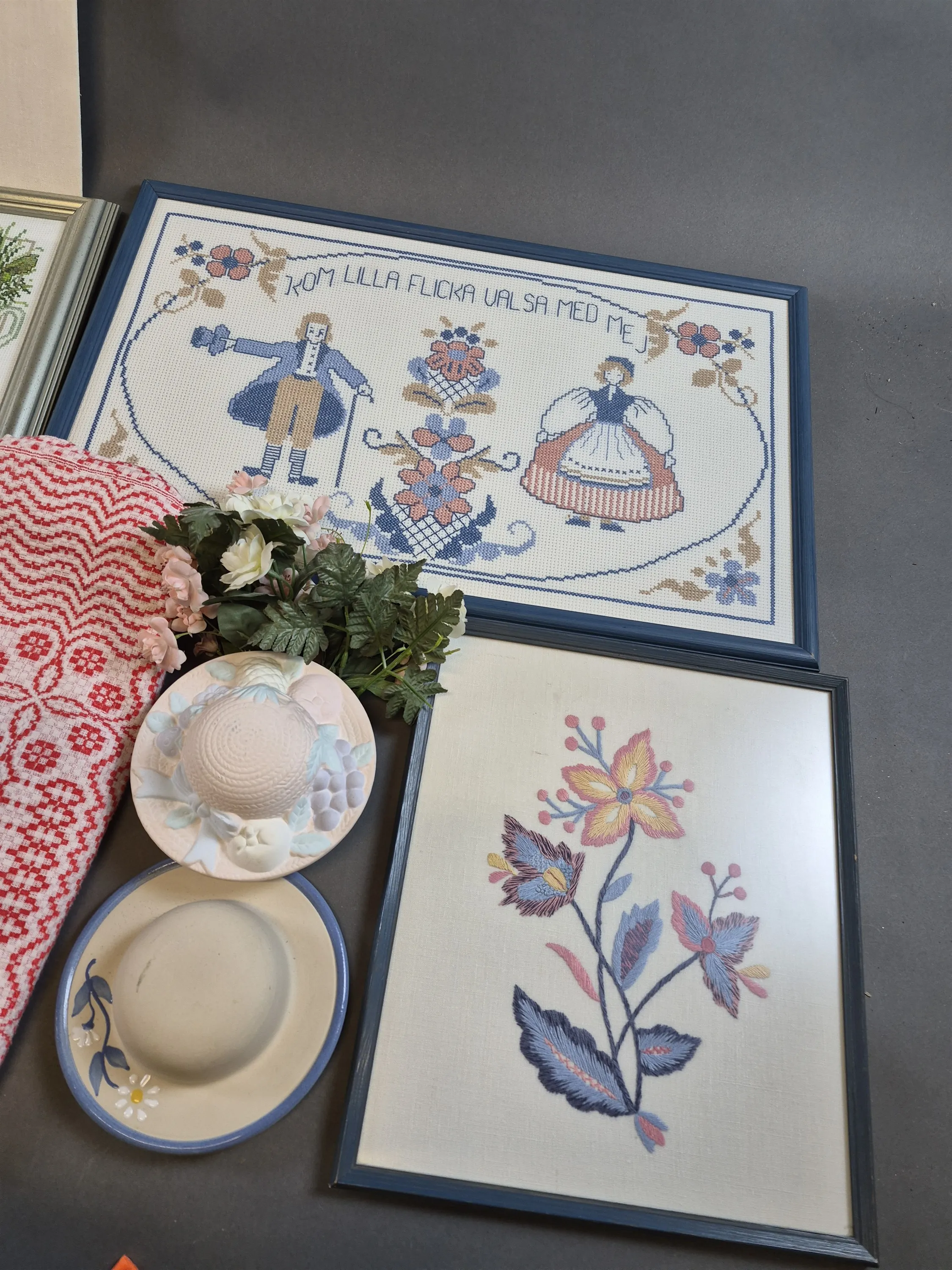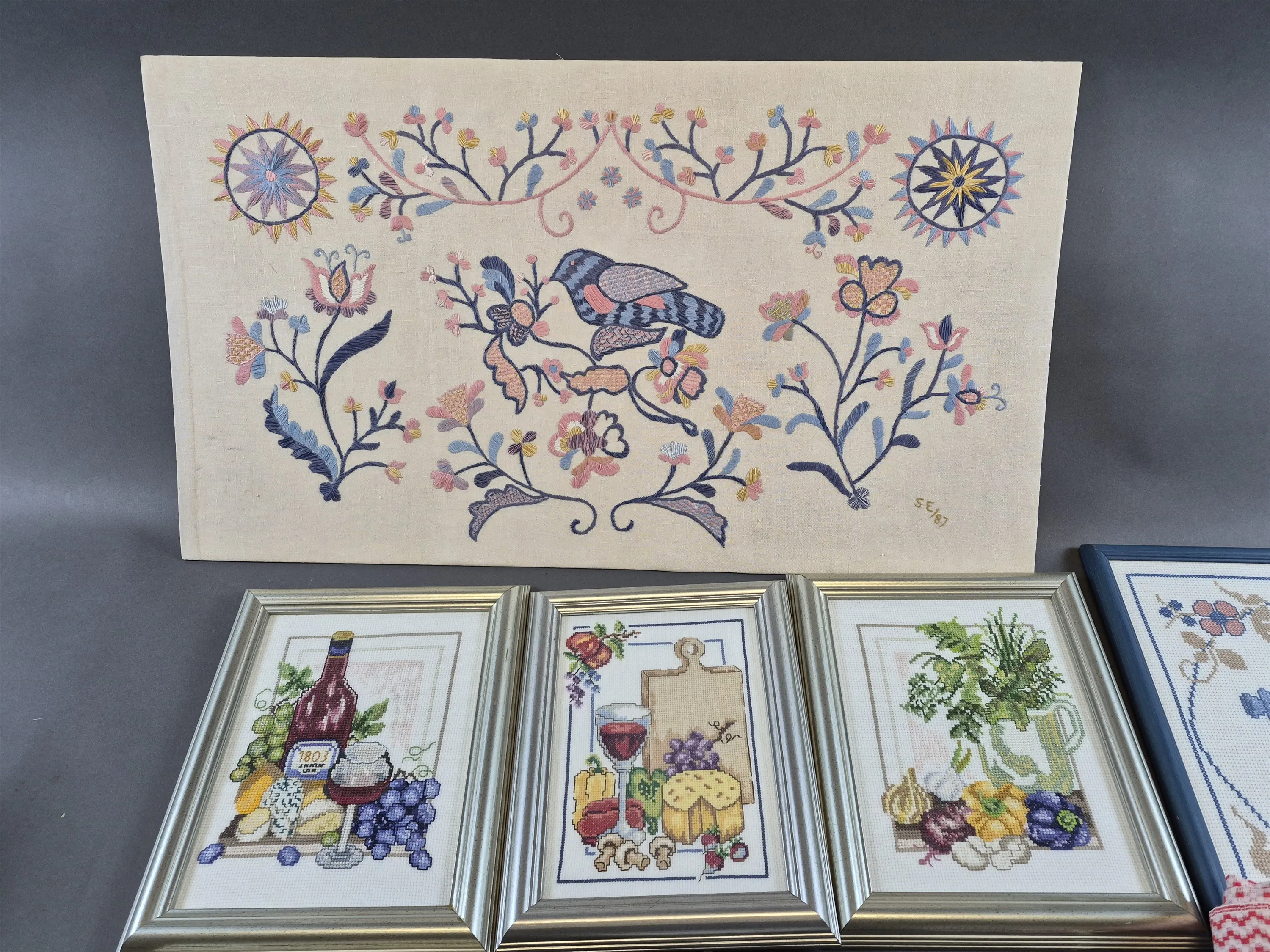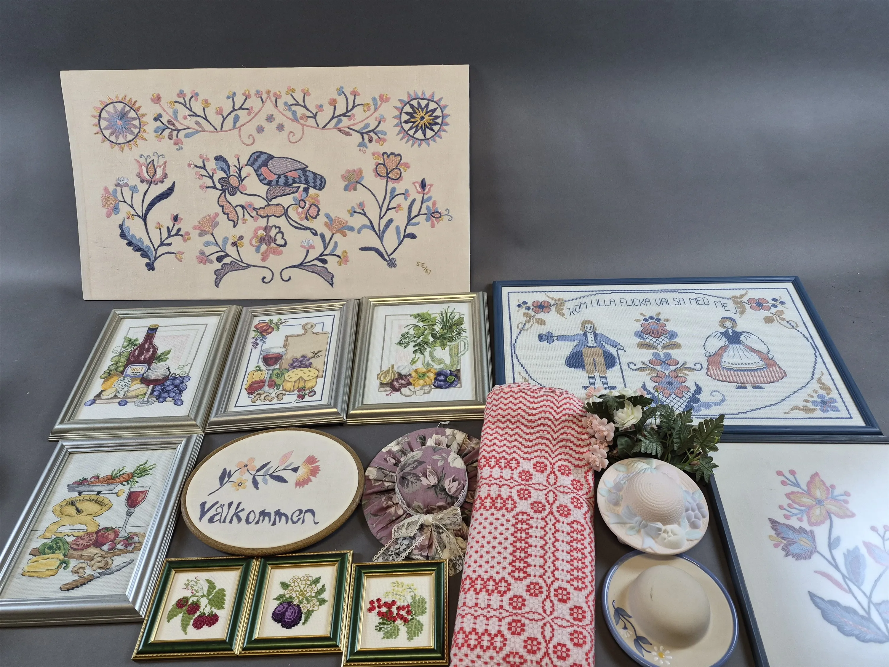 20584. Parti bl.a broderade tavlor Bleking, största mått 77 x 44 cm