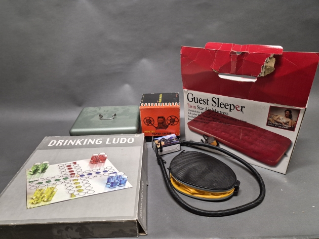 18370. Parti bl.a drinkspel, Viewer Editor 8 mm & luftmadrass