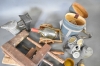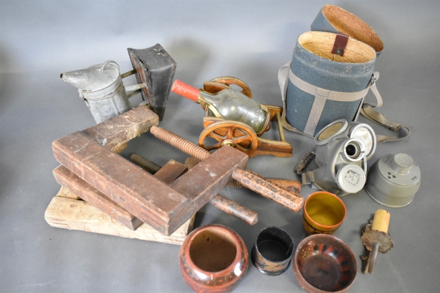 13941. Parti bl.a gasmask, rökbälg för bi & skruvtvingar trä längsta 50 cm