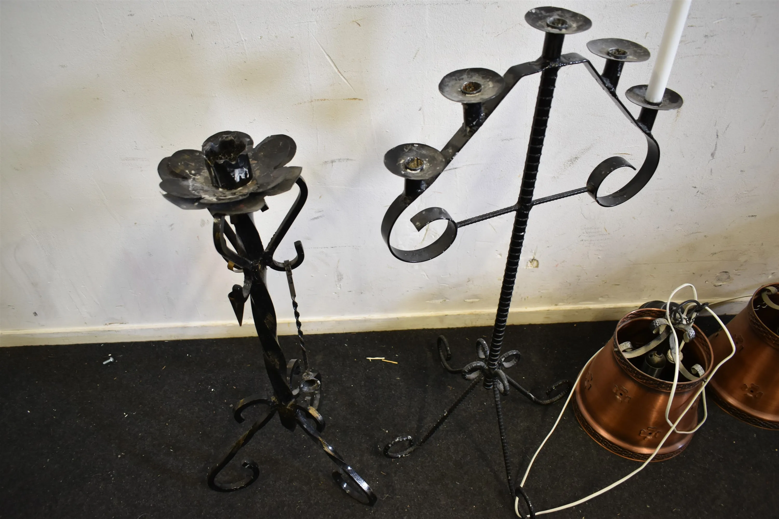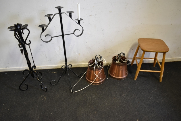 16688. Parti bl.a golvljusstakar 2 st, pall och taklampor i metall, högsta höjd ca 85 cm