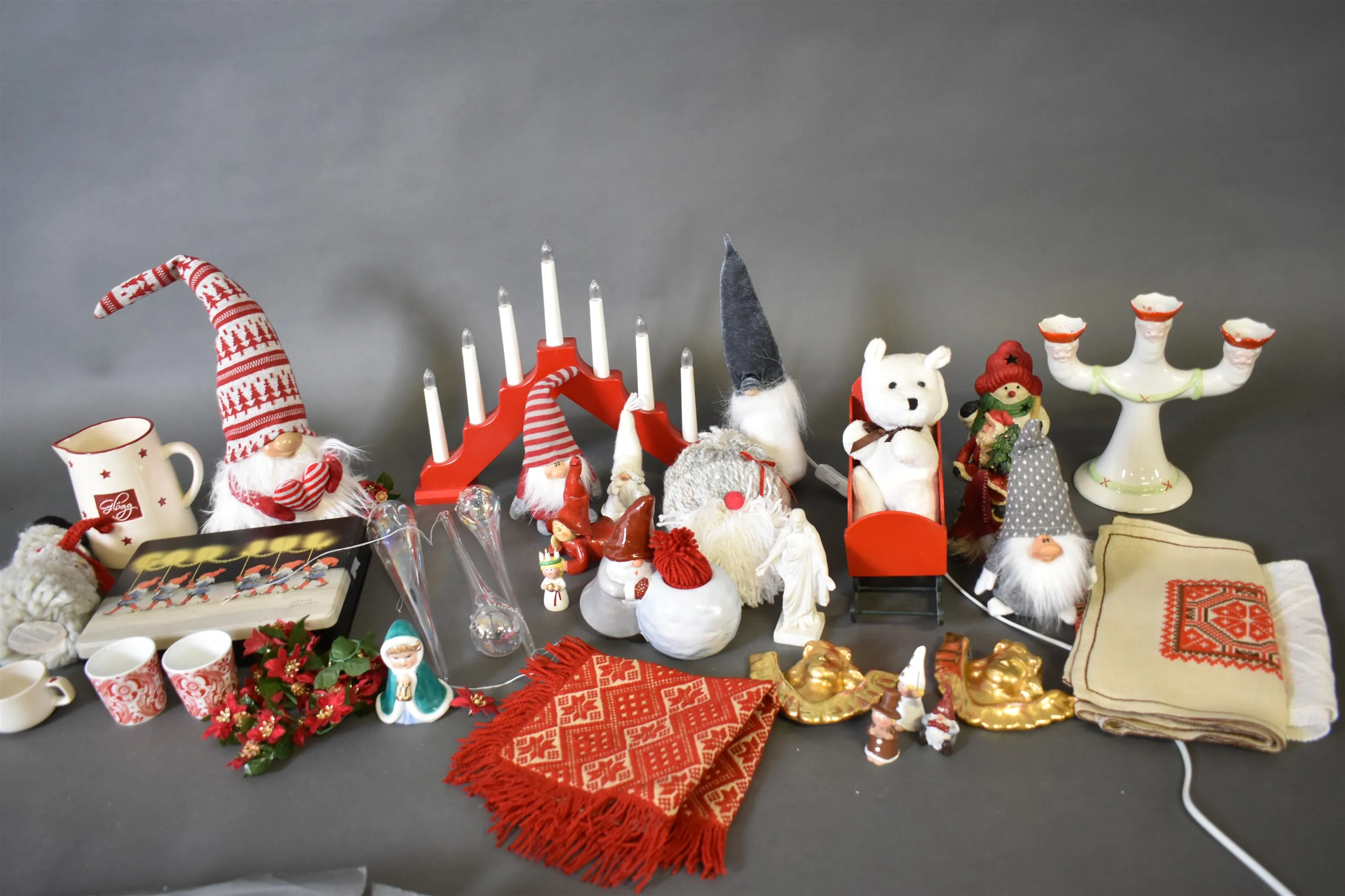 7944. Parti bl.a julsaker bl.a tomtar & ljusstake Gustavsberg högsta 35 cm