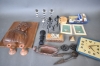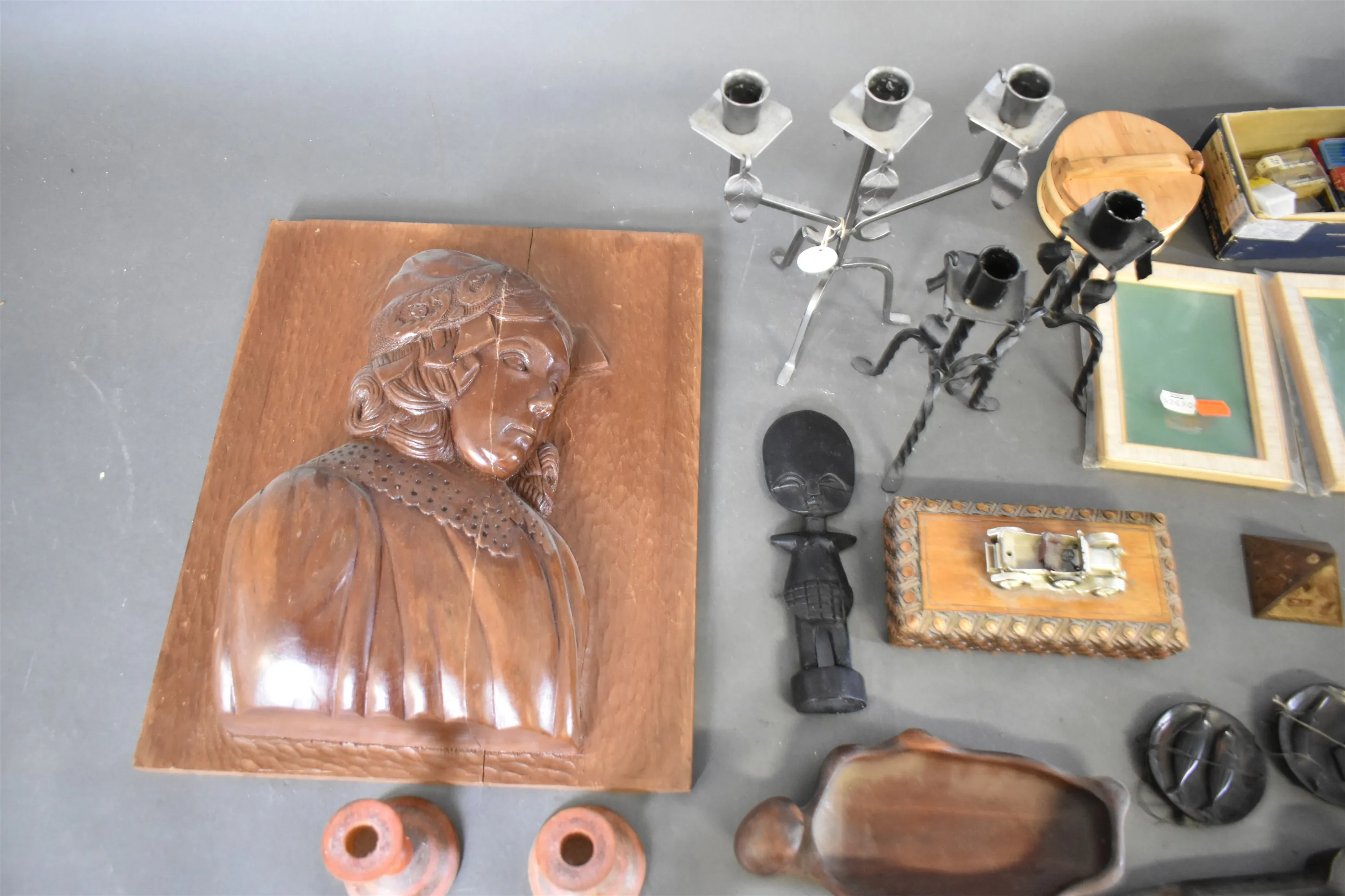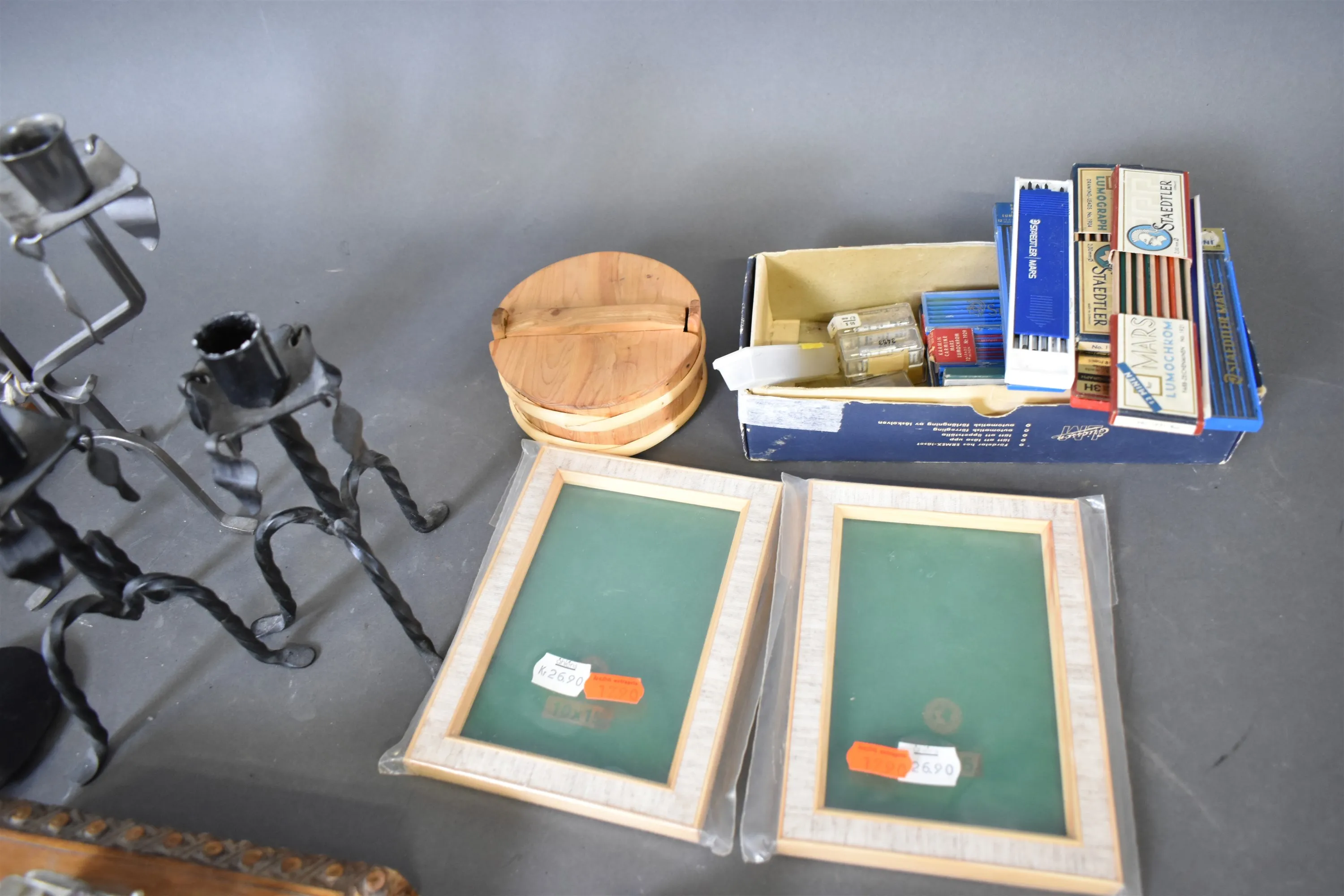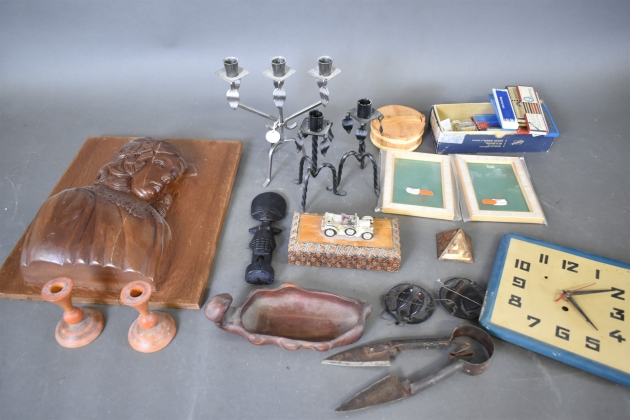 14558. Parti bl.a metalljusstakar, träföremål högsta 24 cm