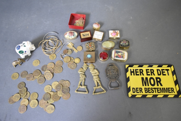 16110. Parti bl.a mynt, doser & öppnare, längsta 17 cm