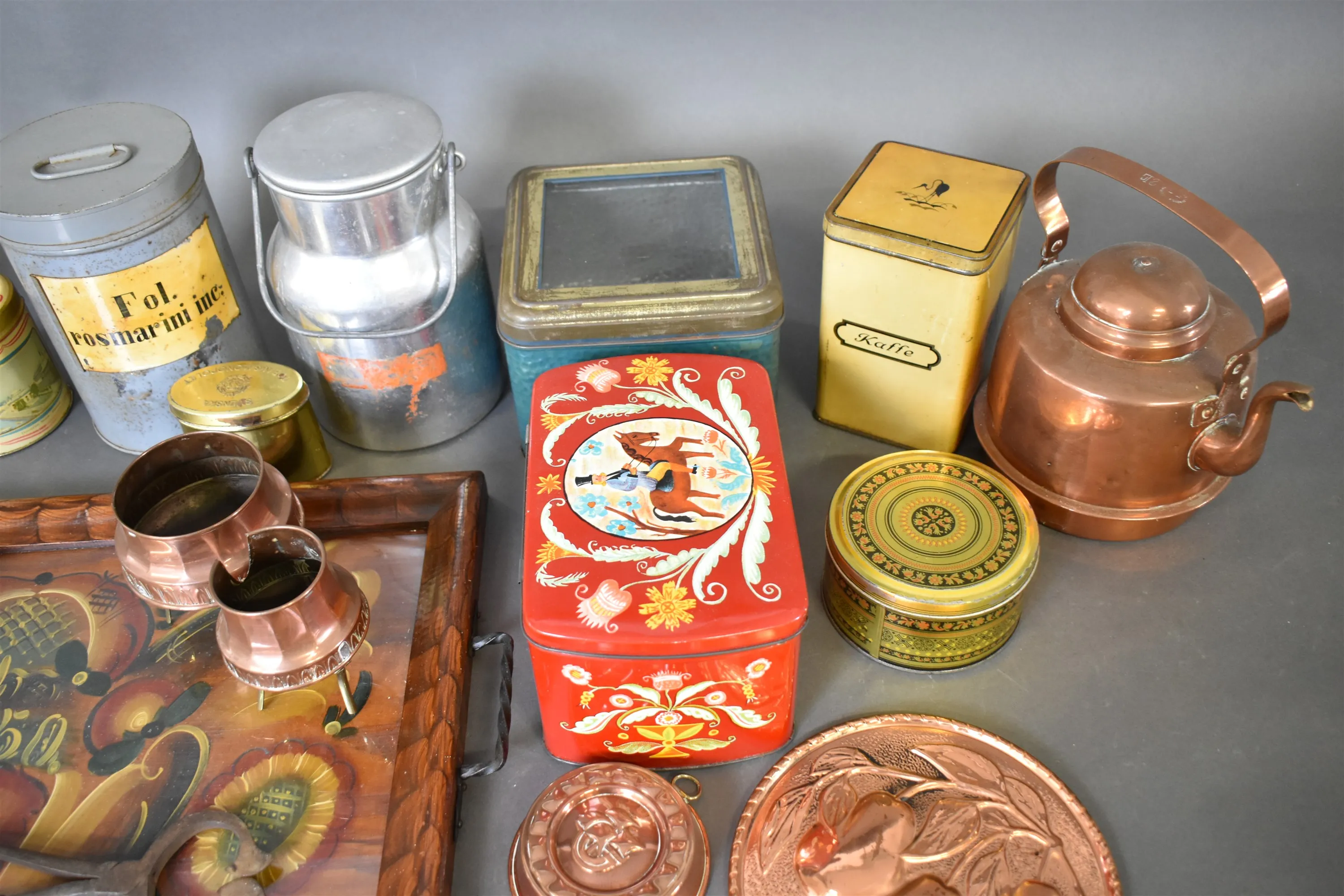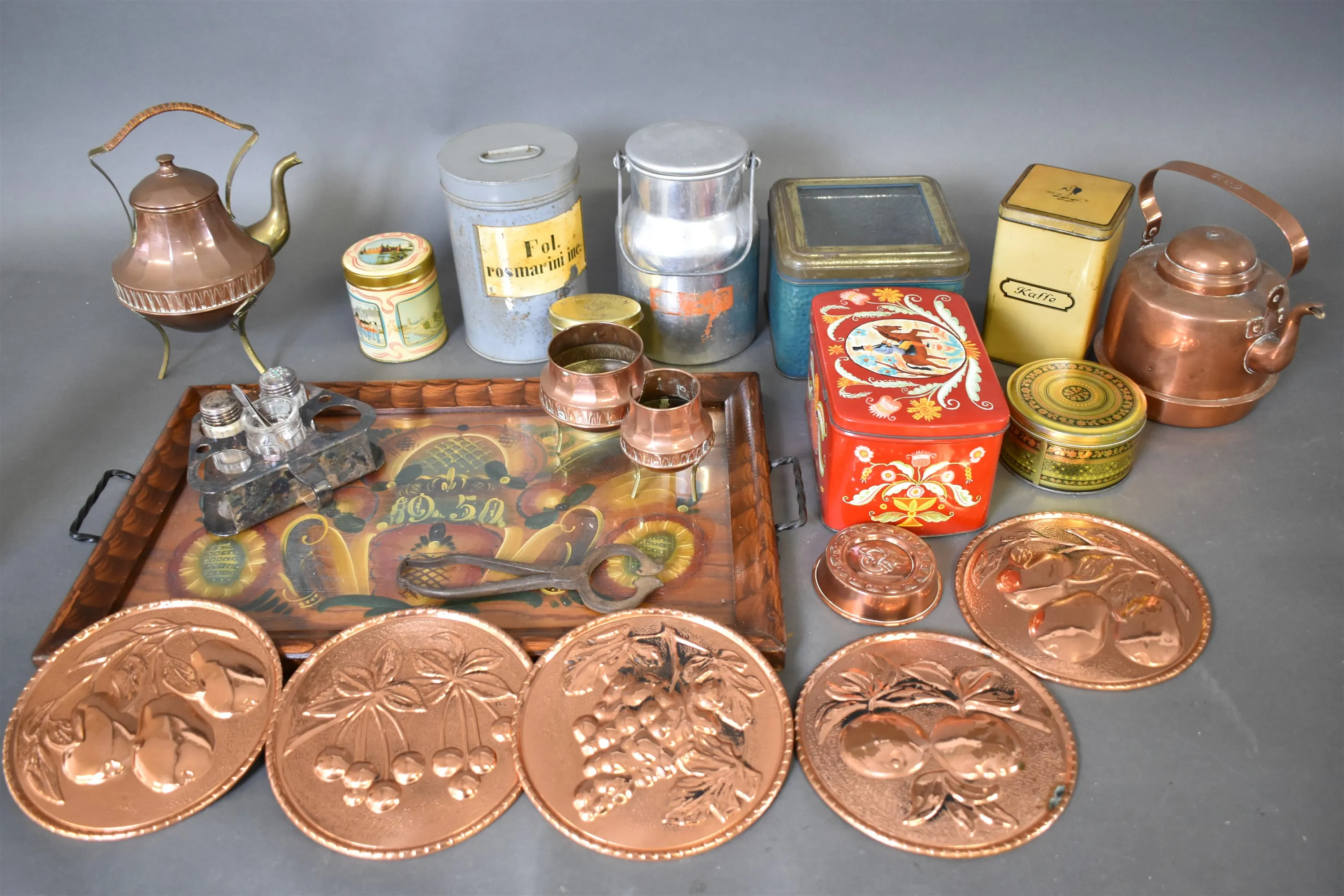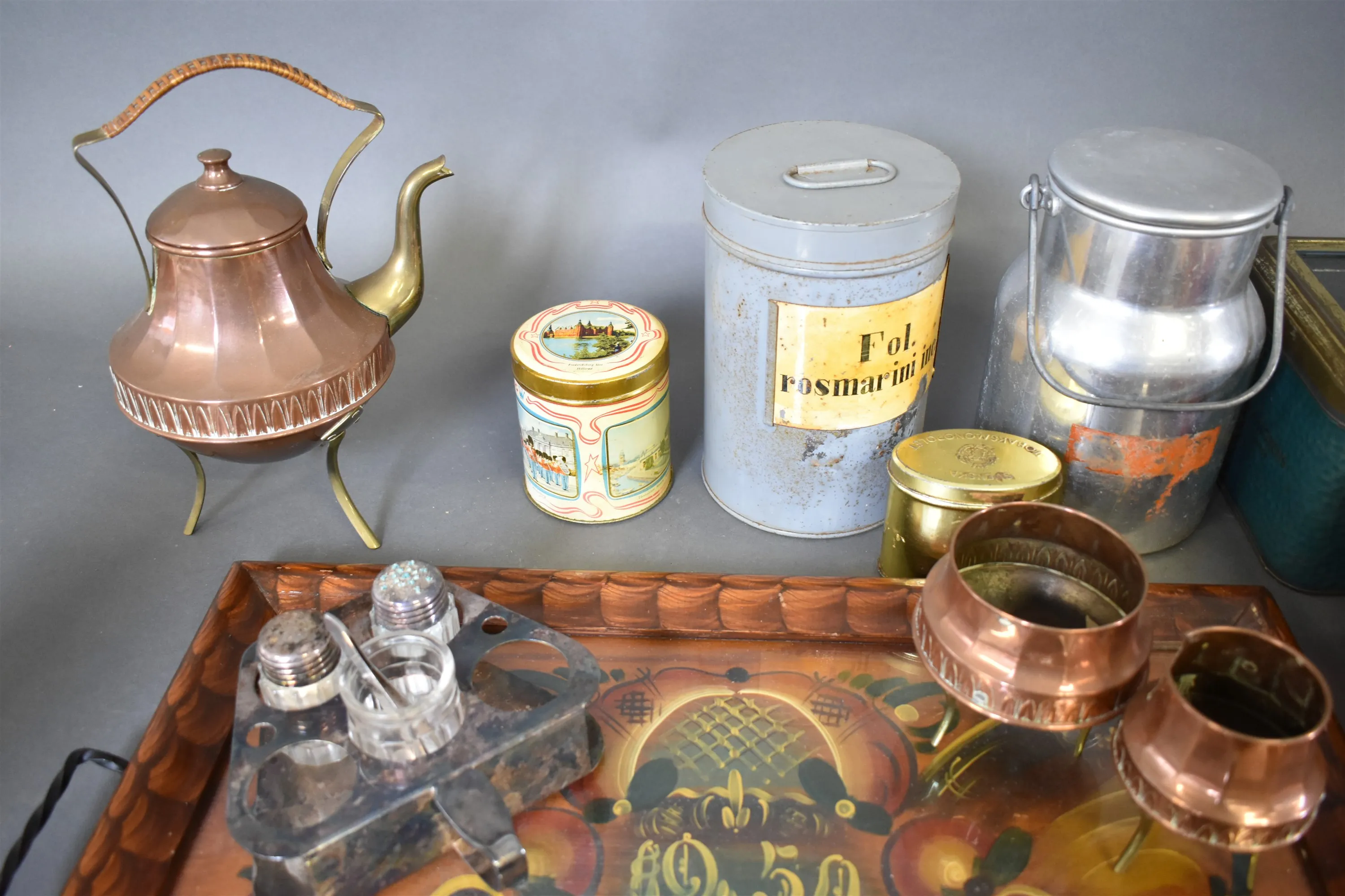 13682. Parti bl.a plåtburkar, koppar & severingsbricka, längsta 56 cm