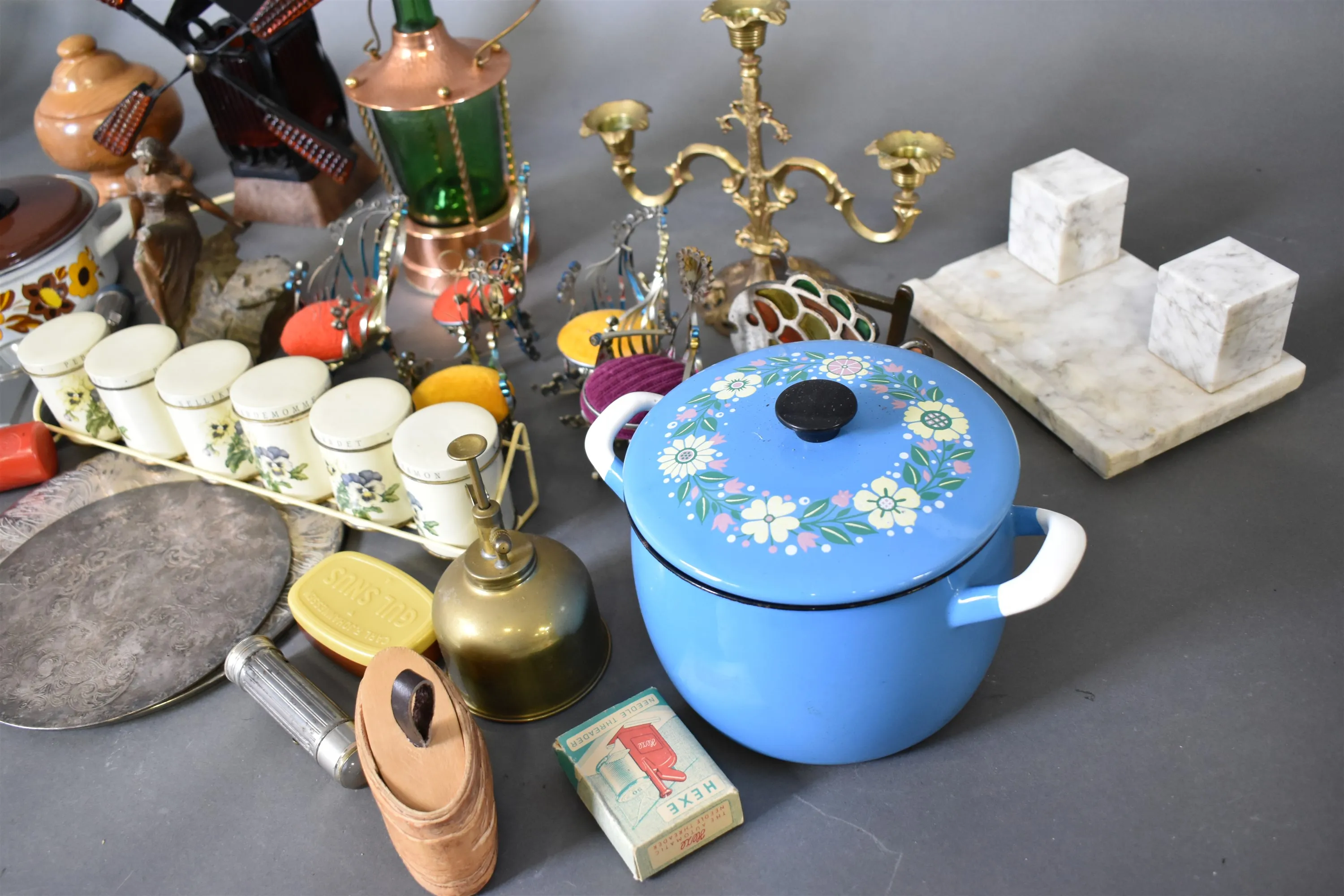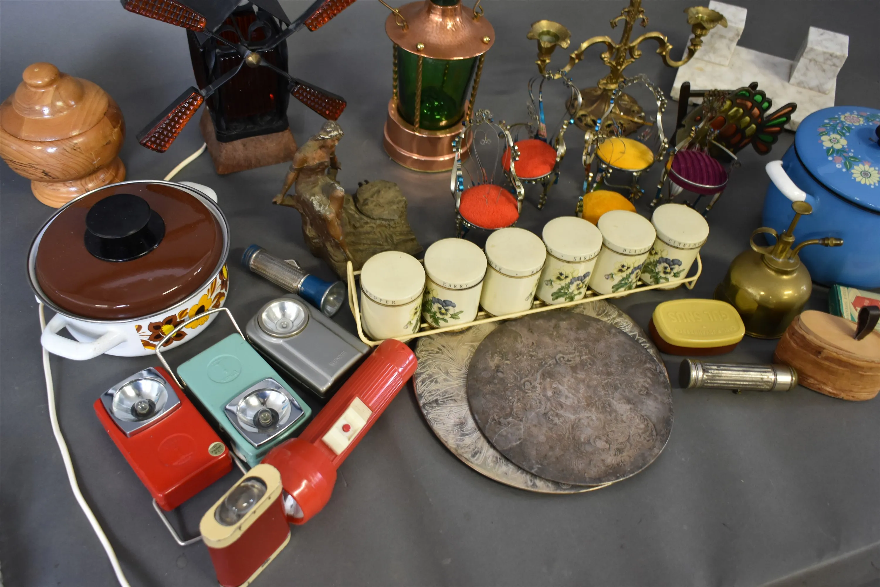 13813. Parti bl.a retroföremål, väderkvarn med belysning, ficklampor, högsta 30 cm