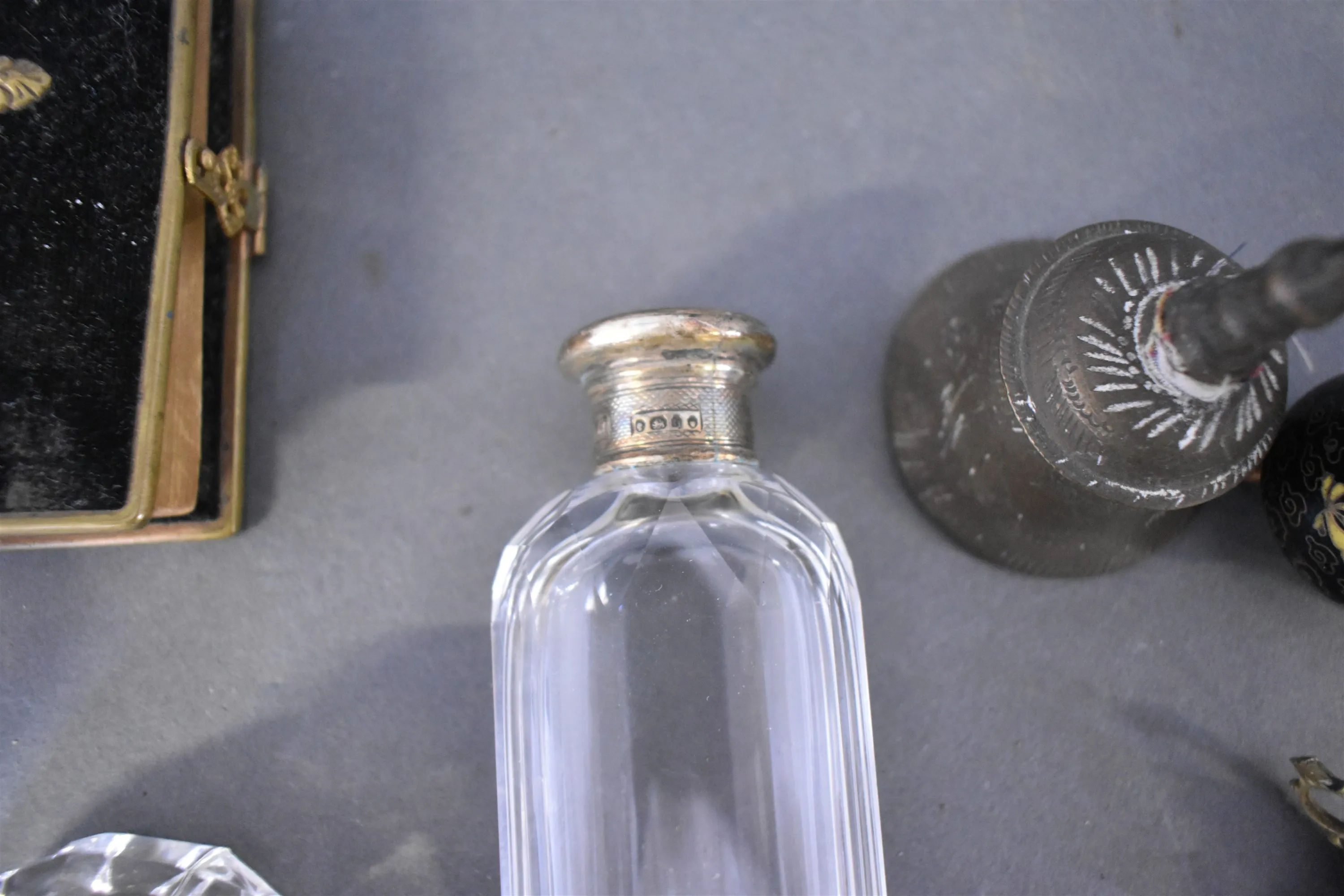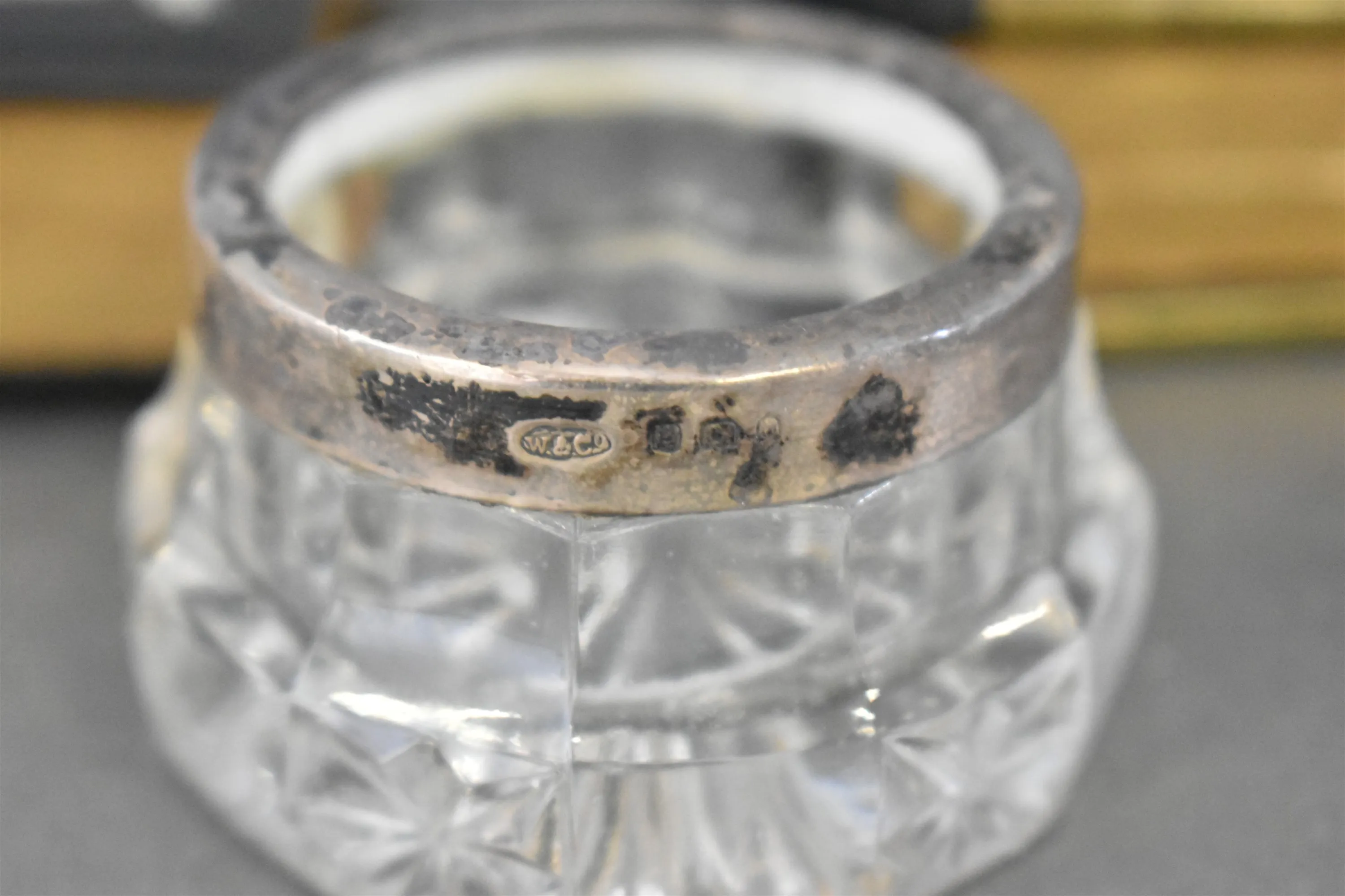 15564. Parti bl.a saltkar, flaskor, psalmböcker, bl. silvermontage, längsta 18 cm