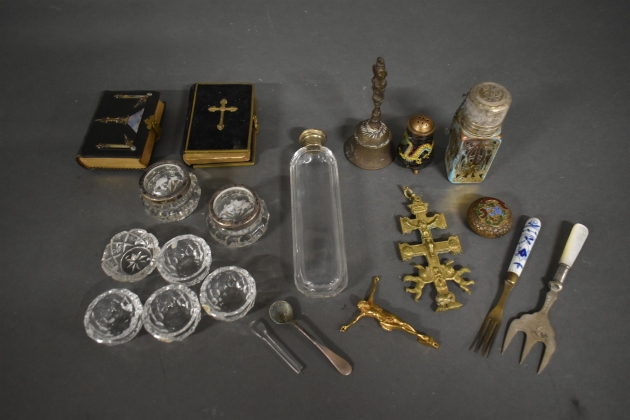 15564. Parti bl.a saltkar, flaskor, psalmböcker, bl. silvermontage, längsta 18 cm
