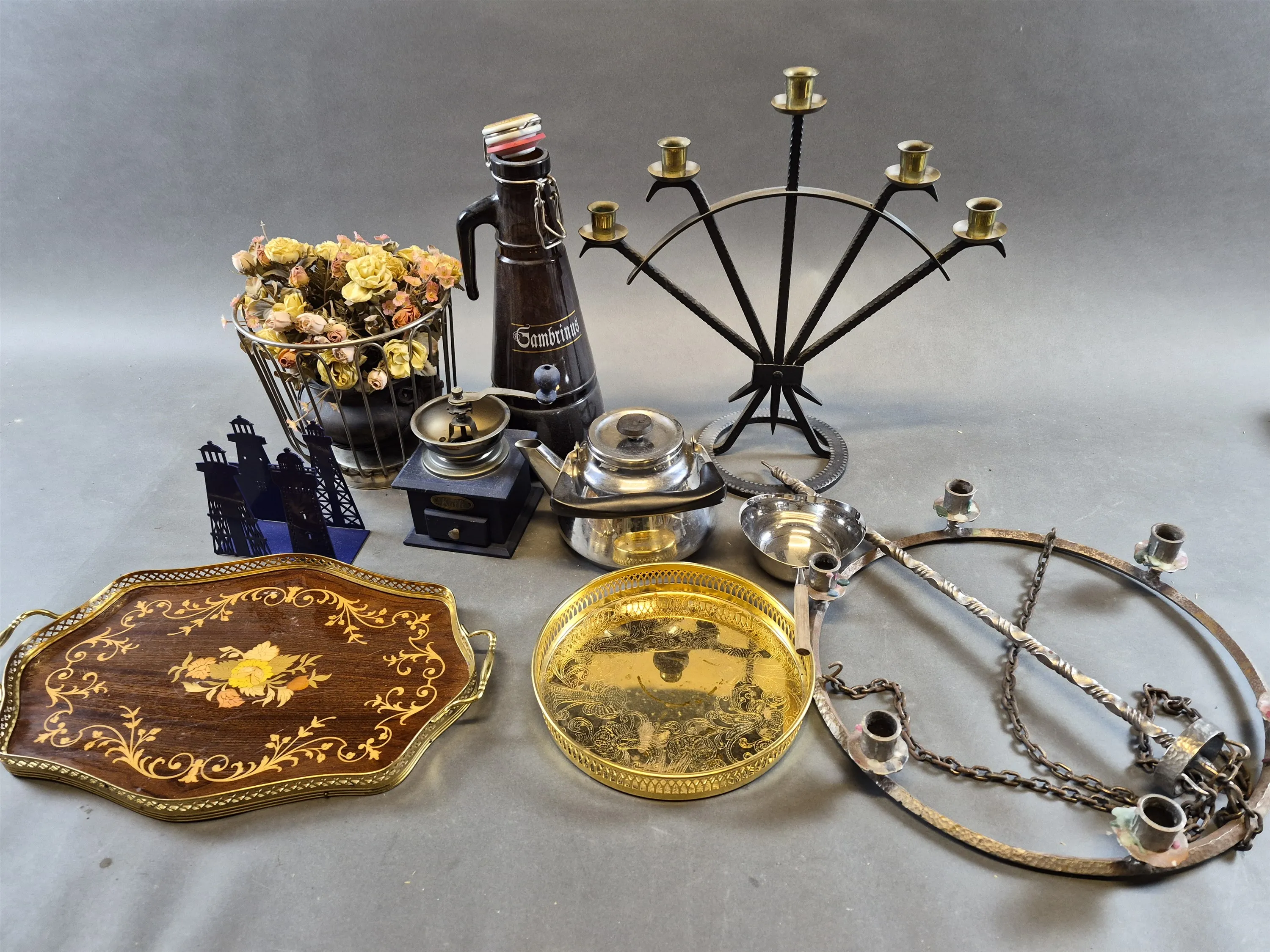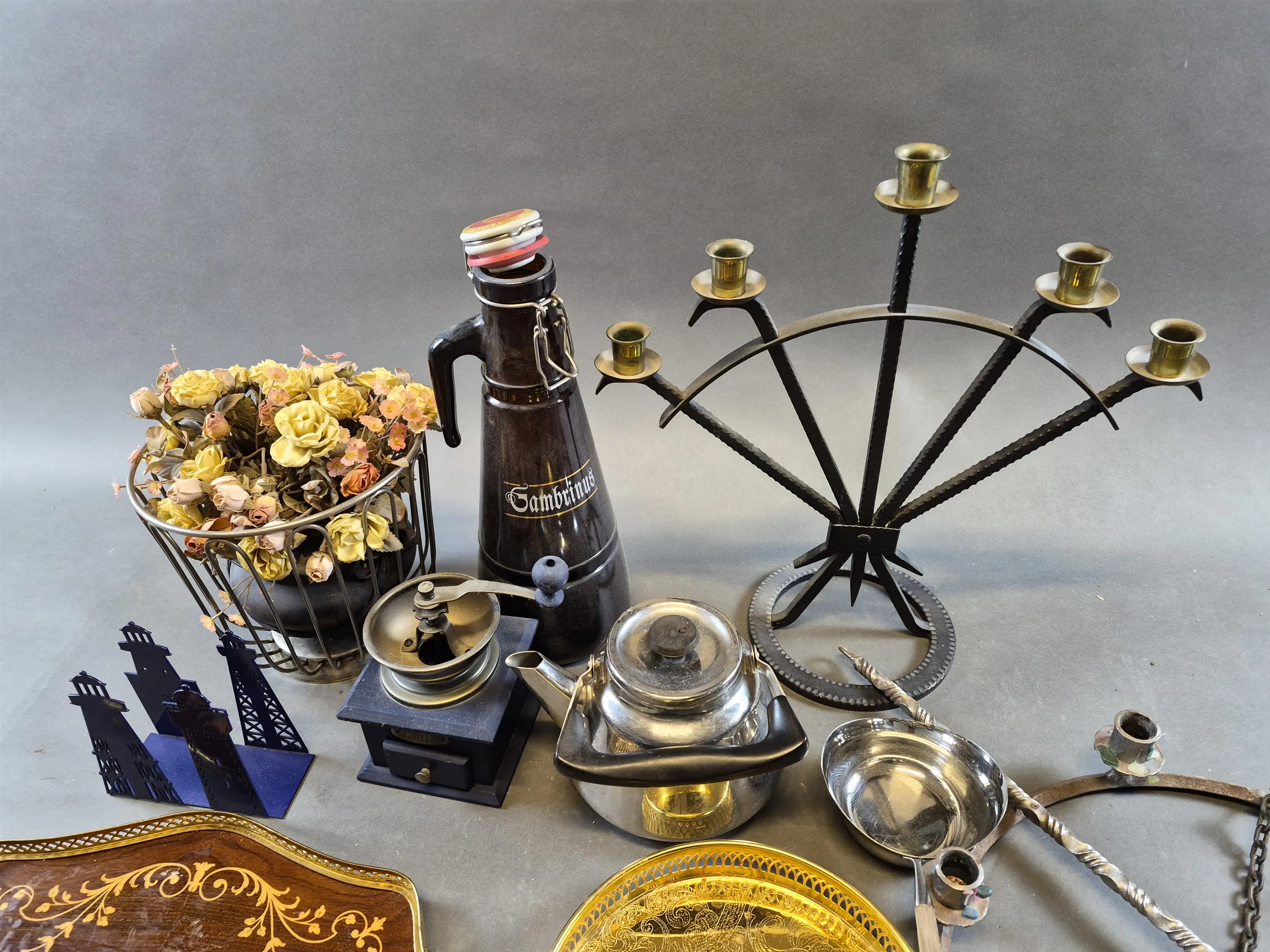 19793. Parti bl.a smidesljushållare, kanna med patentkork högsta 43 cm