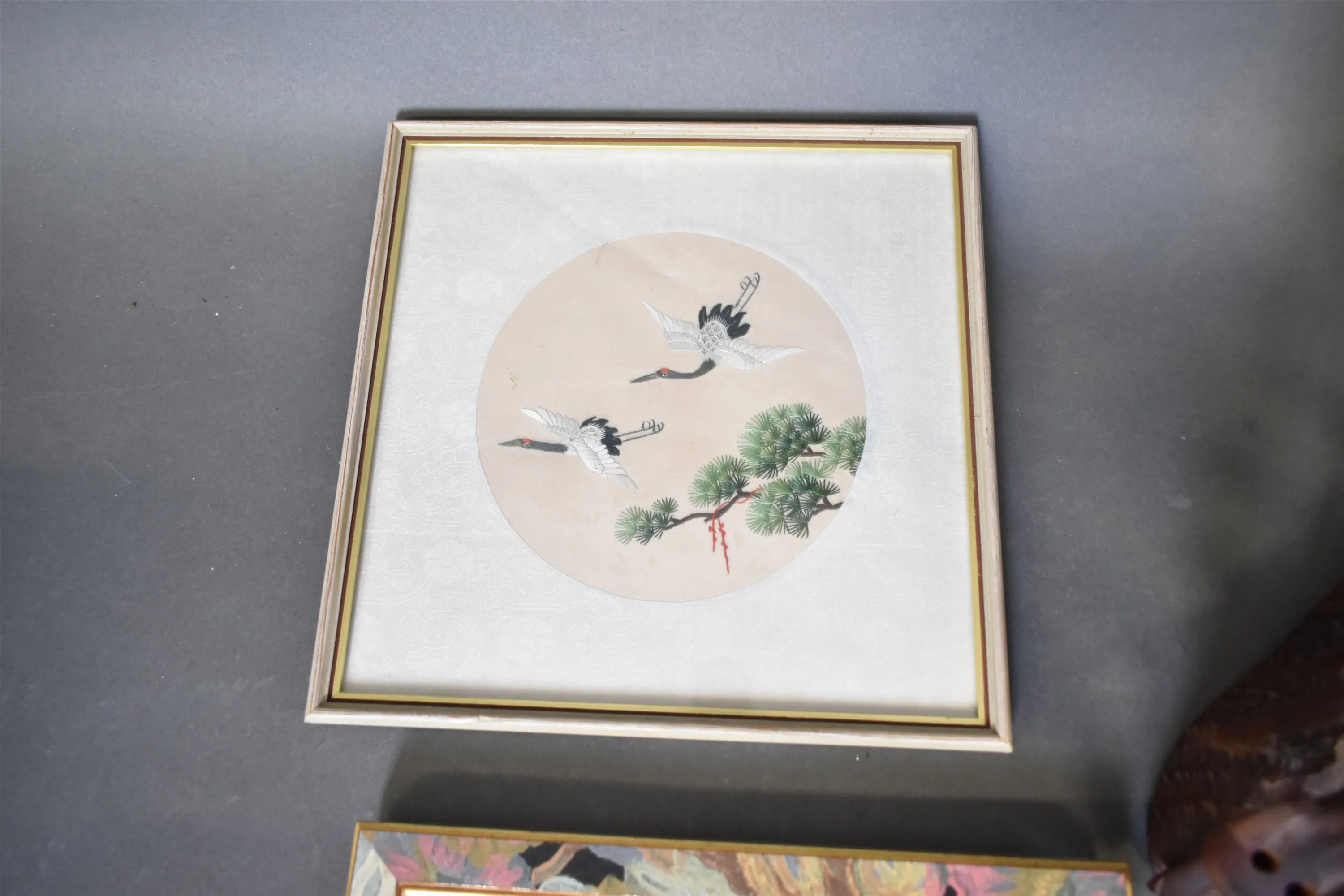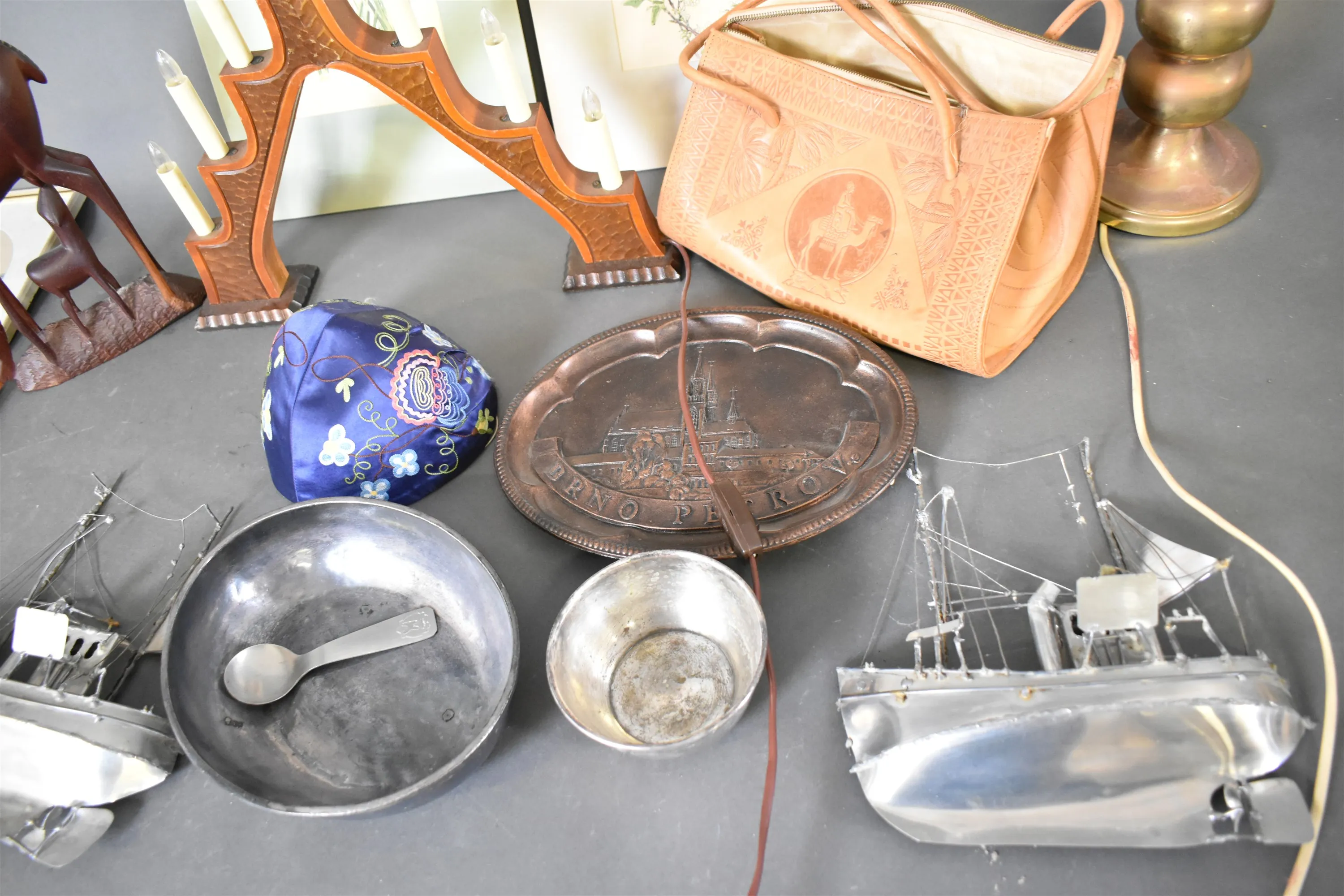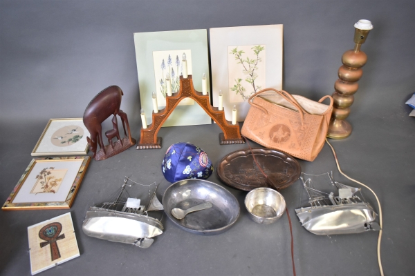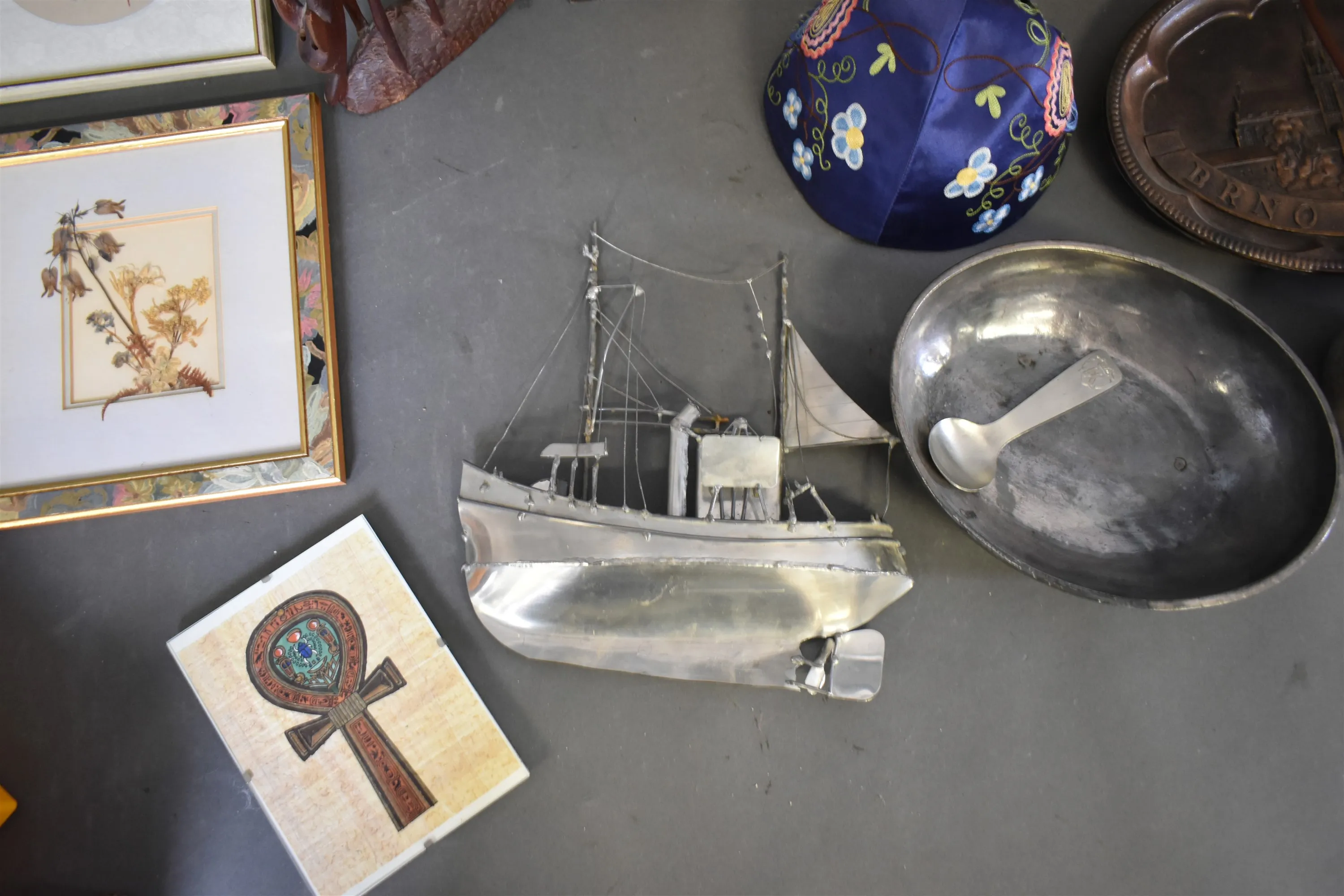 10500. Parti bl.a tavlor, träskulptur, tennbåtar Urban Ström, högsta 45 cm