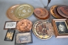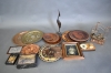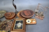 2879. Parti bl.a trä & metallfat, båt med speldosa & montertavlor högsta 43 cm