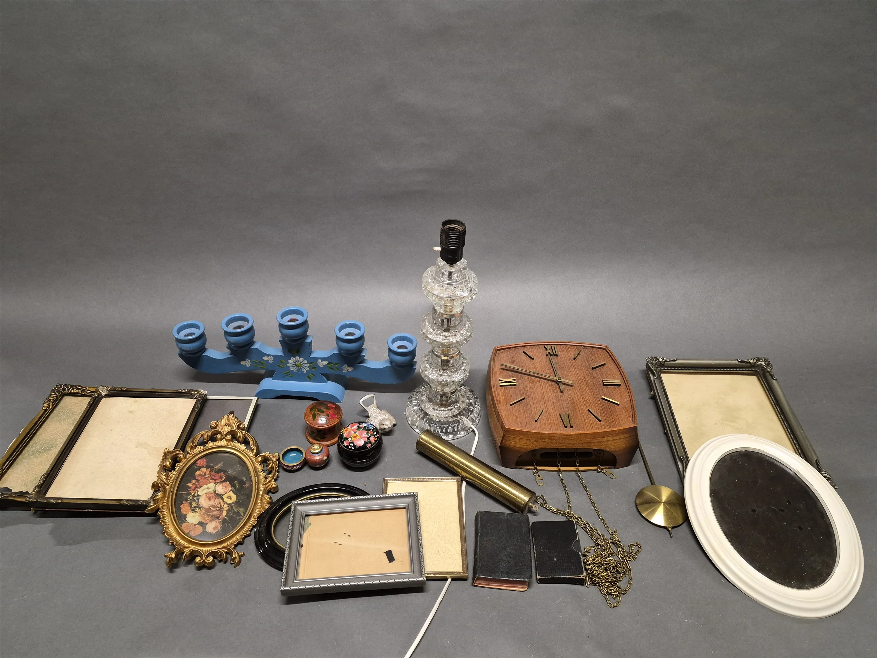 18179. Parti bl.a väggur i teak och träljusstake, högsta höjd 40 cm