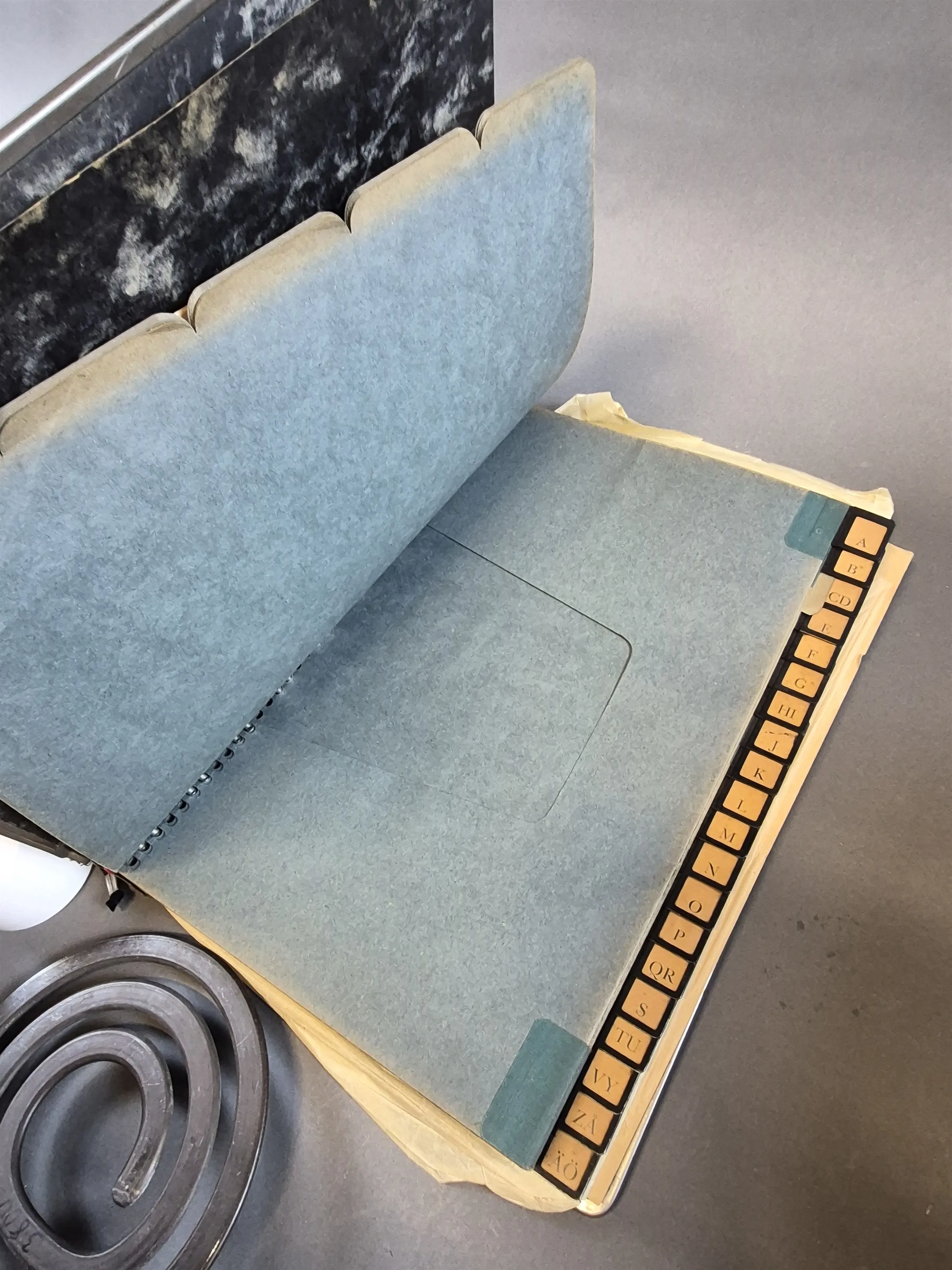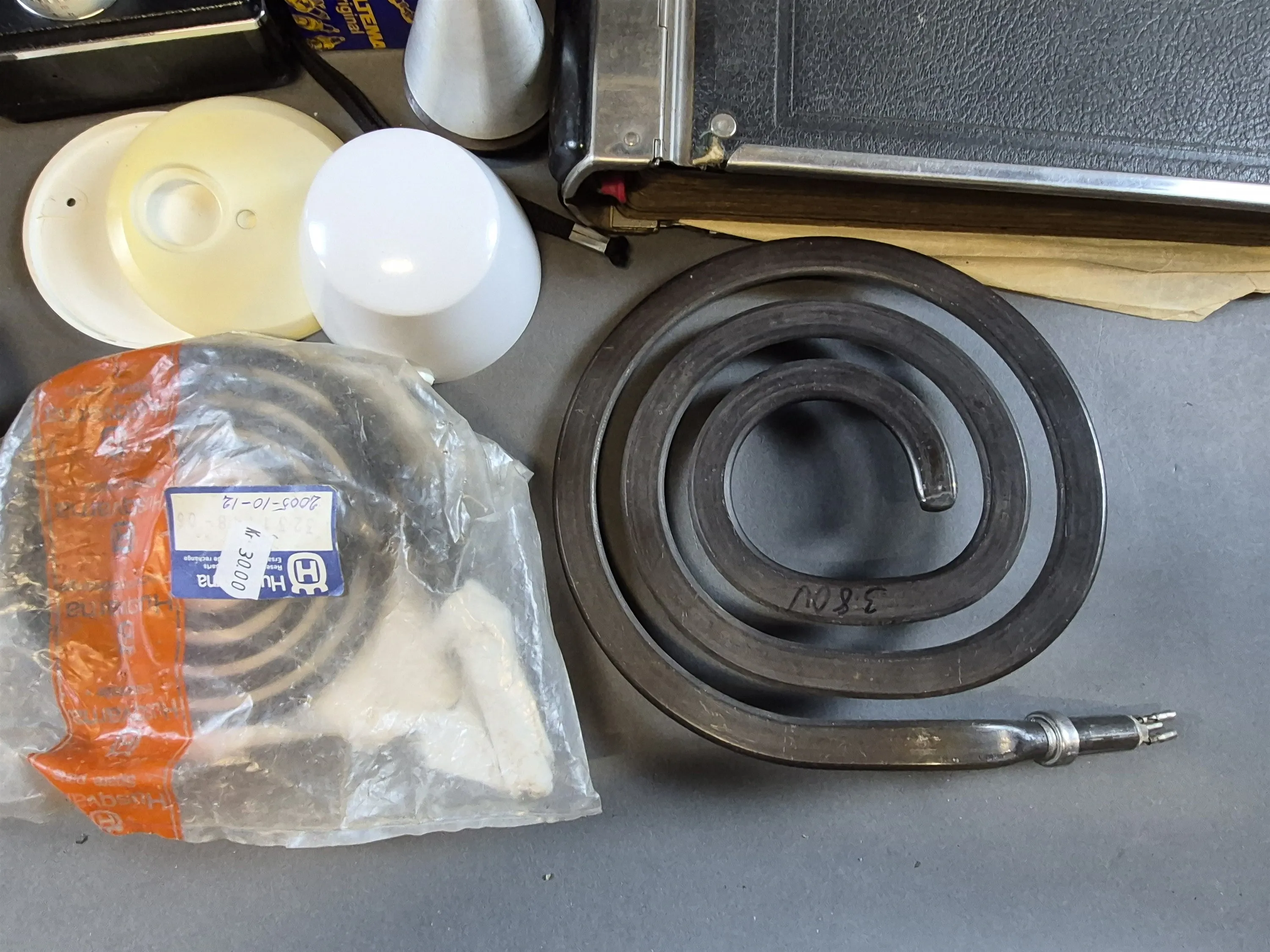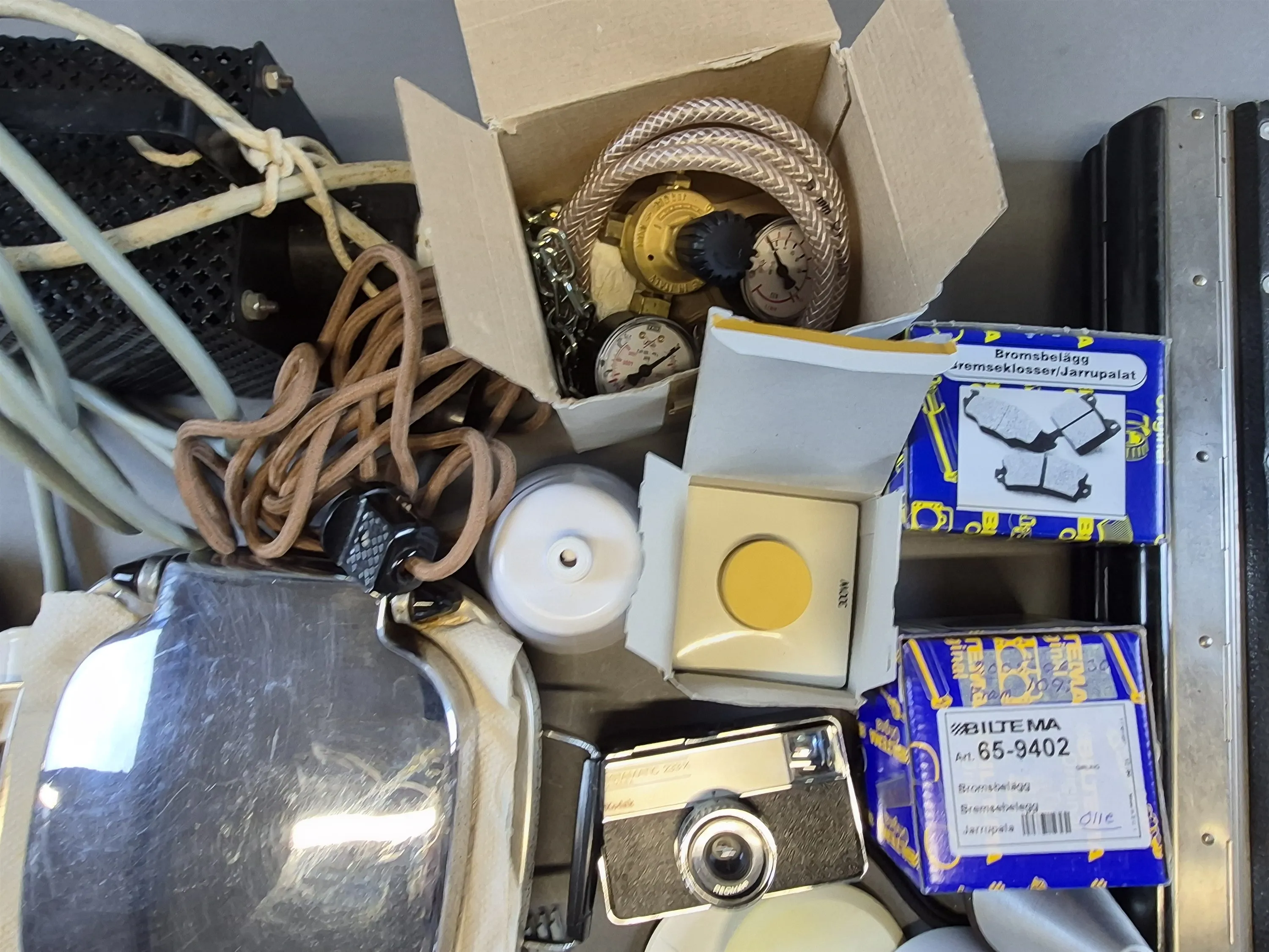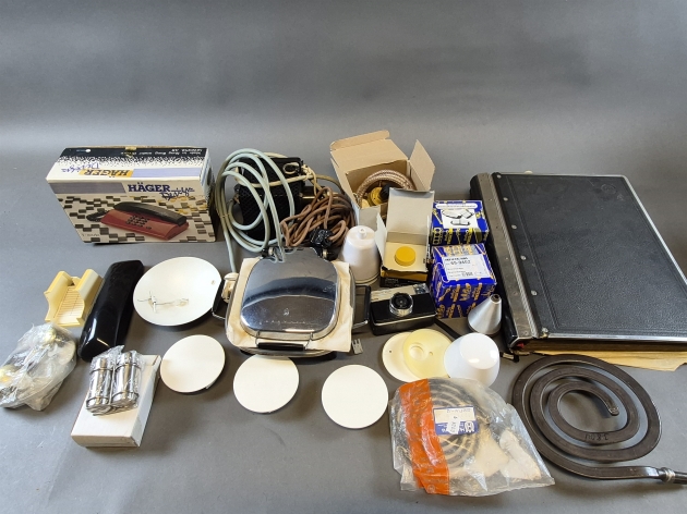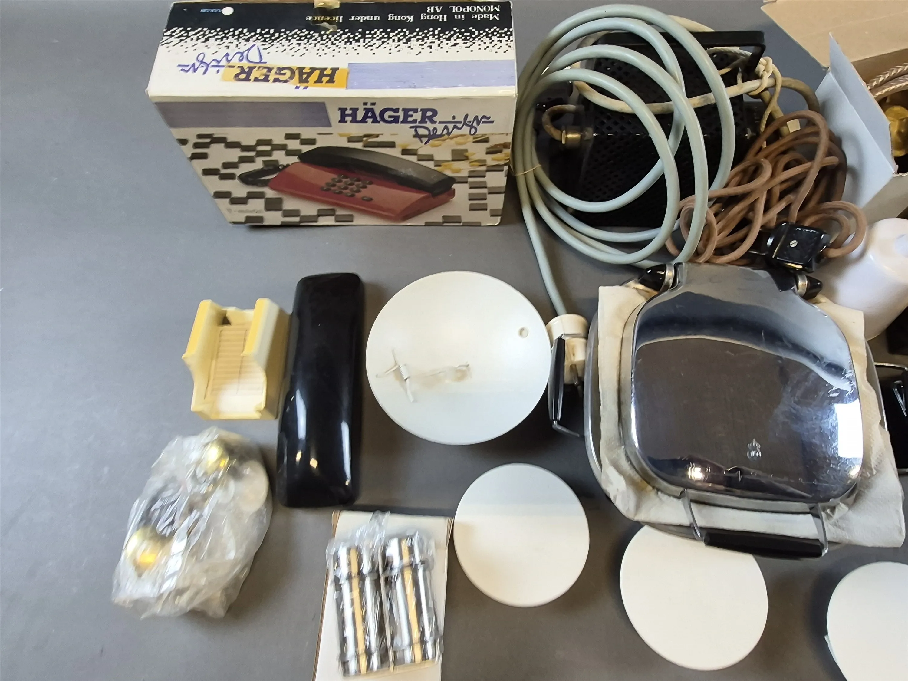 21036. Parti bl.a våffeljärn, arkivpärm, telefon längsta 40 cm