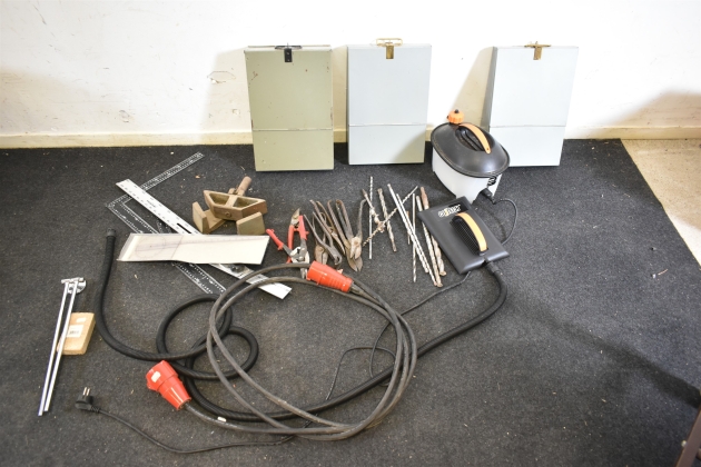 13064. Parti bl.a verktyg, borr & plåtsaxar & bankfackslådor längsta 70 cm