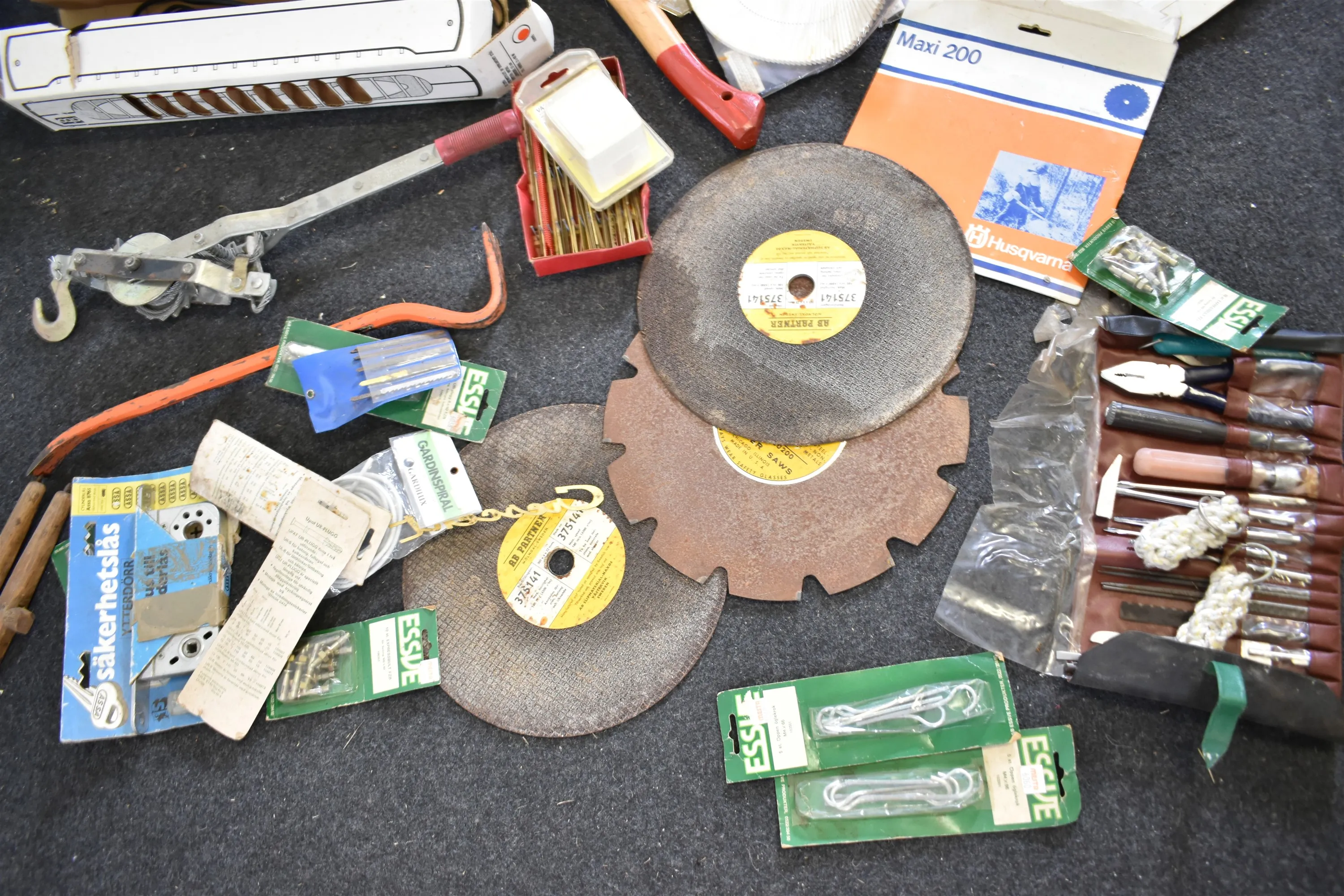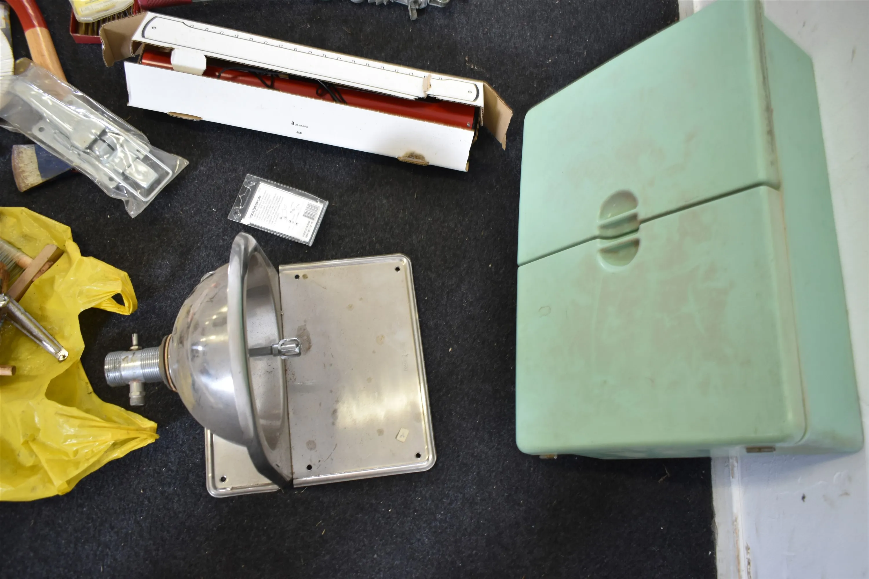 12166. Parti bl.a verktyg, klingor, skåp retro & dricksvattenreservoar