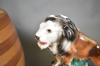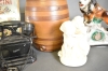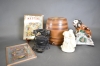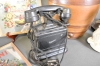 529. Parti bla äldre telefon Ericsson, bordsur "lejon" och keramikkagge, högsta höjd på bild 43 cm