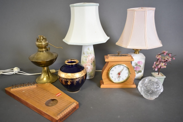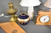 11996. Parti bla bordslampor 2 st, vas Limoges och bordsklocka, högsta höjd 44 cm