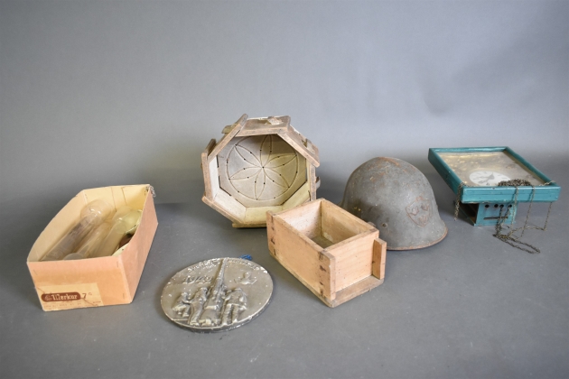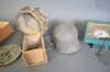 12950. Parti bla brännarglas och militärhjälm, högsta höjd på bild 27 cm