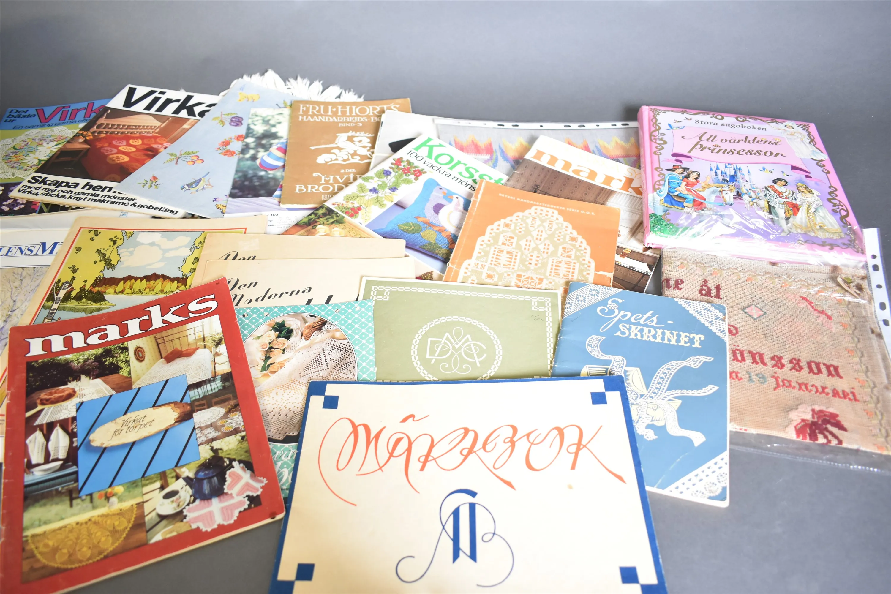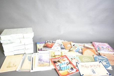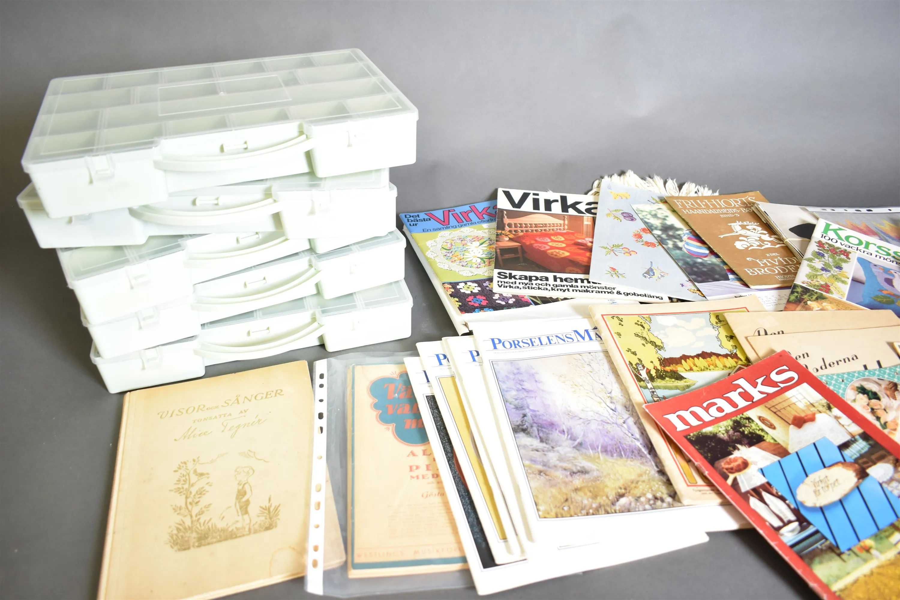 Parti bla förvaringsboxar, böcker hantverksbeskrivningar, mått på boxar 35x26 cm