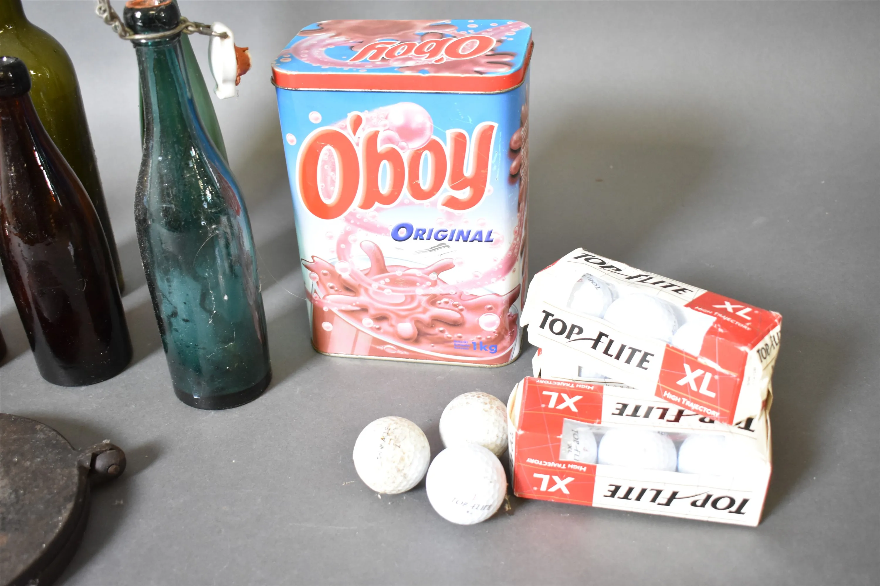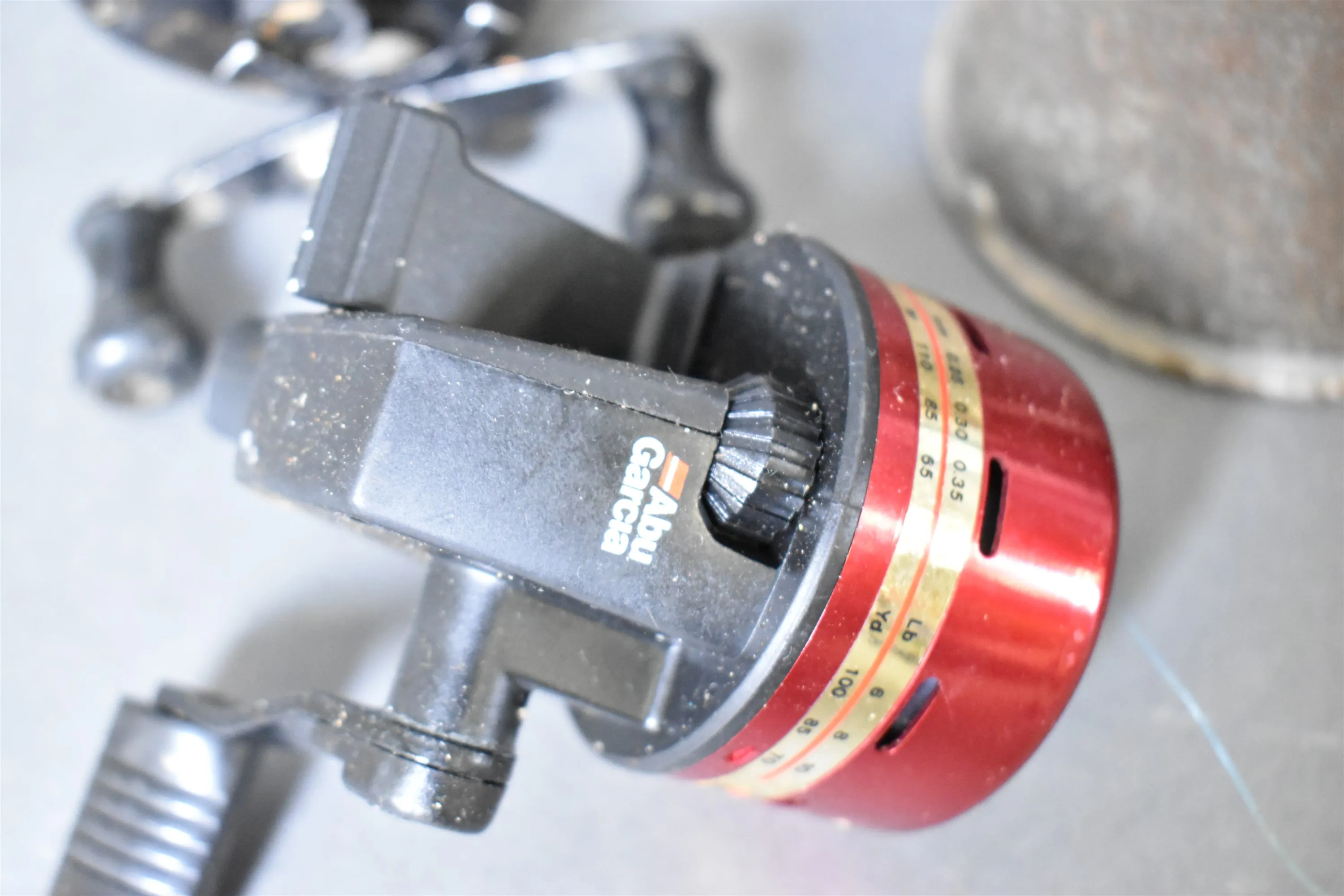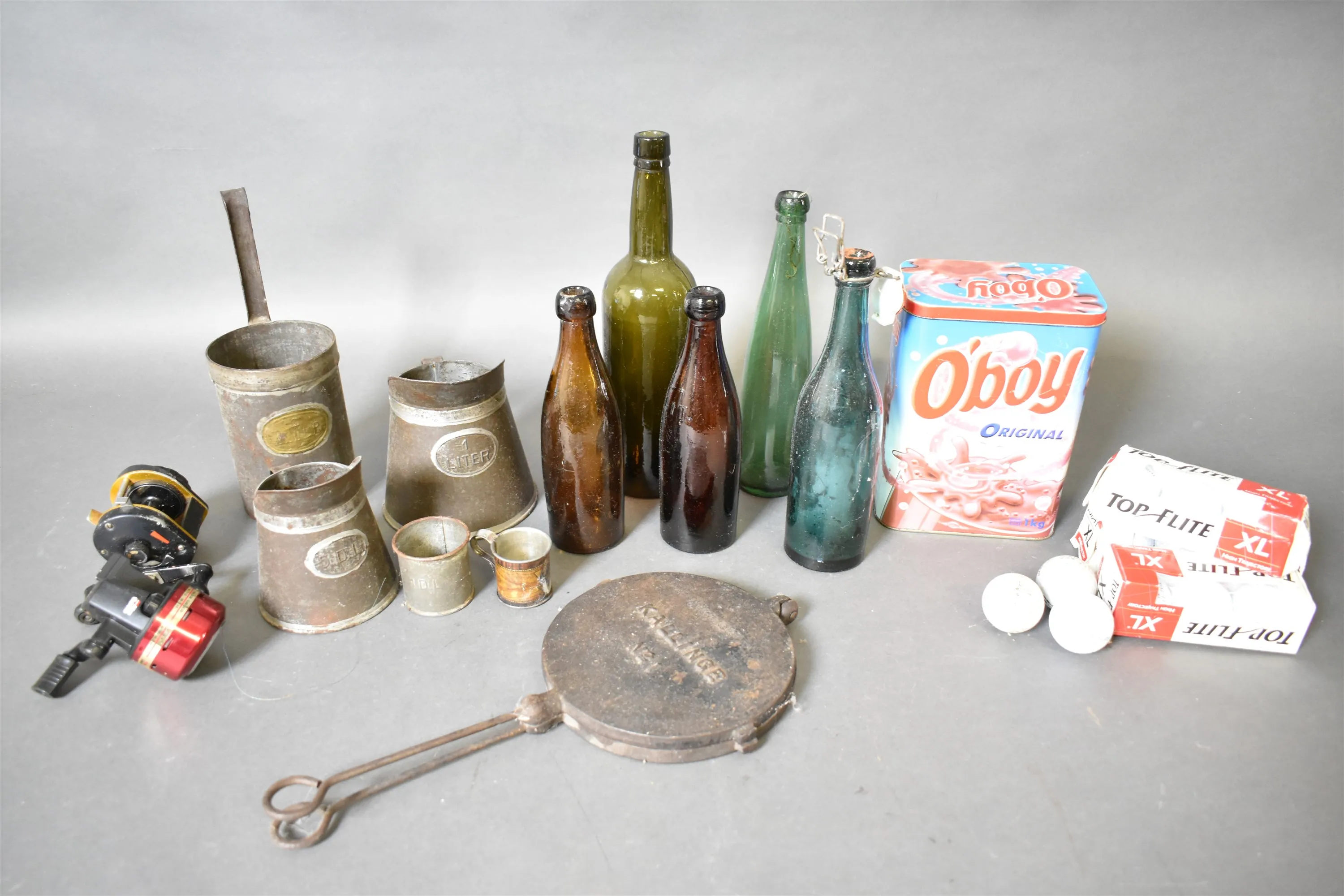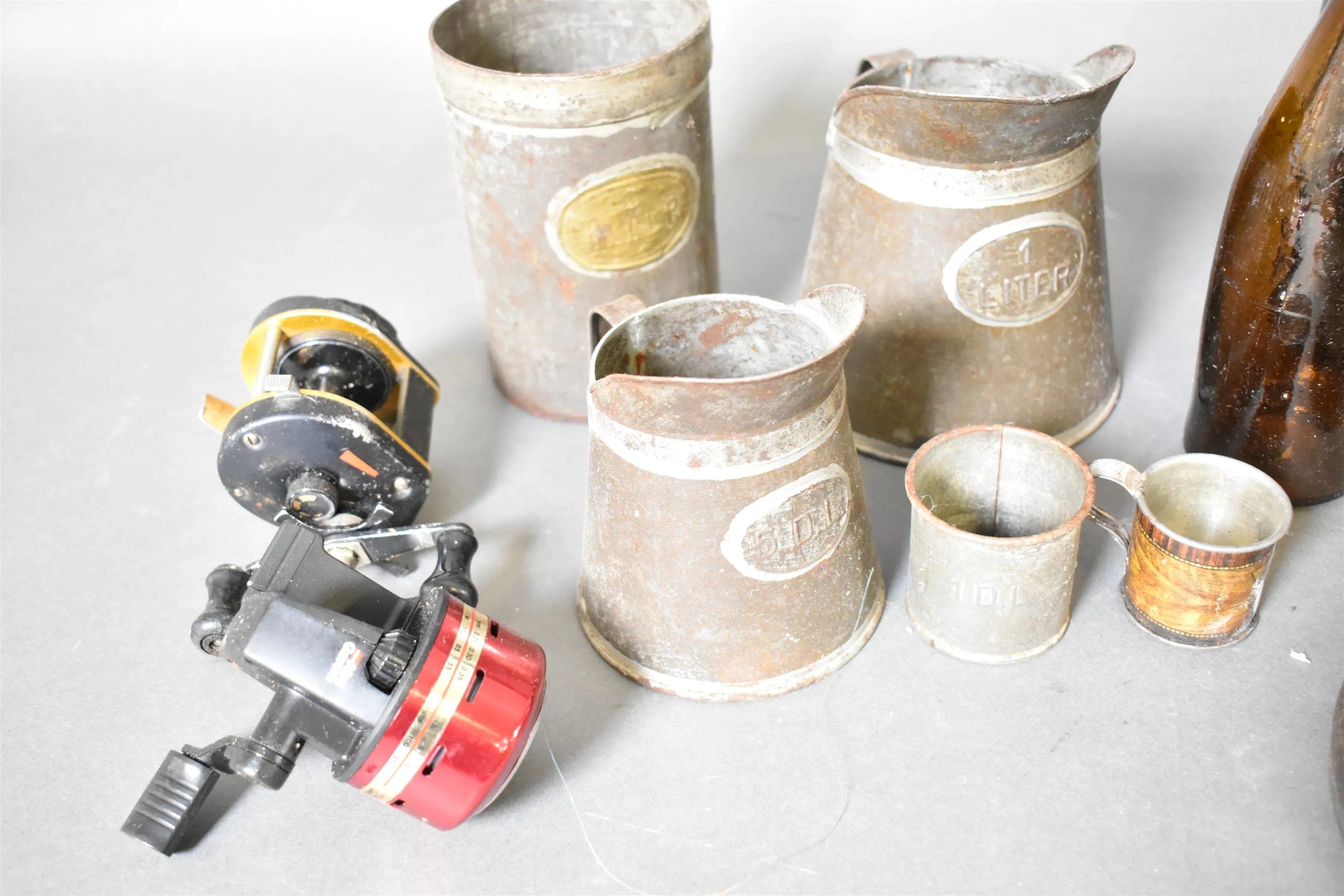 15713. Parti bla fiskerulle Abu, metall och golfbollar, högsta höjd 31 cm