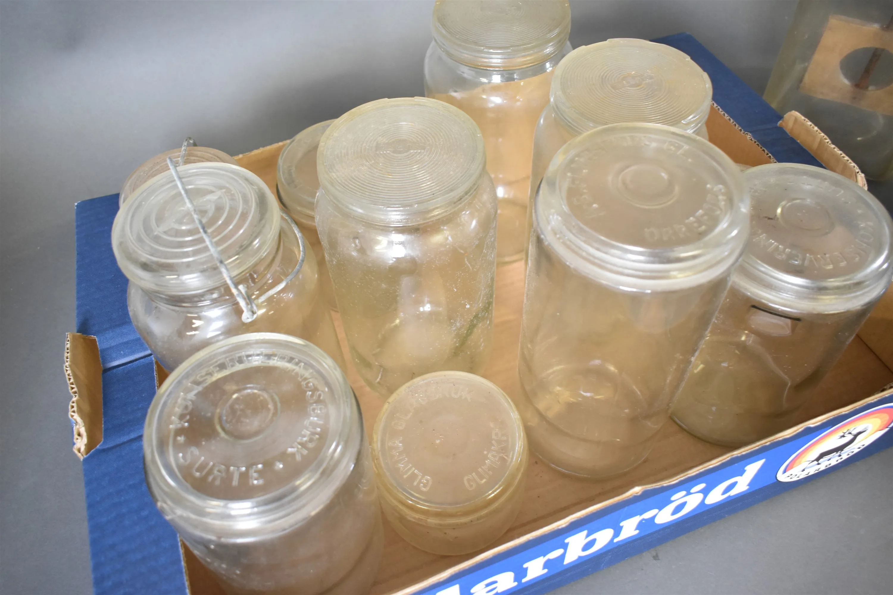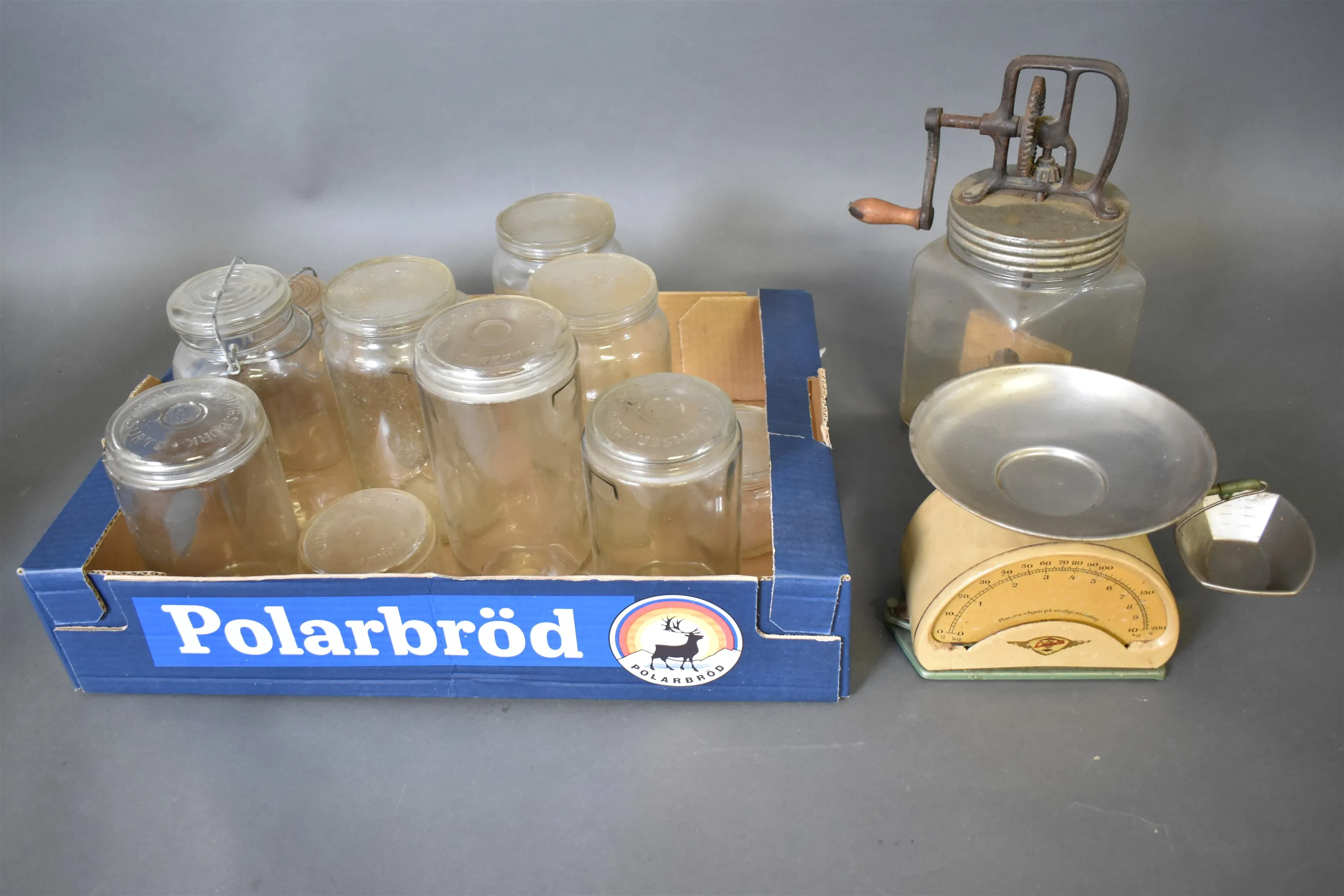 12907. Parti bla köksvåg och glasburkar, högsta höjd 35 cm