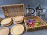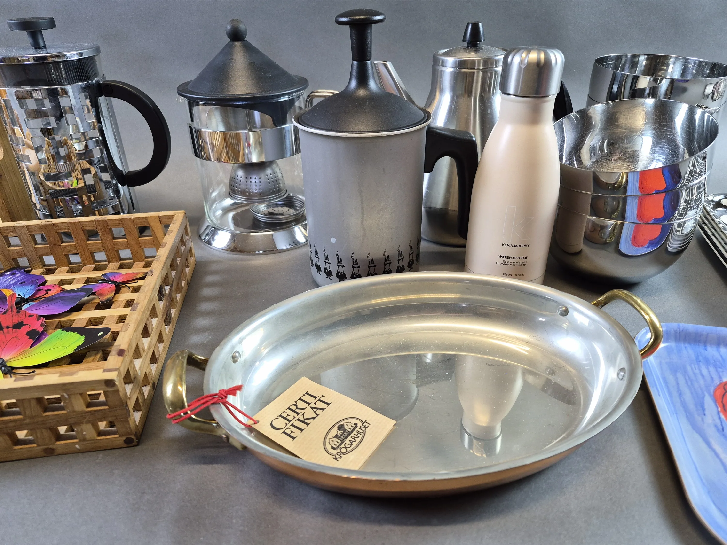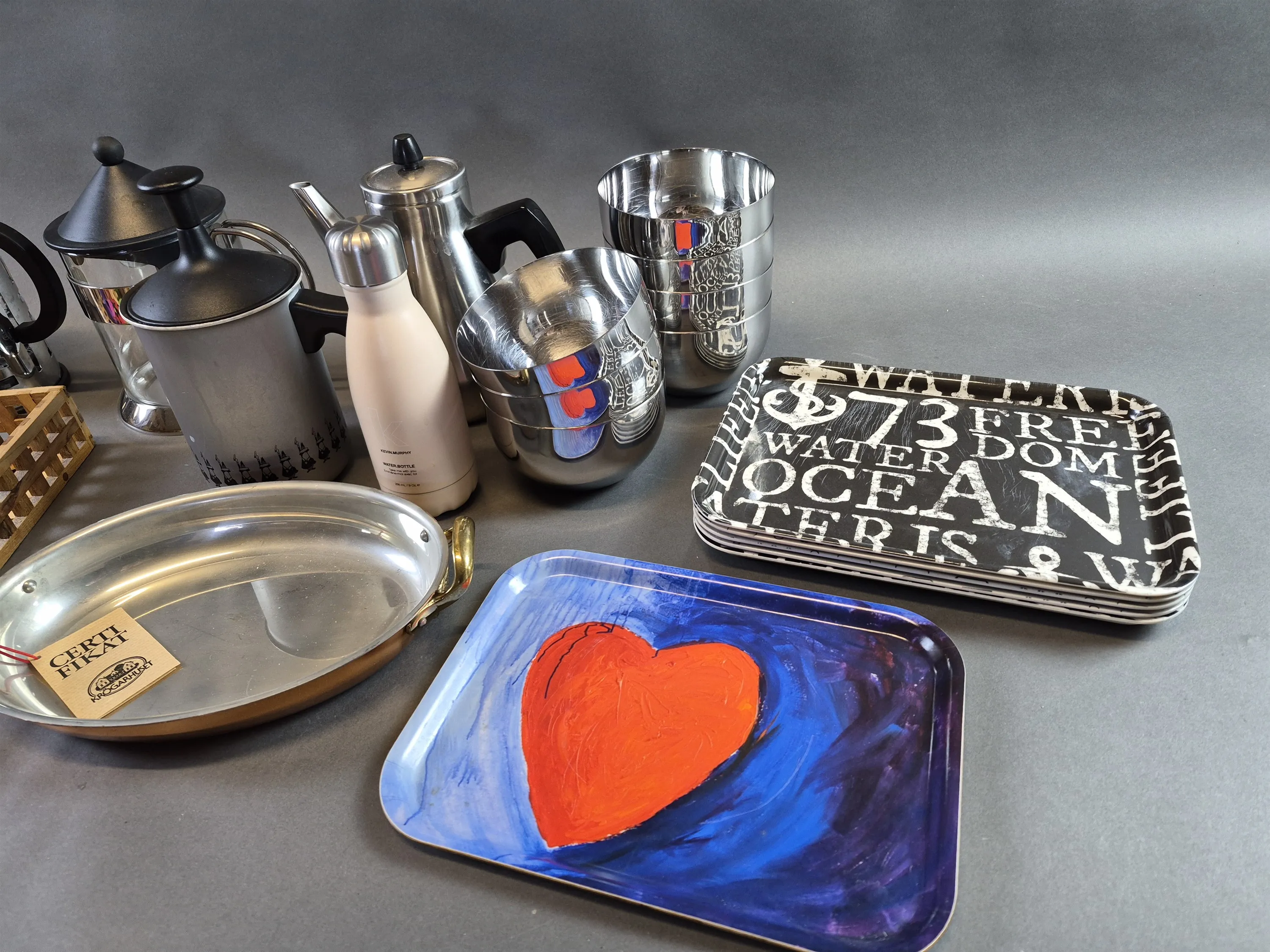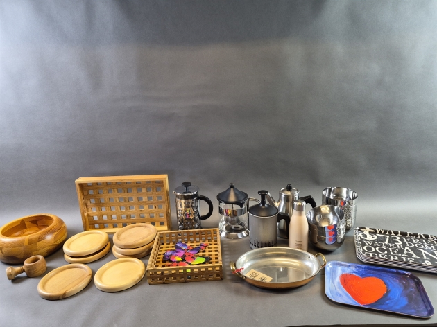 20048. Parti bla kannor, brickor och skålar metall, längsta mått 36 cm