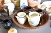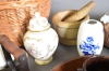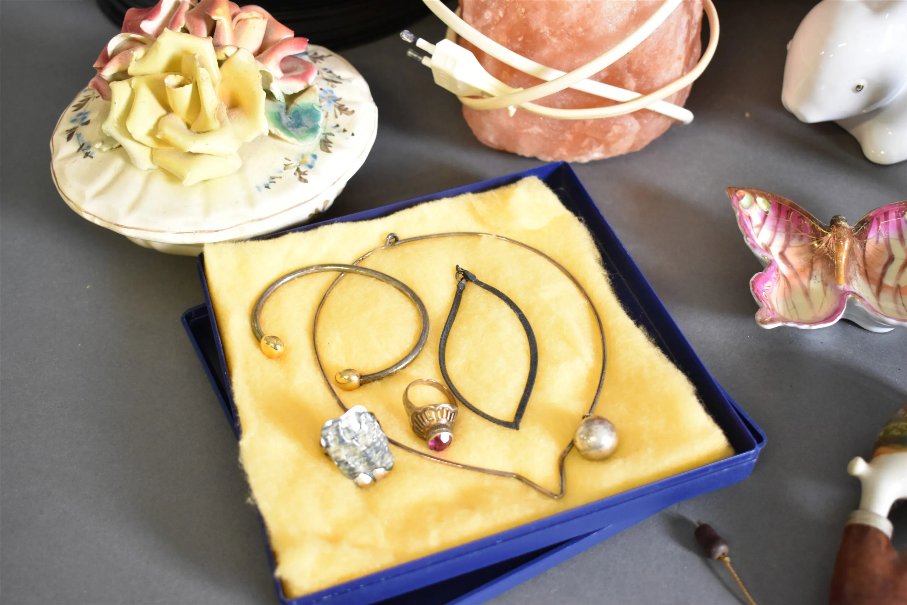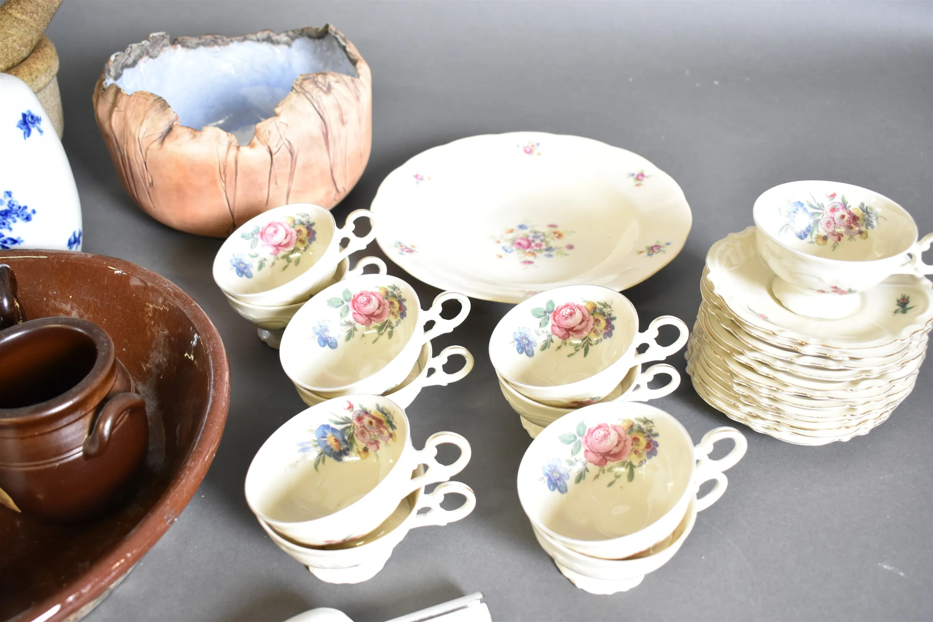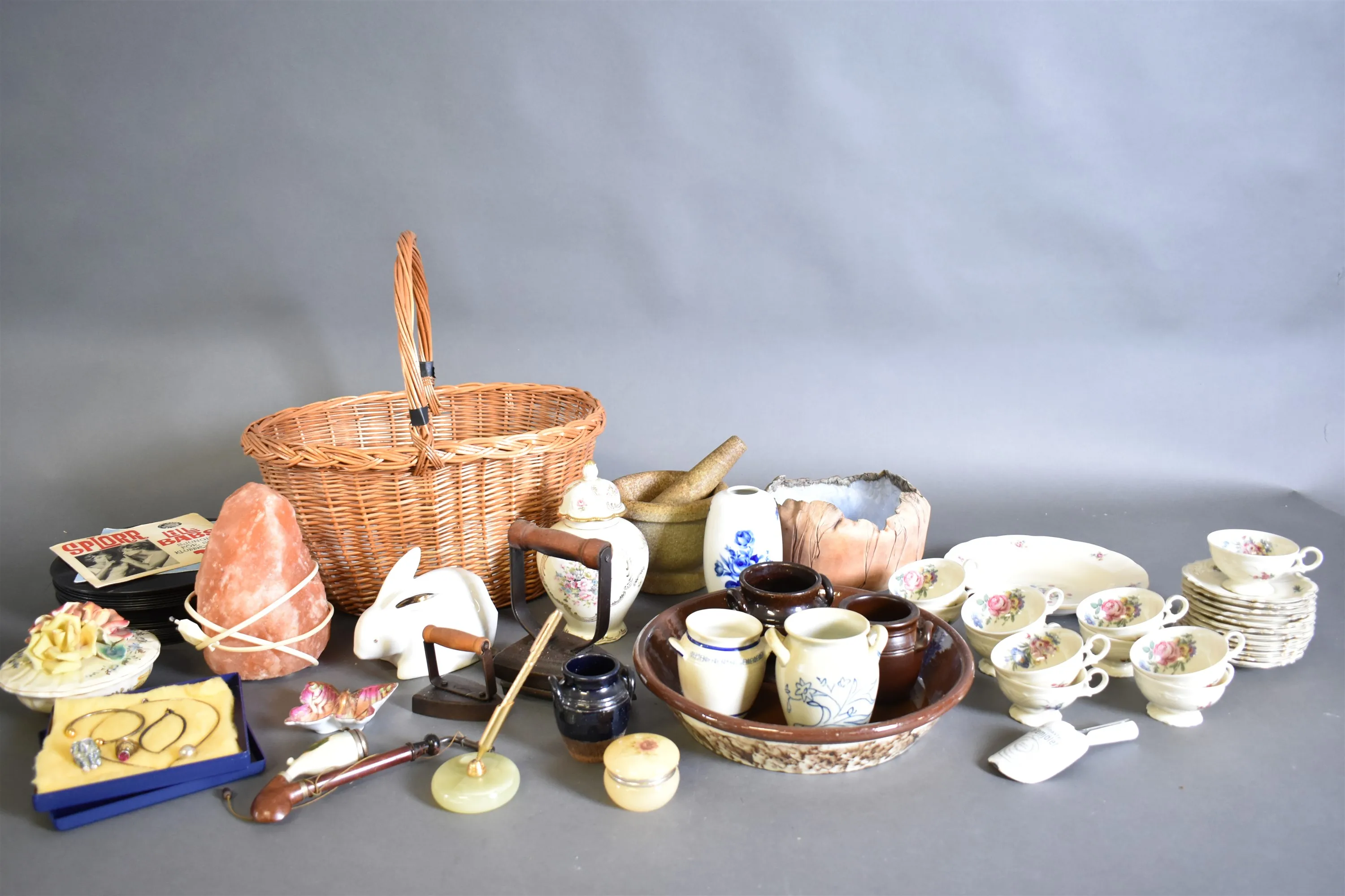 14275. Parti bla korg, koppar med fat och keramik, högsta höjd 45 cm, 2 lådor