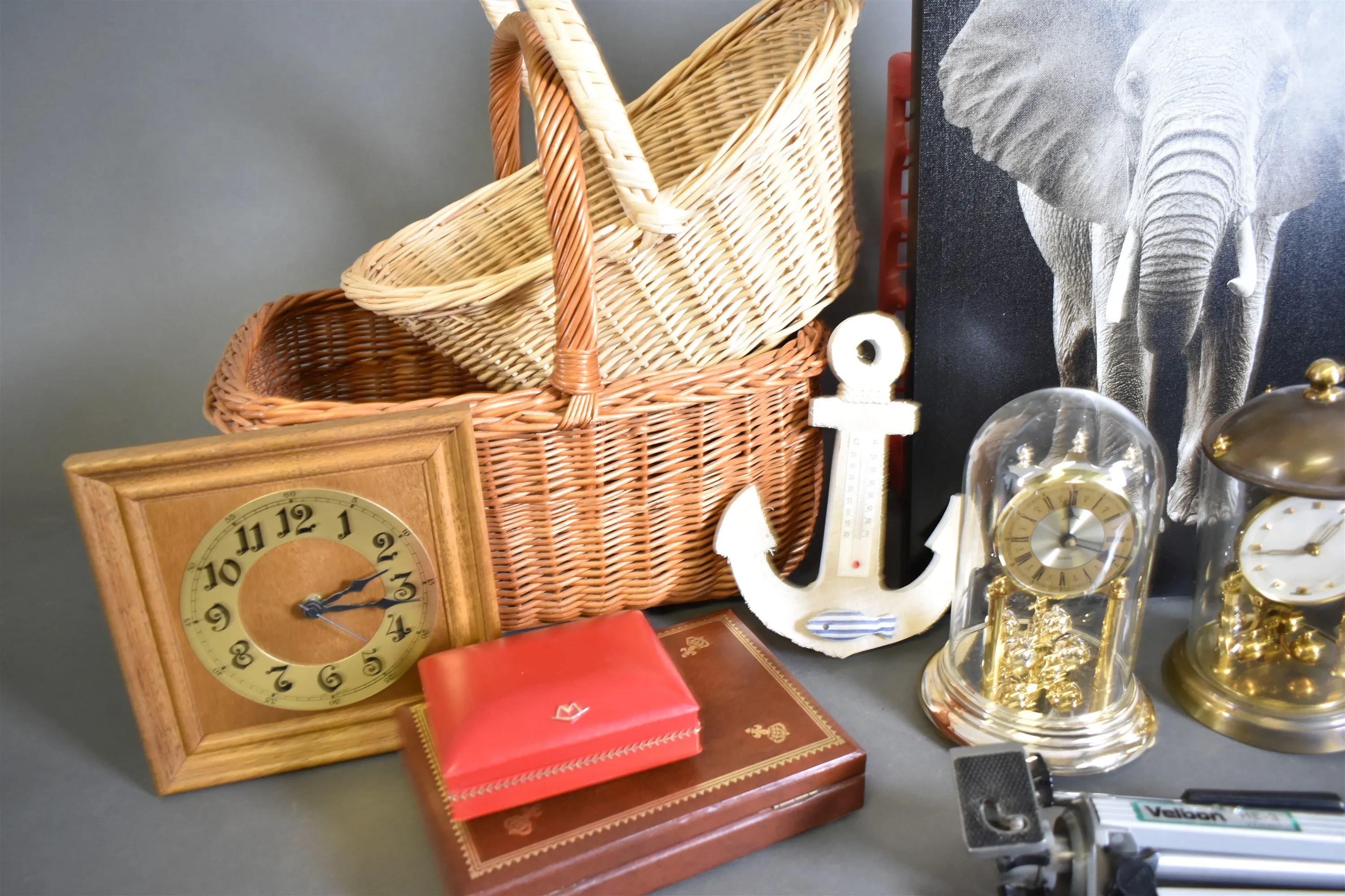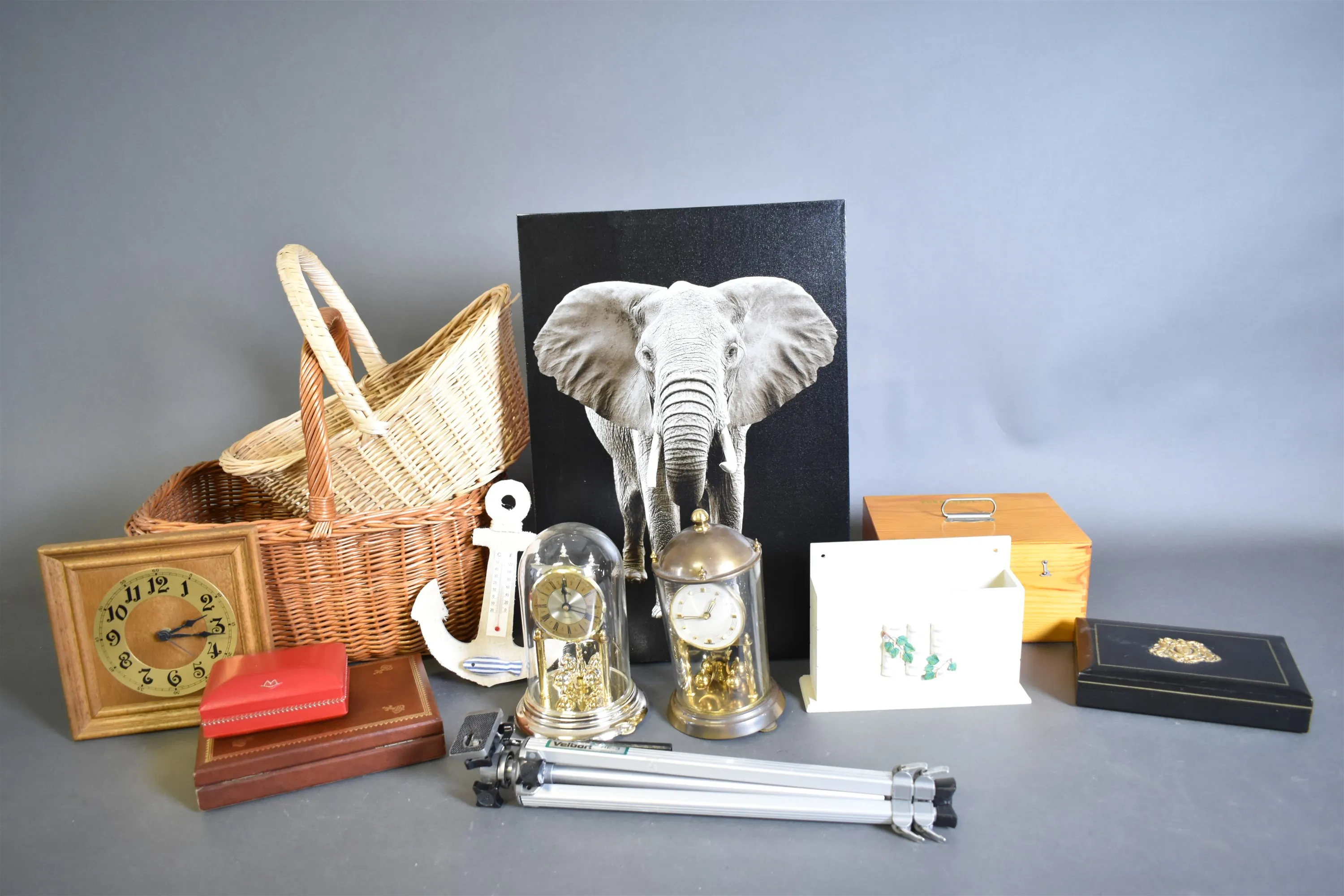 12379. Parti bla korgar, årsur och tavla, högsta höjd 56 cm
