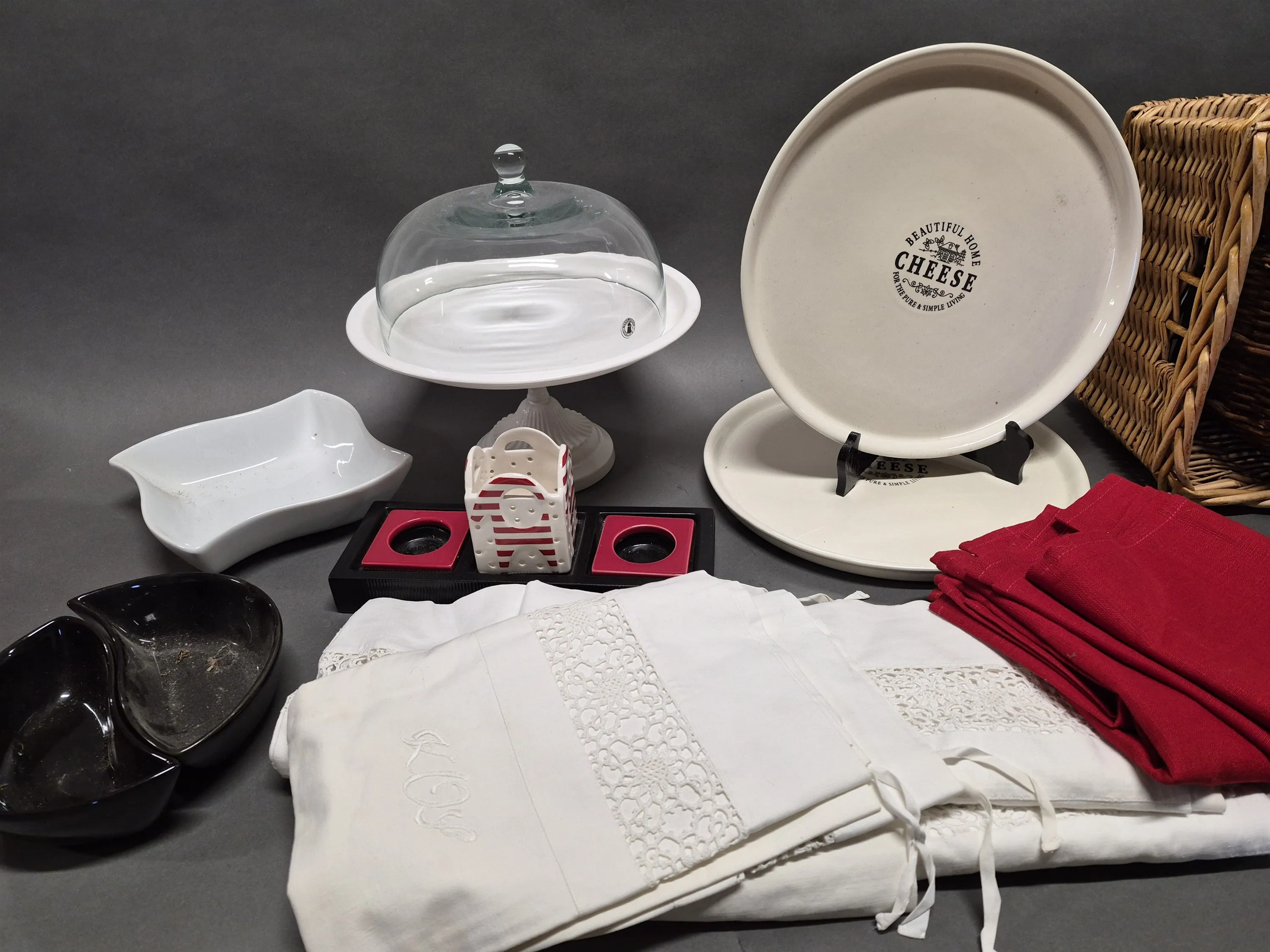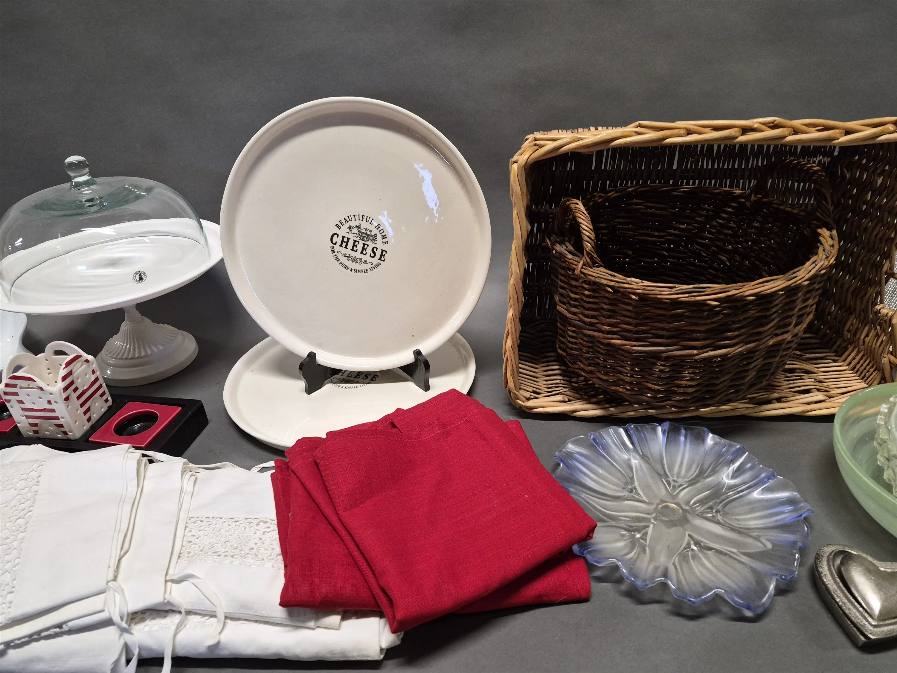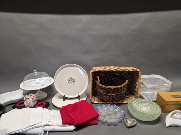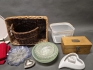 18166. Parti bla korgar, glasskålar och kakfat med kupa, längsta mått 43 cm