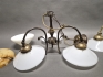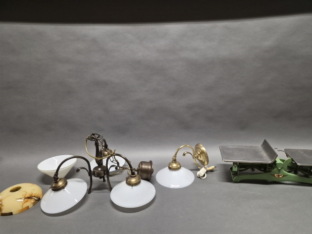 18354. Parti bla lampor med skomakarskärmar och våg Lindells, längsta mått 48 cm