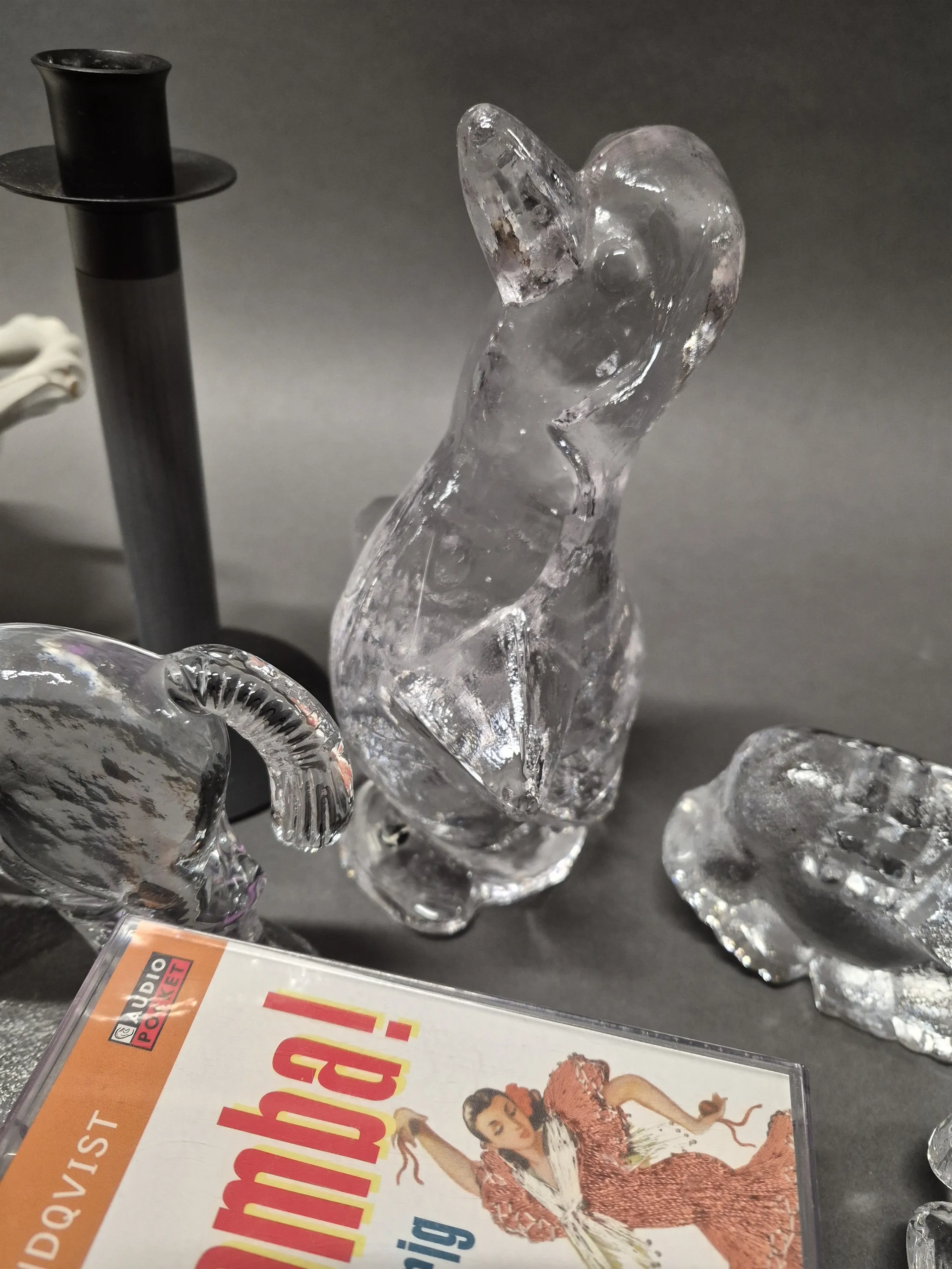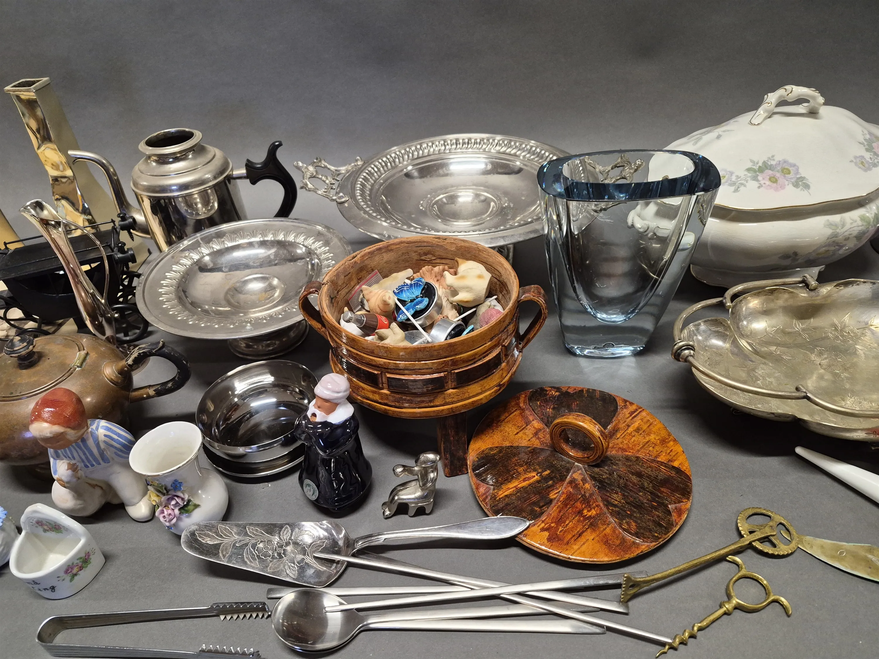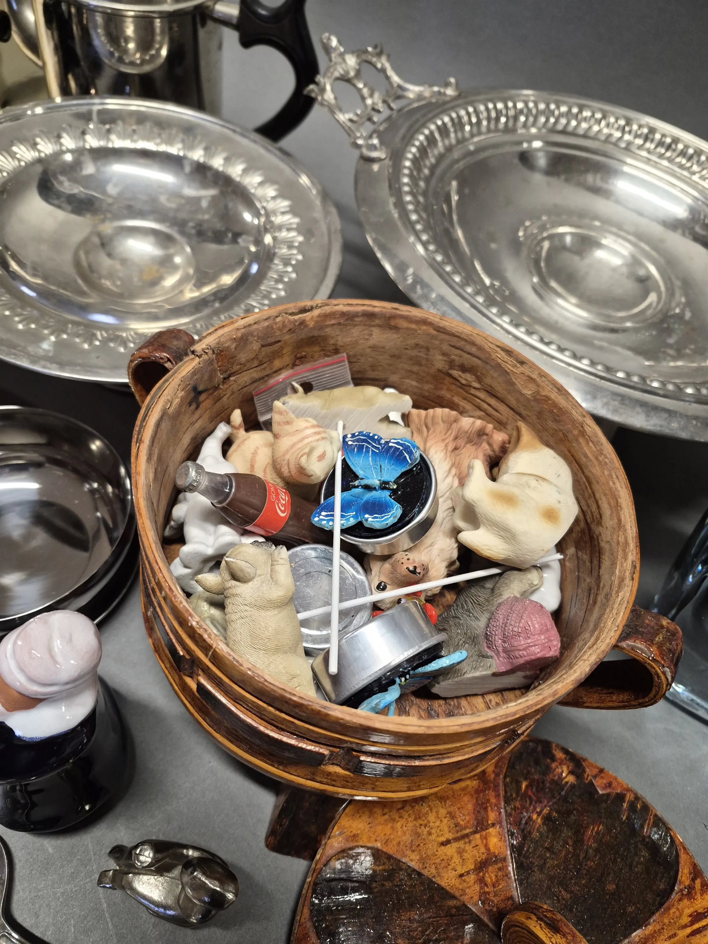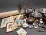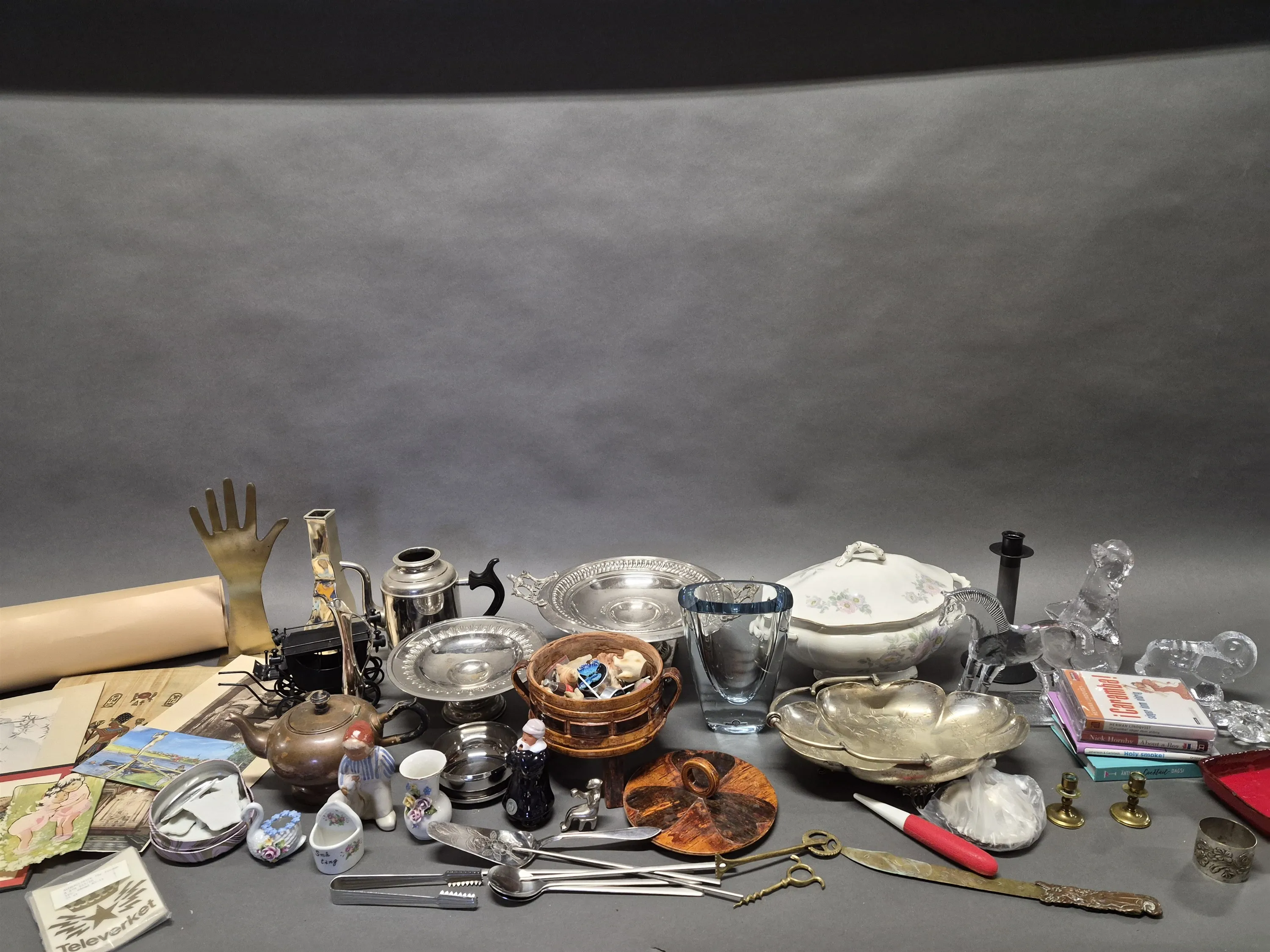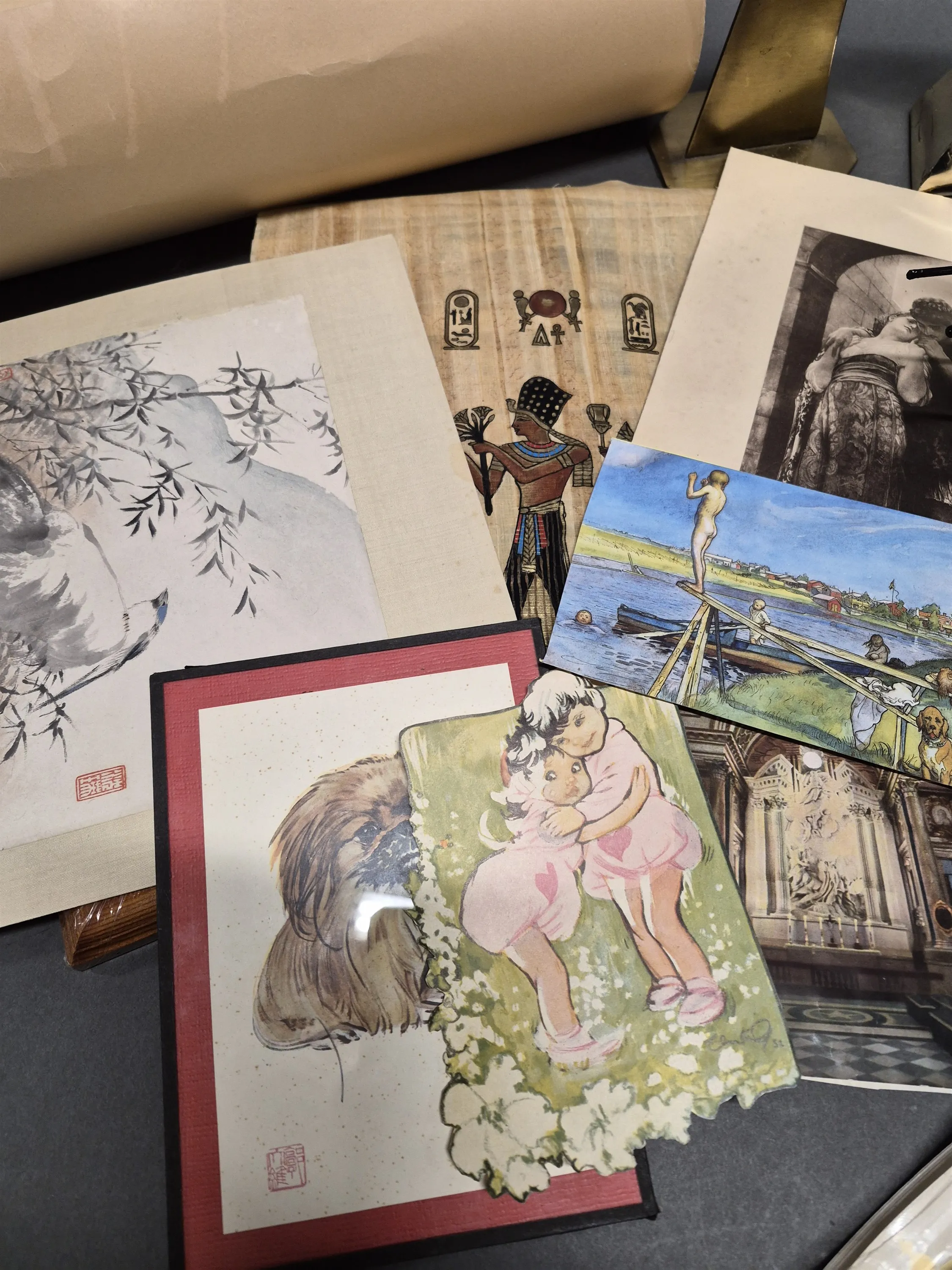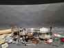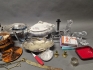 17911. Parti bla metall, glas och konst med asiatiskt motiv, högsta höjd 30 cm, 2 lådor