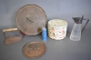 967. Parti bla plåtbukar Svea Choklad & Silvermoon, kopparlock och kanna med nysilverbeslag, högsta höjd på bild 36 cm