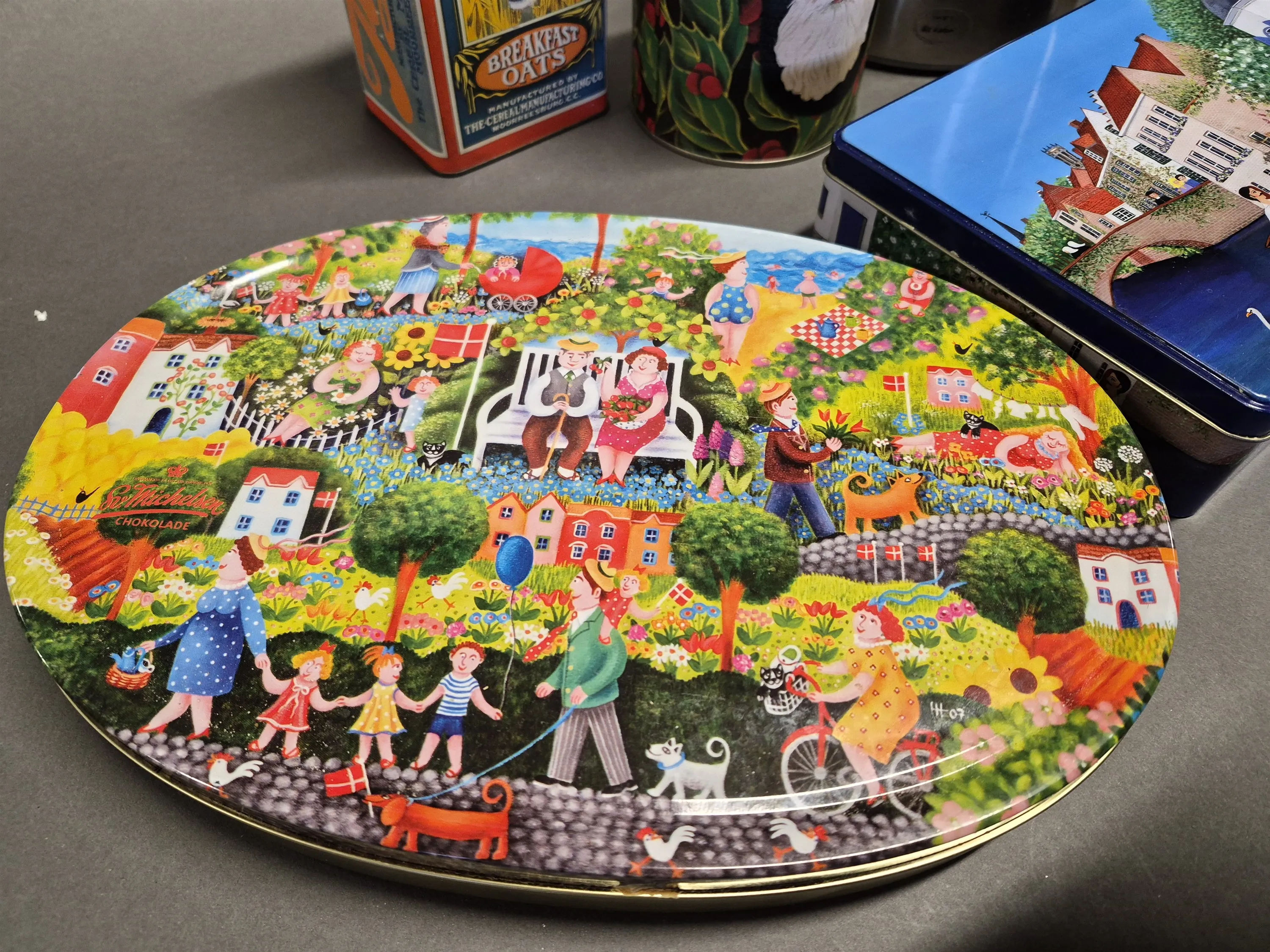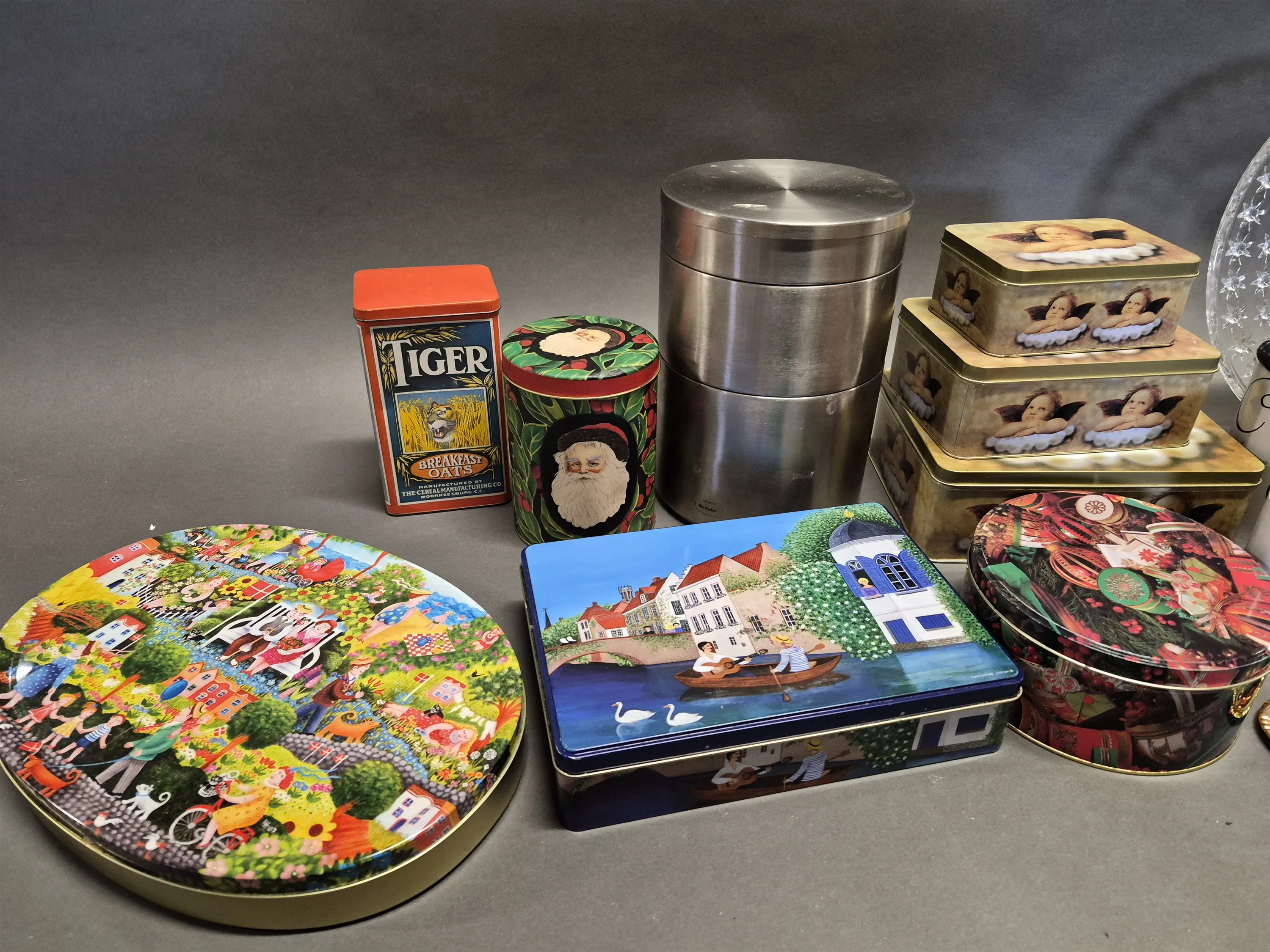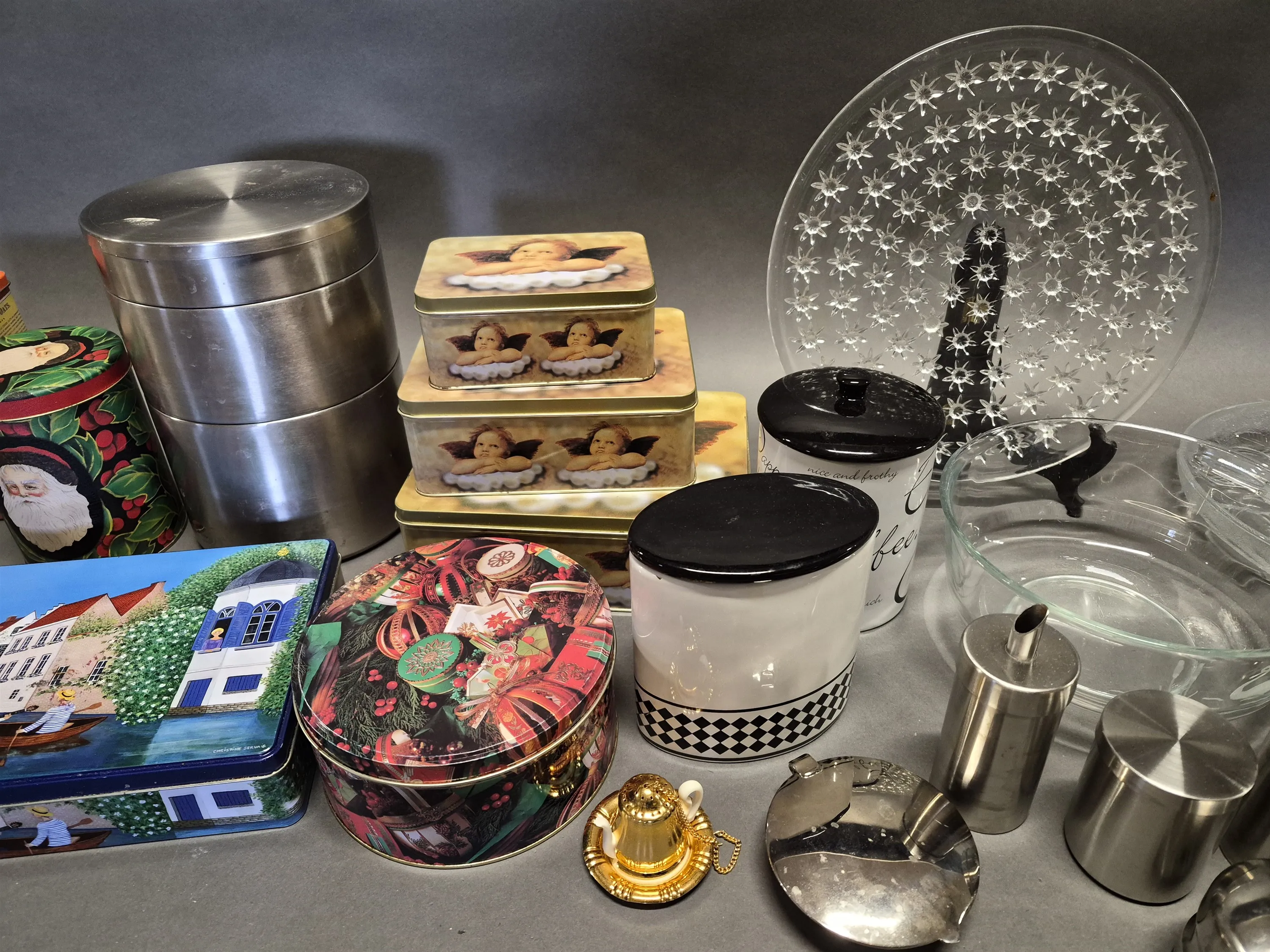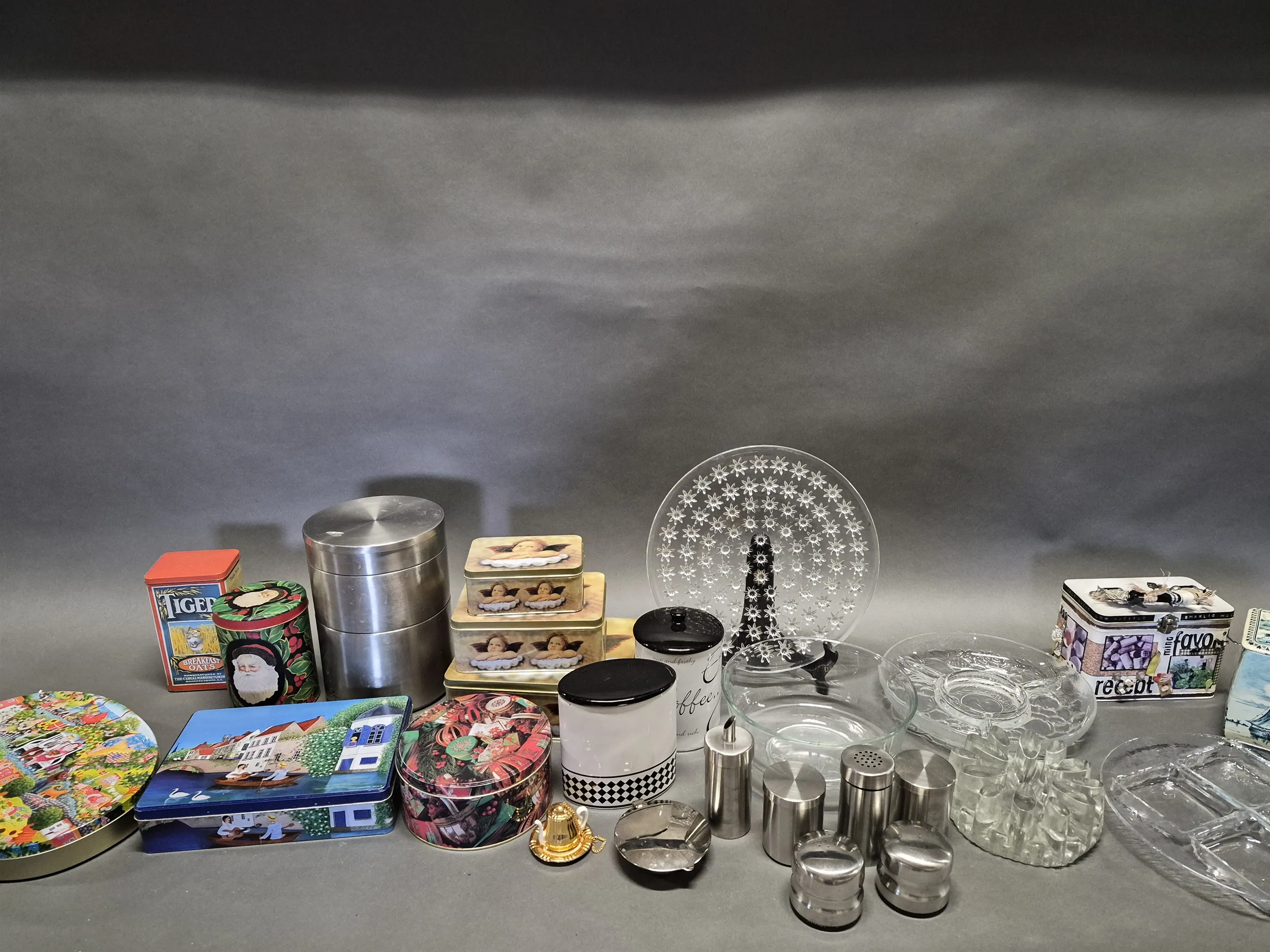 19623. Parti bla plåtburkar, ströare och glas, högsta höjd på bild 34 cm
